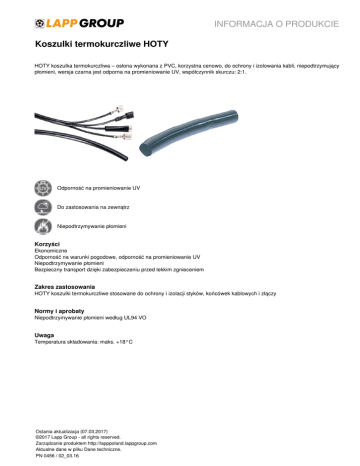 INFORMACJA O PRODUKCIE Koszulki termokurczliwe HOTY HOTY koszulka termokurczliwa – osłona wykonana z PVC, korzystna cenowo, do ochrony i izolowania kabli, niepodtrzymujący płomieni, wersja czarna jest odporna na promieniowanie UV, współczynnik skurczu: 2:1. Odporność na promieniowanie UV Do zastosowania na zewnątrz Niepodtrzymywanie płomieni Korzyści Ekonomiczne Odporność na warunki pogodowe, odporność na promieniowanie UV Niepodtrzymywanie płomieni Bezpieczny transport dzięki zabezpieczeniu przed lekkim zgnieceniem Zakres zastosowania HOTY koszulki termokurczliwe stosowane do ochrony i izolacji styków, końcówek kablowych i złączy Normy i aprobaty Niepodtrzymywanie płomieni według UL94 VO Uwaga Temperatura składowania: maks. +18°C Ostania aktualizacja (07.03.2017) ©2017 Lapp Group - all rights reserved. Zarządzanie produktem http://lapppoland.lappgroup.com Aktualne dane w pliku Dane techniczne. PN 0456 / 02_03.16 INFORMACJA O PRODUKCIE Koszulki termokurczliwe HOTY Dane techniczne Klasyfikacja: ETIM 5.0 Class-ID: EC000217 Opis klasy ETIM 5.0: Koszulka termokurczliwa Info: Współczynnik skurczenia: 2:1 Kolor: Czarny, odporny na działanie promieniowania UV Materiał: PVC Napięcie próbne: Rezystancja dielektryczna: 20 kV/mm Zakres temperatury: Od -20°C do +90°C Temperatura skurczenia +120°C Wskazówka Fotografie nie mogą być używane do wymiarowania oraz nie stanowią szczegółowego odwzorowania przedstawionych produktów. * Podane ceny to ceny netto bez podatku VAT i dodatkowych opłat. Sprzedaż klientom biznesowym. Ostania aktualizacja (07.03.2017) ©2017 Lapp Group - all rights reserved. Zarządzanie produktem http://lapppoland.lappgroup.com Aktualne dane w pliku Dane techniczne. PN 0456 / 02_03.16 Powered by TCPDF (www.tcpdf.org) Opis produktu Średnica wewnętrzna przed obkurczeniem [mm] Zakres kurczenia [mm] Grubość ścianki (+/- 0,1) [mm] 61716700 HOTY 1 2,5 2,5 - 1,2 0,45 61716720 HOTY 2 4 4-2 0,5 61716740 HOTY 3 6 6-3 0,5 61716760 HOTY 4 7 7-4 0,5 61716780 HOTY 6 11 11 - 6 0,6 61716800 HOTY 8 14 14 - 8 0,6 61716820 HOTY 10 17 17 - 10 0,8 61716840 HOTY 13 20 20 - 13 1 61716860 HOTY 16 25 25 - 16 1 61716880 HOTY 20 31 31 - 20 1 Koszulki termokurczliwe HOTY Ostania aktualizacja (07.03.2017) ©2017 Lapp Group - all rights reserved. Zarządzanie produktem http://lapppoland.lappgroup.com Aktualne dane w pliku Dane techniczne. PN 0456 / 02_03.16 INFORMACJA O PRODUKCIE Powered by TCPDF (www.tcpdf.org) Numer katalogowy