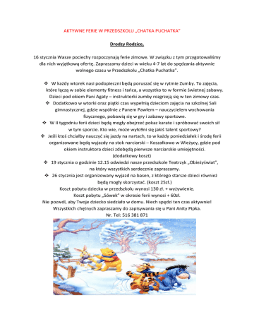 AKTYWNEFERIEWPRZEDSZKOLU„CHATKAPUCHATKA” DrodzyRodzice, 16styczniaWaszepociechyrozpoczynająferiezimowe.Wzwiązkuztymprzygotowaliśmy dlanichwyjątkowąofertę.Zapraszamydzieciwwieku4-7latdospędzaniaaktywnie wolnegoczasuwPrzedszkolu„ChatkaPuchatka”. v WkażdywtoreknasipodopiecznibędąporuszaćsięwrytmieZumby.Tozajęcia, którełącząwsobieelementyfitnessitańca,awszystkotowformieświetnejzabawy. DziecipodokiemPaniAgaty–instruktorkizumbyrozgrzejąsięwtenzimowyczas. v DodatkowowwtorkiorazpiątkiczaswypełniądzieciomzajęcianaszkolnejSali gimnastycznej,gdziewspólniezPanemPawłem–nauczycielemwychowania fizycznego,pobawiąsięwgryizabawysportowe. v WIItygodniuferiidziecibędąmogłyobejrzećpokazkarateispróbowaćswoichsił wtymsporcie.Ktowie,możewyło9nisięjakiśtalentsportowy? v Jeśliktośchciałbynauczyćsięjazdynanartach,towkażdyponiedziałekiśrodęferii organizowanebędąwyjazdynastoknarciarski–KoszałkowowWieżycy,gdziepod okieminstruktoradziecizdobędąpierwszenarciarskieumiejętności. (dodatkowykoszt) v 19styczniaogodzinie12.15odwiedzinaszeprzedszkoleTeatrzyk„Obieżyświat”, naktórywszystkichserdeczniezapraszamy. v 26styczniajestorganizowanywyjazdnabasen,zktóregostarszedziecirównież będąmogłyskorzystać.(koszt25zł.) Kosztpobytudzieckawprzedszkoluwynosi130zł.+wyżywienie. Kosztpobytu„Sówek”wokresieferiiwynosi+60zł. Niepozwól,abyTwojedzieckosiedziałowdomu.Niechspędzitenczasaktywnie! WszystkichchętnychzapraszamydozapisywaniasięuPaniAnityPipka. Nr.Tel:516381871