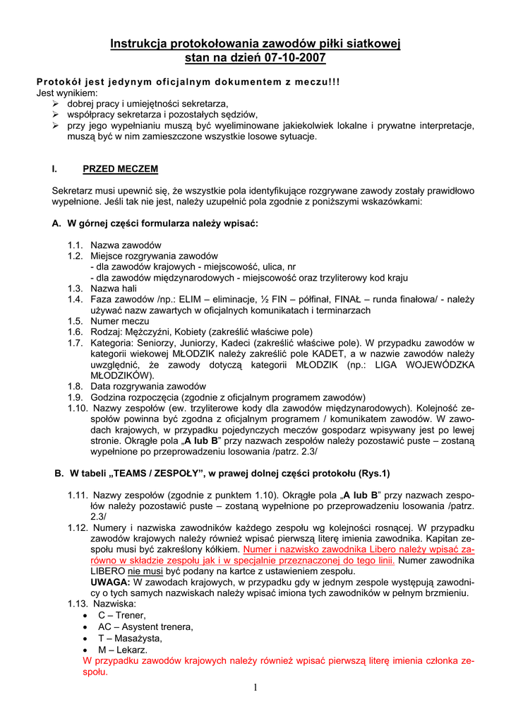 Instrukcja protokołowania zawodów piłki siatkowej stan na dzień 07-10-2007 Protokół jest jedynym oficjalnym dokumentem z meczu!!! Jest wynikiem: ¾ dobrej pracy i umiejętności sekretarza, ¾ współpracy sekretarza i pozostałych sędziów, ¾ przy jego wypełnianiu muszą być wyeliminowane jakiekolwiek lokalne i prywatne interpretacje, muszą być w nim zamieszczone wszystkie losowe sytuacje. I. PRZED MECZEM Sekretarz musi upewnić się, że wszystkie pola identyfikujące rozgrywane zawody zostały prawidłowo wypełnione. Jeśli tak nie jest, należy uzupełnić pola zgodnie z poniższymi wskazówkami: A. W górnej części formularza należy wpisać: 1.1. Nazwa zawodów 1.2. Miejsce rozgrywania zawodów - dla zawodów krajowych - miejscowość, ulica, nr - dla zawodów międzynarodowych - miejscowość oraz trzyliterowy kod kraju 1.3. Nazwa hali 1.4. Faza zawodów /np.: ELIM – eliminacje, ½ FIN – półfinał, FINAŁ – runda finałowa/ - należy używać nazw zawartych w oficjalnych komunikatach i terminarzach 1.5. Numer meczu 1.6. Rodzaj: Mężczyźni, Kobiety (zakreślić właściwe pole) 1.7. Kategoria: Seniorzy, Juniorzy, Kadeci (zakreślić właściwe pole). W przypadku zawodów w kategorii wiekowej MŁODZIK należy zakreślić pole KADET, a w nazwie zawodów należy uwzględnić, że zawody dotyczą kategorii MŁODZIK (np.: LIGA WOJEWÓDZKA MŁODZIKÓW). 1.8. Data rozgrywania zawodów 1.9. Godzina rozpoczęcia (zgodnie z oficjalnym programem zawodów) 1.10. Nazwy zespołów (ew. trzyliterowe kody dla zawodów międzynarodowych). Kolejność zespołów powinna być zgodna z oficjalnym programem / komunikatem zawodów. W zawodach krajowych, w przypadku pojedynczych meczów gospodarz wpisywany jest po lewej stronie. Okrągłe pola „A lub B” przy nazwach zespołów należy pozostawić puste – zostaną wypełnione po przeprowadzeniu losowania /patrz. 2.3/ B. W tabeli „TEAMS / ZESPOŁY”, w prawej dolnej części protokołu (Rys.1) 1.11. Nazwy zespołów (zgodnie z punktem 1.10). Okrągłe pola „A lub B” przy nazwach zespołów należy pozostawić puste – zostaną wypełnione po przeprowadzeniu losowania /patrz. 2.3/ 1.12. Numery i nazwiska zawodników każdego zespołu wg kolejności rosnącej. W przypadku zawodów krajowych należy również wpisać pierwszą literę imienia zawodnika. Kapitan zespołu musi być zakreślony kółkiem. Numer i nazwisko zawodnika Libero należy wpisać zarówno w składzie zespołu jak i w specjalnie przeznaczonej do tego linii. Numer zawodnika LIBERO nie musi być podany na kartce z ustawieniem zespołu. UWAGA: W zawodach krajowych, w przypadku gdy w jednym zespole występują zawodnicy o tych samych nazwiskach należy wpisać imiona tych zawodników w pełnym brzmieniu. 1.13. Nazwiska: • C – Trener, • AC – Asystent trenera, • T – Masażysta, • M – Lekarz. W przypadku zawodów krajowych należy również wpisać pierwszą literę imienia członka zespołu. 1 1.14. Podpisy kapitanów zespołów (po zweryfikowaniu zapisów wg punktów 1.11-1.13) 1.15. Podpisy trenerów (po zweryfikowaniu zapisów wg punktów 1.11-1.13) Rys. 1 C. W dolnej części formularza, w rubryce „APPROVAL / POTWIERDZENIE” (Rys.2), należy wpisać: w zawodach międzynarodowych, nazwiska i trzyliterowe kody krajów: 1.16. sędziego pierwszego, 1.17. sędziego drugiego, 1.18. sekretarza, 1.19. asystenta sekretarza, 1.20. sędziów liniowych (tylko nazwiska – bez kodu kraju). W zawodach krajowych, nazwiska, imiona oraz klasy sędziowskie (np. M, P, Z, I itd.) : 1.21. sędziego pierwszego, 1.22. sędziego drugiego, 1.23. sekretarza, 1.24. asystenta sekretarza (jeśli został wyznaczony), 1.25. sędziów liniowych (tylko nazwiska). Podczas zawodów krajowych imię i nazwisko sędziego głównego / kwalifikatora należy wpisać w rubryce „REMARKS / UWAGI”. 2 Rys. 2 II. PO LOSOWANIU Po losowaniu lecz przed rozpoczęciem meczu, sekretarz musi uzyskać następujące informacje: 2.1. Od sędziego pierwszego: a). po których stronach boiska zespoły rozpoczną mecz, b). nazwę zespołu, który będzie pierwszy zagrywał. 2.2. Od sędziego drugiego, kartki z ustawieniami początkowymi zespołów w pierwszym secie (Rys.3) SET 1 R–5 Ustawienie LIBERO początkowe NR Zespół ORKAN NISKO IV III II 13 4 7 V VI I 11 6 10 Podpis trenera Rys. 3 2.3. Po otrzymaniu powyższych informacji sekretarz postępuje następująco: a). W górnej części pola (Rys.4) zatytułowanego SET 1 wpisuje nazwy zespołów lub kody krajów, zgodnie ze stronami boiska, po których zespoły rozpoczną pierwszego seta („A” – zespół po lewej stronie, „B” – zespół po prawej stronie sekretarza). Zakreśla poprzez postawienie znaku ✘ pole z literą ⓢ po stronie zespołu, który będzie zagrywał pierwszy oraz pole z literą Ⓡ po stronie zespołu odbierającego pierwszą zagrywkę. Odpowiednio uzupełnia literami A i B przeznaczone do tego pola: w górnej części protokołu - w polu Nazwy zespołów (patrz punkt 1.10), w tabeli znajdującej się w prawej, dolnej części protokołu (patrz punkt 1.11). 3 Rys. 4 b). W górnej części pola SET 2, po prawej stronie wpisuje nazwę zespołu A, a po lewej stronie nazwę zespołu B. Następnie poprzez postawienie znaku ✘ zakreśla pole z literą ⓢ po stronie zespołu, który set pierwszy rozpoczynał od przyjęcia zagrywki i odwrotnie, c). Poniżej pola SET 1 znajduje się pole SET 3. Zapisów w tym polu należy dokonać w porządku zgodnym z zapisami w polu SET 1. d). W przypadku rozgrywania seta czwartego, zapisów w polu SET 4 należy dokonać w porządku odpowiadającym zapisom seta drugiego. 2.4. Przed rozpoczęciem każdego seta, po otrzymaniu kartek z ustawieniem od sędziego drugiego, sekretarz postępuje następująco (patrz. Rys.4): W rubrykach znajdujących się pod polami oznaczonymi rzymskimi cyframi I – VI, w linii „Zawodnicy podstawowi / Starting players” wpisuje numery zawodników