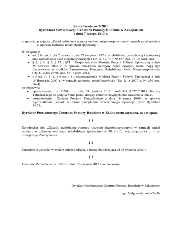 Zarządzenie nr 2/2013 Dyrektora Powiatowego Centrum Pomocy Rodzinie w Zakopanem z dnia 7 lutego 2013 r. w sprawie: przyjęcia „Zasad udzielania pomocy osobom niepełnosprawnym w ramach zadań powiatu w zakresie realizacji rehabilitacji społecznej”. W związku z: art. 35a ust. 1 pkt 7 ustawy z dnia 27 sierpnia 1997 r. o rehabilitacji zawodowej i społecznej oraz zatrudnianiu osób niepełnosprawnych ( Dz. U. z 2011r. Nr 127, poz. 721 z późn. zm), § 2, § 6, § 9, § 12 i §13 Rozporządzenia Ministra Pracy i Polityki Społecznej z dnia 25 czerwca 2002 r. w sprawie określenia rodzajów zadań powiatu, które mogą być finansowane ze środków Państwowego Funduszu Rehabilitacji Osób Niepełnosprawnych (Dz. U. 2002 Nr 96, poz. 861 z późn. zm.), § 5 ust. 11 i 12, § 6 ust. 1 i 3 rozporządzenia Ministra Pracy i Polityki Społecznej z dnia 15 listopada 2007 r. w sprawie turnusów rehabilitacyjnych (Dz. U. z 2007 r. Nr 230 poz. 1694), na podstawie: upoważnienia nr 7/2011 z dnia 09 grudnia 2011r. znak OR.II.077.7.2011 Starosty Tatrzańskiego do podpisywania pism i decyzji administracyjnych oraz zawierania umów, postanowienia Zarządu Powiatu Tatrzańskiego z dnia 19 marca 2009r. w sprawie wprowadzenia „Zasad” w formie zarządzenia wewnętrznego wydanego przez Dyrektora PCPR, Dyrektor Powiatowego Centrum Pomocy Rodzinie w Zakopanem zarządza, co następuje: §1 Zatwierdza się: „Zasady udzielania pomocy osobom niepełnosprawnym w ramach zadań powiatu w zakresie realizacji rehabilitacji społecznej w 2013 r.”, wg załącznika nr 1 do niniejszego Zarządzenia. §2 Zarządzenie wchodzi w życie z dniem podjęcia, z mocą obowiązującą od 01 stycznia 2013 r. §3 Traci moc Zarządzenie nr 1/2012 z dnia 16 stycznia 2012 r. ze zmianami. Dyrektor Powiatowego Centrum Pomocy Rodzinie w Zakopanem mgr Małgorzata Janik-Trella Załącznik nr 1 do Zarządzenia nr 2/2013 Dyrektora Powiatowego Centrum Pomocy Rodzinie w Zakopanem z dnia 07 lutego 2013 r. Zasady udzielania pomocy osobom niepełnosprawnym w ramach zadań powiatu w zakresie realizacji rehabilitacji społecznej w 2013 r. Na podstawie: Art 35a ust.1,2 ustawy z dnia 27 sierpnia 1997 r. o rehabilitacji zawodowej i społecznej oraz zatrudnianiu osób niepełnosprawnych (Dz. U. z 2011r. Nr 127, poz. 721 z późn. zm), § 6, § 9, ust. 1 i § 13 ust. 4 Rozporządzenia Ministra Pracy i Polityki Społecznej z dnia 25 czerwca 2002 r. w sprawie określenia rodzajów zadań powiatu, które mogą być finansowane ze środków Państwowego Funduszu Rehabilitacji Osób Niepełnosprawnych (Dz. U. z 1 lipca 2002 r. nr 96, poz. 861 z późn. zm.), § 5 ust. 11 i 12, § 6 ust. 1 i 3 rozporządzenia Ministra Pracy i Polityki Społecznej z dnia 15 listopada 2007 r. w sprawie turnusów rehabilitacyjnych (Dz. U. z 2007 r. Nr 230 poz. 1694), ustala się zasady udzielania pomocy osobom niepełnosprawnym w ramach następujących zadań powiatu w zakresie realizacji rehabilitacji społecznej, I. LIKWIDACJA BARIER 1. LIKWIDACJA BARIER ARCHITEKTONICZNYCH - dofinansowanie do likwidacji barier architektonicznych nie przysługuje, jeżeli podmiot ubiegający się o dofinansowanie ma zaległości wobec Funduszu lub podmiot ten był w ciągu trzech lat przed złożeniem wniosku, stroną umowy o dofinansowanie ze środków Funduszu, rozwiązanej z przyczyn leżących po stronie tego podmiotu, - dofinansowanie likwidacji barier architektonicznych, w komunikowaniu się i technicznych przysługuje oddzielnie na każdy rodzaj zadania, - dofinansowanie nie może obejmować kosztów realizacji zadania poniesionych przed przyznaniem środków finansowych i zawarciem umowy o dofinansowanie ze środków Funduszu, - wysokość dofinansowania likwidacji barier architektonicznych wynosi do 80% kosztów przedsięwzięcia, nie więcej jednak niż do wysokości piętnastokrotnego przeciętnego wynagrodzenia, O dofinansowanie mogą ubiegać się osoby niepełnosprawne: z dysfunkcją narządu ruchu poruszające się na wózkach inwalidzkich, po amputacji lub ze znaczną dysfunkcją kończyn dolnych, poruszające się samodzielnie lub przy pomocy urządzeń pomocniczych, w niżej wymienionym zakresie rzeczowym: 1. budowa pochylni zapewniającej samodzielny dostęp do pomieszczeń budynku wraz - z oporęczowaniem, 2. 3. 4. 5. 6. 7. 8. 9. wykonanie dojścia do budynku mieszkalnego od bramy wjazdowej do drzwi wejściowych do mieszkania (chodnik o powierzchni nie powodującej poślizgu, np. z betonu, kostki brukowej; o szerokości do 1,5m), zakup i montaż urządzeń do transportu pionowego (podnośnik, platforma schodowa, krzesełko dźwigowe, winda przyścienna itp.) zakup transportera schodowego, zakup i montaż podnośnika sufitowego, zakup i montaż poręczy i uchwytów w ciągach komunikacyjnych, likwidacja progów wraz z ewentualną wymianą drzwi, wymiana wykładziny podłogowej na antypoślizgową, wykonanie podłogi drewnianej (z desek) lub wylewki, tylko w sytuacji gdy dotychczasowa podłoga zagraża bezpieczeństwu osoby niepełnosprawnej, 10. zakup i montaż drzwi wejściowych o szerokości w świetle minimum 90 cm, pozostałych drzwi min. 80 cm w przypadku, gdy wymiana drzwi spowodowana jest koniecznością poszerzenia otworów drzwiowych, 11. zakup i montaż drzwi przesuwnych, dla wnioskodawców poruszających się na wózku inwalidzkim, 12. zakup i zainstalowanie systemu automatycznego otwierania drzwi, w tym drzwi do i bramy, jeżeli wnioskodawca posiada i prowadzi samodzielnie samochód, 13. wykonanie ogrzewania gazowego, olejowego lub elektrycznego (dla Wnioskodawców mieszkających samotnie lub z inną osobą niepełnosprawną, niezdolną do pomocy Wnioskodawcy) lub zakup grzejnika olejowego lub elektrycznego, 14.budowa przyłączy wodociągowych lub kanalizacyjnych w przypadku adaptacji pomieszczenia na pomieszczenie higieniczno-sanitarne, 15. dostosowania łazienki do potrzeb Wnioskodawcy: a) wymiana urządzeń sanitarnych na przystosowane do potrzeb Wnio