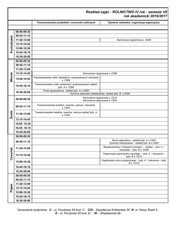 Rozkład zajęć - ROLNICTWO IV rok - semestr VII rok akademicki 2016/2017 Poniedziałek Towaroznawstwo produktów i surowców roślinnych Żywienie człowieka i organizacja wypoczynku 08:00-09:30 09:45-11:15 11:30-13:00 Seminarium dyplomowe s. C008 13:15-14:45 15:00-16:30 16:45-18:15 18:30-20:00 08:00-09:30 09:45-11:15 Wtorek 11:30-13:00 13:15-14:45 15:00-16:30 16:45-18:15 18:30-20:00 Środa 08:00-09:30 Seminarium dyplomowe s. C008 Towaroznawstwo roślin zielarskich i przemysłowych ćwiczenia s. C008 Towaroznawstwo roślin zielarskich i przemysłowych wykład tydz. A s. C008 Prawo gospodarcze wykład tydz. A s C008 Ochrona własności intelektualnej wykład tydz. B s C008 Seminarium dyplomowe s. C012 Seminarium dyplomowe s. C003 09:45-11:15 Towaroznawstwo kwiatów, owoców, warzyw ćwiczenia s. C003 11:30-13:00 Towaroznawstwo kwiatów, owoców, warzyw wykład tydz. A s. C003 13:15-14:45 15:00- 16:30 16:45- 18:15 18:30-20:00 Czwartek 08:00-09:30 09:45-11:15 Dania regionalne – wykład tydz. A s C003 Żywność funkcjonalna – wykład tydz. B s C003 11:30-13:00 Bezpieczeństwo i transport żywności – wykład - tydz. A / ćwiczenia – tydz. B s. C008 13:15-14:45 Organizacja wypoczynku czynnego - tydz. A / ćwiczenia – tydz. B s. C210 15:00-16:30 Organizacja ruchu turystycznego - tydz. A / ćwiczenia – tydz. B s. C210 16:45-18:15 18:30-20:00 08:00-09:30 Piątek 09:45-11:15 11:30-13:00 13:15-14:45 15:00-16:30 16:45-18:15 18:30-20:00 Oznaczenie budynków: C - ul. Pocztowa 54 bud. C ; CSI – Depułtycze Królewskie 55 N- ul. Nowy Świat 3 ; E - ul. Pocztowa 54 bud. E; W – Wojsławicka 8b