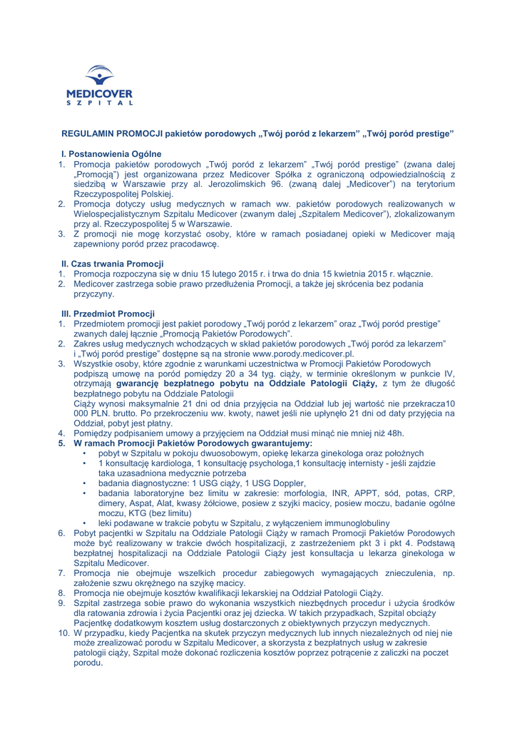 REGULAMIN PROMOCJI pakietów porodowych „Twój poród z lekarzem” „Twój poród prestige” I. Postanowienia Ogólne 1. Promocja pakietów porodowych „Twój poród z lekarzem” „Twój poród prestige” (zwana dalej „Promocją”) jest organizowana przez Medicover Spółka z ograniczoną odpowiedzialnością z siedzibą w Warszawie przy al. Jerozolimskich 96. (zwaną dalej „Medicover”) na terytorium Rzeczypospolitej Polskiej. 2. Promocja dotyczy usług medycznych w ramach ww. pakietów porodowych realizowanych w Wielospecjalistycznym Szpitalu Medicover (zwanym dalej „Szpitalem Medicover”), zlokalizowanym przy al. Rzeczypospolitej 5 w Warszawie. 3. Z promocji nie mogę korzystać osoby, które w ramach posiadanej opieki w Medicover mają zapewniony poród przez pracodawcę. II. Czas trwania Promocji 1. Promocja rozpoczyna się w dniu 15 lutego 2015 r. i trwa do dnia 15 kwietnia 2015 r. włącznie. 2. Medicover zastrzega sobie prawo przedłużenia Promocji, a także jej skrócenia bez podania przyczyny. III. Przedmiot Promocji 1. Przedmiotem promocji jest pakiet porodowy „Twój poród z lekarzem” oraz „Twój poród prestige” zwanych dalej łącznie „Promocją Pakietów Porodowych”. 2. Zakres usług medycznych wchodzących w skład pakietów porodowych „Twój poród za lekarzem” i „Twój poród prestige” dostępne są na stronie www.porody.medicover.pl. 3. Wszystkie osoby, które zgodnie z warunkami uczestnictwa w Promocji Pakietów Porodowych podpiszą umowę na poród pomiędzy 20 a 34 tyg. ciąży, w terminie określonym w punkcie IV, otrzymają gwarancję bezpłatnego pobytu na Oddziale Patologii Ciąży, z tym że długość bezpłatnego pobytu na Oddziale Patologii Ciąży wynosi maksymalnie 21 dni od dnia przyjęcia na Oddział lub jej wartość nie przekracza10 000 PLN. brutto. Po przekroczeniu ww. kwoty, nawet jeśli nie upłynęło 21 dni od daty przyjęcia na Oddział, pobyt jest płatny. 4. Pomiędzy podpisaniem umowy a przyjęciem na Oddział musi minąć nie mniej niż 48h. 5. W ramach Promocji Pakietów Porodowych gwarantujemy: • pobyt w Szpitalu w pokoju dwuosobowym, opiekę lekarza ginekologa oraz położnych • 1 konsultację kardiologa, 1 konsultację psychologa,1 konsultację internisty - jeśli zajdzie taka uzasadniona medycznie potrzeba • badania diagnostyczne: 1 USG ciąży, 1 USG Doppler, • badania laboratoryjne bez limitu w zakresie: morfologia, INR, APPT, sód, potas, CRP, dimery, Aspat, Alat, kwasy żółciowe, posiew z szyjki macicy, posiew moczu, badanie ogólne moczu, KTG (bez limitu) • leki podawane w trakcie pobytu w Szpitalu, z wyłączeniem immunoglobuliny 6. Pobyt pacjentki w Szpitalu na Oddziale Patologii Ciąży w ramach Promocji Pakietów Porodowych może być realizowany w trakcie dwóch hospitalizacji, z zastrzeżeniem pkt 3 i pkt 4. Podstawą bezpłatnej hospitalizacji na Oddziale Patologii Ciąży jest konsultacja u lekarza ginekologa w Szpitalu Medicover. 7. Promocja nie obejmuje wszelkich procedur zabiegowych wymagających znieczulenia, np. założenie szwu okrężnego na szyjkę macicy. 8. Promocja nie obejmuje kosztów kwalifikacji lekarskiej na Oddział Patologii Ciąży. 9. Szpital zastrzega sobie prawo do wykonania wszystkich niezbędnych procedur i użycia środków dla ratowania zdrowia i życia Pacjentki oraz jej dziecka. W takich przypadkach, Szpital obciąży Pacjentkę dodatkowym kosztem usług dostarczonych z obiektywnych przyczyn medycznych. 10. W przypadku, kiedy Pacjentka na skutek przyczyn medycznych lub innych niezależnych od niej nie może zrealizować porodu w Szpitalu Medicover, a skorzysta z bezpłatnych usług w zakresie patologii ciąży, Szpital może dokonać rozliczenia kosztów poprzez potrącenie z zaliczki na poczet porodu. 11. Pacjentkom posiadającym ubezpieczenie Medicover, które nie obejmuje procedury porodów przysługuje rabat w wysokości 5%. IV. Warunki uczestnictwa w Promocji Warunkiem skorzystania z Promocji Pakietów Porodowych jest: 1. zarejestrowanie się na stronie www.porody.medicover.pl i wypełnienie formularza zgłoszeniowego w terminie do 15 kwietnia 2015 r. 2. podpisanie umowy na poród w terminie do dnia 30 maja 2015 roku. V. Postanowienia Końcowe 1. Wszelkie reklamacje związane z Promocją Pakietów Porodowych należy zgłaszać wyłączenie do Działu Obsługi Klienta Medicover ([email protected]). 2. Przystępując do Promocji Pakietów Porodowych Uczestnik akceptuje treść niniejszego Regulaminu i zobowiązuje się przestrzegać jego postanowień. 3. Niniejszy regulamin jest dostępny do wglądu w siedzibie Medicover oraz na stronie internetowej www.porody.medicover.pl. 4. W przypadku rozbieżności pomiędzy postanowieniami niniejszego regulaminu Promocji Pakietów Porodowych i postanowieniami umów zwartych na pakiety porodowe, objęte niniejszą Promocją Pakietów Porodowych, rozstrzygające są postanowienia zawartych umów.