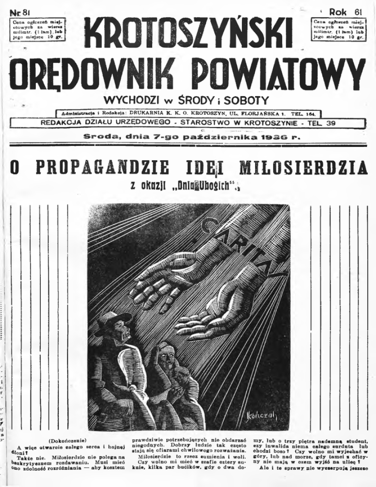 ł Rok Nr 81 61 KROTOSZYŃSKI I ORĘDOWNIK POWIATOWY Cena ogłoszeń mi«j~ I scowych za wiar«* I miJimtr. (1 tam ) . lob jego miejsce gr. I Ceoa ogftłuzeft miej- I scowych ea - w iara I mil im Lr. (1 fam) lob | jego miejsce 10 g r . l WYCHODZI w ŚRODYi SOBOTY | f A d m in istra c ja i R e d a k c ja : D R U K A R N IA K . K . O. K R O T O S Z Y N , U L. F L O R JA Ń S K A 1. T E L . Ift4. | ~~ REDAKCJA DZIAŁU URZĘDOWEGO - STAROSTWO W KROTOSZYNIE - TEL 39 A ■ | ..... Środa., dnia 7-go października 1»3G r. 0 PROPAGANDZIE IDEI MIŁOSIERDZIA z okazji „ D n i i M i c l i “ ., (Dokończenie) A wiqe atw araie całego seroa i hojnej ilo n it T a k ie nie. M iłosierdzie n ie polega na bezkrytyeznein ro zd aw an iu . M usi m ieć ono zdolność ro zró ż n ia n ia — ab y kosztem p raw dziw ie p o trzeb u jący ch nie obdarzać niegodnych. D obrzy Indzie ta k często sta ją się o fia ra m i chw ilow ego ro zw ażania. M iłosierdzie to rzecz su m ien ia i woli. Czy wolno m i m ieć w szafie oztery s u knie, k ilk a p a r bucików , gd y o dw a do m y, Inb o trz y p ie tra n ad em n ą stu d en t, ezy in w alid a niem a osiego su rd u ta lub chodzi boso ? Czy wolno m i w yjeehać w g ó ry , lu b nad m orze, gd y tam ci i ofićyn y nie m ają w ozem w yjió n a u lieę 1 A le i te sp ra w y nie w y cze rp u ją jeszcze i Cre'csrynskt O rędow nik Pow. Nr. 81* dostateczn ie zag ad n ien ia. M iłcść p ra wdziw a zasadza się. więcej n a o d daw aniu d ru g im tego czem się jest, n iż tego co się ma. B liźn i p rzew ażni« n ie p o trzebuje strzępków naszego m ien ia, ale za to b a r dzo po trzeb a m u i g o rąco p ra g n ie nasze go serca. M iłosierdzie m usi m ieć za pod staw ę m iłość, a m iłość praw d ziw a opiera się n a d arze sam ego siebie czyli n a po św ięceniu. K ażd y nasz u czy n ek m iło sie rn y p ow inien byó zaznaczony choć k ro p e lk ą naszej k rw i serdecznej, dopiero w tedy n a b iera p raw d ziw ej w artośei. G azety pełne są w iadom ości o zbro d n iach , p o p ełn io n y ch z rozpaczy, z nędzy z głodu. N ic dziw nego, źli to bowiem d o rad cy . A ludzie ta k o trz a sk a li się z tym zjaw iskiem , że rzad k o kom ukolw iek przy chodzi n a m yśl, że w łaśnie te wiadom ości, pow in n y n as pobudzić do ra c h u n k u sam ienia. Czy i do n as n ie m ógłby się zw rócić P a n Je z u s ja k o ngiś do K ain a z z a p y ta n ie m o b ra ta naszego żyjącego w nędzy? Czy nie m ieliśm y o k azji i m oż ności p o d an ia m u rę k i pom ocnej w chw ili, gd y m ożna go było ratow ać? Je d n y m z czołow ych celów „D N IA U B O G IC H “ to in te n c ja ro zb u d zenia n u ty pow szechnej m iłości b ra tn ie j w społeczeń stw ie, k tó ra b y sta ła się choć cząstk ą w y siłk u w złagodzeniu w alk kla6. P ro p a g a n d a idei m iłośei pow szechnej — to najlepszy środek do tego celu. P ra w d ziw a m iłość bliźniego m a zw yczaj zam y k ać oczy na to, co lu d zi różni, a podnosić to oo ich zbliża. To też ja k o pierw iastek łag o d zący pow inna zawsze tow arzyszyć spraw iedliw ość i pojęcie so lid arn cści. J e s t to jeden z n ajw ażn iejszy ch postulatów re lig ii k ato lick iej. N ajsiln iejszy m i mo ty w am i zachęcającym i d;> czynu były i są dla ludzi w ierzących p obudki zaczerpnięte z re lig ii. Pom oc udzielona bliźniem u w potrzebie w głębokim zrozu m ien iu jego doli jest dla ch rz e śc ija n in a zasłu g ą n ad przyrodzoną, m ającą znaczenie d la wie czności. Lecz i ludzi sto jąc y ch zdała od w ia ry C hrystusow ej n a k ła n ia ć m ożna do tego skutecznie, podając im p obudki czy sto przyrodzone, zaczerp n ięte z obserw acji liczn y ch objaw ów nędzy lu d zk iej w obe cnych czasach. L udzi nieczułych na n ie dolę bliźniego nie jest na szczęście tak w ielu — chodzi ty lk o o rozbudzenie po czucia m iłosierdzia. I do serca niew ierzących m ożna tra fić , sta w iając im przed oczy obraz ubóstw a bliźniego. N a k ła n ia n ie ty c h ludzi zdała Komunikat wnie do 3000 zł lub k a rz e aresz tu do G fyff- po m yśli a rt. 4 ro zporządzenia P re zy d en ta R zeczyp. z d n ia 31. I II . 1926 r. (Dz. U. R . P. N r. 91 poz, 527). R ów nocześnie może być zarządzona k o n fisk a ta przedm iotów do k tó ry ch odnosi się czyn przestępczy. K rotoszyn, d n ia 5. X . 1936 r. S ta ro sta P ow iatow y : ( - ) W IL IM O W S K I. w rześnia 1885 r. w M agnuszew icach, pow iatu Ja ro c iń sk ie g o w yłudza zapom ogi wzgl. fcym ulując chorobę, u siłu je dostać się do szpitala. M iejscowy zw iązek w spie r a n ia ubogich g m in y w iejskiej Ja ro c in nie będzie w ięc zw racał żadnych kosztów, w y n ik ły ch z tego ty tu łu . O pojaw ieniu się M ich alin y K oniecznej na te ren ie pow iatu K rotoszyńskiego, proszę zaw iadom ić Z arząd g m in n y w J a ro cin ie. N r. A. 66/7S/36. K rotoszyn, d n ia 5. X . 1936 r. S ta ro sta p o w ia to w y : ( - ) W IL IM O W S K I. N r. Op. 11/8/36. w sp ra w ie cen m a k sy m a ln y c h n a p rz e tw o ry zbóż chlebow ych. P o d aję poniżej do w iadom ości Ceny ustalo n e w p o rozum ieniu z przedstaw i cielam i odnośnych cechów na pieezywo: chleb ż y tn i p y tl. za 1 k g 0,27 zł. „ razo w y „ 1 „ 0,23 zł. C eny pow yższe o bow iązują od dnia ogłoszenia i n ie ty lk o w łaścicieli p iek arń , leez tak że w łaścicieli w szelkich przedsię b io rstw , sp rzed a ją cy ch pieczyw o. W in n i p o b ieran ia lu b żąd an ia cen w yższych od w yżej p o danych lub nienjaw nien ia ich n a cen n ik ach u le g n ą g r z y A D A M N A S IE L S K I. WYŚCIG ZE ŚMIERCIĄ P O W IE Ś Ć . 70. Z ad rżał n a m yśl o tem , co się sta n ie po zdobyciu jego dom u przez ludzi B rurisa. — D om jest doskonale strzeżony. Pozatem jest zam k n ięty m ze w szysikieh stro n . N ik t się tam nie d o stanie bez m ego pozw olenia, choćby n aw et dom u s trz e g 