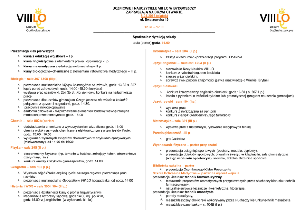 UCZNIOWIE I NAUCZYCIELE VIII LO W BYDGOSZCZY ZAPRASZAJĄ NA DRZWI OTWARTE 8.04.2016 (piątek) ul. Swarzewska 10 12.30 – 17.00 ___________________________________________________________________ Spotkanie z dyrekcją szkoły aula (parter) godz. 16.00 Prezentacja klas pierwszych klasa z edukacją wojskową – I p. klasa lingwistyczna z elementami prawa i dyplomacji - I p. klasa matematyczna z edukacją multimedialną – II p. klasy biologiczno–chemiczne z elementami ratownictwa medycznego – III p. Biologia – sale 307 i 308 (III p.) prezentacja multimedialna Wpływ kosmetyków na zdrowie, godz. 13.30 s. 307 kącik porad zdrowotnych godz. 14.00 -15.00 (korytarz) wystawa prac uczniów kl. 2b i 3b pt. Kot domowy, konkurs na najładniejszą pracę prezentacja dla uczniów gimnazjum Czego jeszcze nie wiecie o kotach? połączona z quizem i nagrodami, godz. 14.30. pracownia mikroskopowania anatomia człowieka - rozpoznawanie elementów budowy wewnętrznej na modelach przestrzennych od godz. 13:00 Chemia – sala 002b (parter) doświadczenia chemiczne z wykorzystaniem wizualizera godz. 13:00 chemia wokół nas - quiz chemiczny z elektronicznym system testów iVote, godz. 15:00 i 16:00 wykrywanie wybranych związków chemicznych w artykułach spożywczych (miniwarsztaty), od 14:00 do 16:30 Fizyka – sala 205 (II p.) eksperymenty fizyczne, (np. tornado w butelce, znikający kubek, atramentowe czary-mary, i in.) konkurs wiedzy z fizyki dla gimnazjalistów, godz. 14.00 Geografia – sala 102 (I p.) Wystawa zdjęć Rzeka częścią życia naszego regionu, prezentacja prac uczniów , prezentacja multimedialna Geografia w VIII LO i pogadanka, od godz. 14.00 Historia i WOS – sale 303 i 304 (III p.) prezentacja działalności klasy o profilu lingwistycznym inscenizacja rozprawy sądowej godz.14.00 w j. polskim, godz.15.00 w j.angielskim (w wykonaniu kl. 1a) Informatyka – sala 204 (II p.) zeszyt w chmurze? - prezentacja programu OneNote Język angielski – sale 201 i 203 (II p.) stanowisko Nocy Nauki w VIII LO konkurs z lyricstraining.com i quizletu skecze w j.angielskim. sprawdź swój poziom znajomości języka oraz wiedzę o Wielkiej Brytanii Język niemiecki konkurs krajoznawczy angielsko-niemiecki godz.13.30 ( s. 207 II p.) loteria z pytaniami o treści leksykalnej lub gramatycznej (program nauczania gimnazjum) Język polski - sala 104 (I p.) wystawa prac konkurs Z polszczyzną za pan brat konkurs Henryk Sienkiewicz i jego twórczość Matematyka - sala 301 (III p.) wystawa prac z matematyki, rysowanie nietypowych funkcji Przedsiębiorczość - III p gra Cashflow Wychowanie fizyczne – parter przy szatni prezentacja osiągnięć sportowych (puchary, medale, dyplomy). prezentacja obiektów sportowych: pływalnia (wstęp w klapkach), sala gimnastyczna (wstęp w obuwiu sportowym), siłownia, szkolna strzelnica sportowa Biblioteka szkolna – parter prezentacja Ósemkowego Klubu Recenzenta Szkoła Policealna Medyczna – parter na wprost wejścia prezentacja kierunku: technik farmaceutyczny testowanie preparatów kosmetycznych przygotowanych przez słuchaczy kierunku technik farmaceutyczny, naturalne surowce lecznicze i kosmetyczne, fitoterapia. prezentacja kierunku: technik masażysta porady masażysty, masaż klasyczny okolic ręki wykonywany przez słuchaczy kierunku technik masażysta masaż klasyczny karku – s. 104B (I p.)