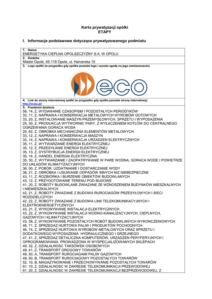 Karta prywatyzacji spółki ETAPY I. Informacje podstawowe dotyczące prywatyzowanego podmiotu 1. Nazwa ENERGETYKA CIEPLNA OPOLSZCZYZNY S.A. W OPOLU 2. Siedziba Miasto Opole, 45-118 Opole, ul. Harcerska 15 3. Logo spółki (w przypadku gdy spółka posiada logo i wyraża zgodę na jego zamieszczenie) 4. Link do strony internetowej spółki (w przypadku gdy spółka posiada stronę internetową) http://ecosa.pl/ 5. Przedmiot działania 58, 14, Z, WYDAWANIE CZASOPISM I POZOSTAŁYCH PERIODYKÓW 33, 11, Z, NAPRAWA I KONSERWACJA METALOWYCH WYROBÓW GOTOWYCH 33, 20, Z, INSTALOWANIE MASZYN PRZEMYSŁOWYCH, SPRZETU I WYPOSAZENIA 25, 30, Z, PRODUKCJA WYTWORNIC PARY, Z WYŁACZENIEM KOTŁÓW DO CENTRALNEGO OGRZEWANIA GORACA WODA 25, 62, Z, OBRÓBKA MECHANICZNA ELEMENTÓW METALOWYCH 33, 12, Z, NAPRAWA I KONSERWACJA MASZYN 33, 14, Z, NAPRAWA I KONSERWACJA URZADZEN ELEKTRYCZNYCH 35, 11, Z, WYTWARZANIE ENERGII ELEKTRYCZNEJ 35, 12, Z, PRZESYŁANIE ENERGII ELEKTRYCZNEJ 35, 13, Z, DYSTRYBUCJA ENERGII ELEKTRYCZNEJ 35, 14, Z, HANDEL ENERGIA ELEKTRYCZNA 35, 30, Z, WYTWARZANIE I ZAOPATRYWANIE W PARE WODNA, GORACA WODE I POWIETRZE DO UKŁADÓW KLIMATYZACYJNYCH 36, 00, Z, POBÓR, UZDATNIANIE I DOSTARCZANIE WODY 38, 21, Z, OBRÓBKA I USUWANIE ODPADÓW INNYCH NIZ NIEBEZPIECZNE 43, 11, Z, ROZBIÓRKA I BURZENIE OBIEKTÓW BUDOWLANYCH 43, 12, Z, PRZYGOTOWANIE TERENU POD BUDOWE 41, 20, Z, ROBOTY BUDOWLANE ZWIAZANE ZE WZNOSZENIEM BUDYNKÓW MIESZKALNYCH I NIEMIESZKALNYCH 42, 21, Z, ROBOTY ZWIAZANE Z BUDOWA RUROCIAGÓW PRZESYŁOWYCH I SIECI ROZDZIELCZYCH 42, 22, Z, ROBOTY ZWIAZANE Z BUDOWA LINII TELEKOMUNIKACYJNYCH I ELEKTROENERGETYCZNYCH 43, 21, Z, WYKONYWANIE INSTALACJI ELEKTRYCZNYCH 43, 22, Z, WYKONYWANIE INSTALACJI WODNO-KANALIZACYJNYCH, CIEPLNYCH, GAZOWYCH I KLIMATYZACYJNYCH 43, 39, Z, WYKONYWANIE POZOSTAŁYCH ROBÓT BUDOWLANYCH WYKONCZENIOWYCH 46, 71, Z, SPRZEDAZ HURTOWA PALIW I PRODUKTÓW POCHODNYCH 46, 74, Z, SPRZEDAZ HURTOWA WYROBÓW METALOWYCH ORAZ SPRZETU I DODATKOWEGO WYPOSAZENIA HYDRAULICZNEGO I GRZEJNEGO 47, 41, Z, SPRZEDAZ DETALICZNA KOMPUTERÓW, URZADZEN PERYFERYJNYCH I OPROGRAMOWANIA PROWADZONA W WYSPECJALIZOWANYCH SKLEPACH 49, 32, Z, DZIAŁALNOSC TAKSÓWEK OSOBOWYCH 49, 41, Z, TRANSPORT DROGOWY TOWARÓW 49, 50, A, TRANSPORT RUROCIAGAMI PALIW GAZOWYCH 49, 50, B, TRANSPORT RUROCIAGOWY POZOSTAŁYCH TOWARÓW 52, 10, B, MAGAZYNOWANIE I PRZECHOWYWANIE POZOSTAŁYCH TOWARÓW 61, 10, Z, DZIAŁALNOSC W ZAKRESIE TELEKOMUNIKACJI PRZEWODOWEJ 61, 20, Z, DZIAŁALNOSC W ZAKRESIE TELEKOMUNIKACJI BEZPRZEWODOWEJ, Z WYŁACZENIEM TELEKOMUNIKACJI SATELITARNEJ 61, 90, Z, DZIAŁALNOSC W ZAKRESIE POZOSTAŁEJ TELEKOMUNIKACJI 64, 91, Z, LEASING FINANSOWY 64, 92, Z, POZOSTAŁE FORMY UDZIELANIA KREDYTÓW 64, 99, Z, POZOSTAŁA FINANSOWA DZIAŁALNOSC USŁUGOWA, GDZIE INDZIEJ NIESKLASYFIKOWANA, Z WYŁACZENIEM UBEZPIECZEN I FUNDUSZÓW EMERYTALNYCH 68, 10, Z, KUPNO I SPRZEDAZ NIERUCHOMOSCI NA WŁASNY RACHUNEK 68, 20, Z, WYNAJEM I ZARZADZANIE NIERUCHOMOSCIAMI WŁASNYMI LUB DZIERZAWIONYMI 68, 32, Z, ZARZADZANIE NIERUCHOMOSCIAMI WYKONYWANE NA ZLECENIE 81, 10, Z, DZIAŁALNOSC POMOCNICZA ZWIAZANA Z UTRZYMANIEM PORZADKU W BUDYNKACH 77, 11, Z, WYNAJEM I DZIERZAWA SAMOCHODÓW OSOBOWYCH I FURGONETEK 77, 39, Z, WYNAJEM I DZIERZAWA POZOSTAŁYCH MASZYN, URZADZEN ORAZ DÓBR MATERIALNYCH, GDZIE INDZIEJ NIESKLASYFIKOWANE 77, 33, Z, WYNAJEM I DZIERZAWA MASZYN I URZADZEN BIUROWYCH, WŁACZAJAC KOMPUTERY 62, 02, Z, DZIAŁALNOSC ZWIAZANA Z DORADZTWEM W ZAKRESIE INFORMATYKI 58, 29, Z, DZIAŁALNOSC WYDAWNICZA W ZAKRESIE POZOSTAŁEGO OPROGRAMOWANIA 62, 01, Z, DZIAŁALNOSC ZWIAZANA Z OPROGRAMOWANIEM 62, 09, Z, POZOSTAŁA DZIAŁALNOSC USŁUGOWA W ZAKRESIE TECHNOLOGII INFORMATYCZNYCH I KOMPUTEROWYCH 62, 03, Z, DZIAŁALNOSC ZWIAZANA Z ZARZADZANIEM URZADZENIAMI INFORMATYCZNYMI 63, 11, Z, PRZETWARZANIE DANYCH; ZARZADZANIE STRONAMI INTERNETOWYMI (HOSTING) I PODOBNA DZIAŁALNOSC 63, 12, Z, DZIAŁALNOSC PORTALI INTERNETOWYCH 95, 11, Z, NAPRAWA I KONSERWACJA KOMPUTERÓW I URZADZEN PERYFERYJNYCH 72, 19, Z, BADANIA NAUKOWE I PRACE ROZWOJOWE W DZIEDZINIE POZOSTAŁYCH NAUK PRZYRODNICZYCH I TECHNICZNYCH 72, 20, Z, BADANIA NAUKOWE I PRACE ROZWOJOWE W DZIEDZINIE NAUK SPOŁECZNYCH I HUMANISTYCZNYCH 69, 10, Z, DZIAŁALNOSC PRAWNICZA 69, 20, Z, DZIAŁALNOSC RACHUNKOWO-KSIEGOWA; DORADZTWO PODATKOWE 70, 21, Z, STOSUNKI MIEDZYLUDZKIE (PUBLIC RELATIONS) I KOMUNIKACJA 70, 22, Z, POZOSTAŁE DORADZTWO W ZAKRESIE PROWADZENIA DZIAŁALNOSCI GOSPODARCZEJ I ZARZADZANIA 74, 90, Z, POZOSTAŁA DZIAŁALNOSC PROFESJONALNA, NAUKOWA I TECHNICZNA, GDZIE INDZIEJ NIESKLASYFIKOWANA 85, 60, Z, DZIAŁALNOSC WSPOMAGAJACA EDUKACJE 70, 10, Z, DZIAŁALNOSC FIRM CENTRALNYCH (HEAD OFFICES) I HOLDINGÓW, Z WYŁACZENIEM HOLDINGÓW FINANSOWYCH 71, 12, Z, DZIAŁALNOSC W ZAKRESIE INZYNIERII I ZWIAZANE Z NIA DORADZTWO TECHNICZNE 71, 20, B, POZOSTAŁE BADANIA I ANALIZY TECHNICZNE 74, 30, Z, DZIAŁALNOSC ZWIAZANA Z TŁUMACZENIAMI 82, 11, Z, DZIAŁALNOSC USŁUGOWA ZWIAZANA Z ADMINISTRACYJNA OBSŁUGA BIURA 82, 19, Z, WYKONYWANIE FOTOKOPII, PRZYGOTOWYWANIE DOKUMENTÓW I POZOSTAŁA SPECJALISTYCZNA DZIAŁALNOSC WSPOMAGAJACA PROWADZENIE BIURA 82, 99, Z, POZOSTAŁA DZIAŁALNOSC WSPOMAGAJACA PROWADZENIE DZIAŁALNOSCI GOSPODARCZEJ, GDZIE INDZIEJ NIESKLASYFIKOWANA 63, 99, Z, POZOSTAŁA DZIAŁALNOSC USŁUGOWA W ZAKRESIE INFORMACJI, GDZIE INDZIEJ NIESKLASYFIKOWANA 6. Udział: Gmina Opole - 53,26 % Gmina Brzeg - 0,69 % Gmina Grodków - 0,27% Gmina Głuchołazy - 0,07 % 7. Informacje na dzień 31.12.2012r. określające wysokość: 1) sumy bilansowej: 417 432 370,24 zł 2) kapitałów własnych: 230 057 586,96 zł 2 3) kapitału zakładowego: 155 480 000,00 zł 4) przychodów ze sprzedaży: 232 389 666,25 zł 5) wyniku netto: 22 752 782,28 zł 6) zatrudnienia: 503,2 8. Uwagi i informacje dodatkowe: Dane w wierszach 7. 1) do 6) podano za ostatnim zatwierdzonym sprawozdaniem rocznym. Dane w wierszu 7.6) oznaczają średniorocznie etaty w 2012r. II. Pierwszy etap prywatyzacji Pozycja Opis Załącznik Decyzja Prezydenta Miasta Opola o 