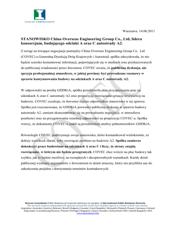 Warszawa. 14.06.2011 STANOWISKO China Overseas Engineering Group Co., Ltd, lidera konsorcjum, budującego odcinki A oraz C autostrady A2. Z uwagi na trwające negocjacje pomiędzy China Overseas Engineering Group Co. Ltd (COVEC) a Generalną Dyrekcją Dróg Krajowych i Autostrad, spółka zdecydowała, że nie będzie szeroko komentować informacji, pojawiających się w mediach oraz przekazywanych do publicznej wiadomości przez Inwestora. COVEC uważa, że publiczna dyskusja, nie sprzyja profesjonalnej atmosferze, w jakiej powinny być prowadzone rozmowy w sprawie kontynuowania budowy na odcinkach A oraz C autostrady A2. W odpowiedzi na prośbę GDDKiA, spółka przedstawiła plan przyspieszenia prac na odcinkach A oraz C autostrady A2 oraz propozycję rozwiązania sytuacji kryzysowej na budowie. COVEC oczekuje, że Inwestor zajmie odpowiednie stanowisko w tej sprawie. Spółka jest rozczarowana, że GDDKiA prowadzi publiczną dyskusję w sprawie budowy autostrady A2, zamiast skoncentrować się na prowadzeniu negocjacji, w atmosferze poufności oraz na przygotowaniu rzetelnej odpowiedzi na propozycje COVEC-u. Spółka wierzy, że dokumenty COVEC-u nadal są przedmiotem analizy pełnomocników GDDKiA. Równolegle COVEC podtrzymuje swoje stanowisko, które komunikował wielokrotnie, że dołoży wszelkich starań, żeby rozwiązać problem na budowie A2. Spółka zamierza dokończyć prace budowlane na odcinkach A oraz C i liczy, że strony znajdą rozwiązanie, w którym nie będzie przegranych. COVEC chce wrócić na plac budowy tak szybko, jak to będzie możliwe, na rozsądnych i akceptowalnych warunkach. Każdy dzień publicznej wymiany argumentów z Inwestorem to dzień stracony, który nie przybliża nas do zakończenia projektu i dotrzymania terminów kontraktowych. Warsaw Consultants Public Relations & Corporate Advocacy isa member of International Public Relations Network. The network connects independent PR agencies around the world. Each member agency is a leader in their own market. Argentina | Australia | Austria | Bahrain | Brasil | Bulgaria | Canada | Czech Republic | Denmark | Finland | France | Germany | Ireland Italy| Japan | Luxembourg| Norway | Poland | Portugal | Singapore | Spain | Sweden | Switzerland | UEA | United Kingdom | USA www.konsultanci.info Więcej informacji: Paweł Osowski [email protected] +48 508 128 603 Tomasz Drzał [email protected] +48 508 128 601 2 Warsaw ConsultantsPublic Relations & Corporate Advocacy isa member of International Public Relations Network. The network connects independent PR agencies around the world. Each member agency is a leader in their own market. Argentina | Australia | Austria | Bahrain | Brasil | Bulgaria | Canada | Czech Republic | Denmark | Finland | France | Germany | Ireland Italy| Japan | Luxembourg| Norway | Poland | Portugal | Singapore | Spain | Sweden | Switzerland | UEA | United Kingdom | USA www.konsultanci.info