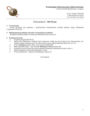 Technologia informacyjna (laboratorium) Wyższa Szkoła Menedżerska w Legnicy dr inż. Grzegorz Bazydło [email protected] www.bazydlo.wsm.edu.pl ĆWICZENIE 2 – MS WORD 1. Cel ćwiczenia Celem ćwiczenia jest poznanie i przećwiczenie formatowania czcionki podczas edycji dokumentu w programie MS Word. 2. Dokumentacja przebiegu ćwiczenia i otrzymanych rezultatów Wynikiem zrealizowanego ćwiczenia jest dokument Zaproszenie.doc. 3. Przebieg ćwiczenia Uruchom program MS Word. Zapisz nowy dokument w folderze Moje dokumenty. Nadaj mu nazwę Zaproszenie. Rozszerzenie .doc zostanie nadane automatycznie. W trakcie edycji często zapisuj dokument (klawisze Ctrl+S). Ustaw marginesy (górny, dolny, lewy, prawy) 3 cm każdy. Wpisz potrzebne dane – użyj czcionki Monotype Corsiva rozmiar 16. Pozostałe wytyczne dotyczące poszczególnych elementów dokumentu zawarto w pkt. 4. Zapisz dokument i poproś prowadzącego o ocenę. W razie problemów – poproś prowadzącego o pomoc . Powodzenia! 1 dowolny obiekt WordArt 4. Wytyczne do edycji dokumentu Zaproszenie.doc Marginesy: wszystkie 3 cm wszystko: czcionka Monotype Corsiva dowolny ClipArt urodzinowy Legnica, 24 listopada 2008r. pogrubiony, wyśrodkowany, czerwony, odstęp między znakami: rozstrzelony (2 pkt.) kursywa, do prawej Droga Kasiu! Zapraszam serdecznie na swoje Imieniny we symbol wtorek 4 grudnia 2008r. na godz. . Impreza pogrubienie imieninowa odbędzie się u mnie w domu na ul. Konopnickiej 6/1. Będą chipsy Lays® wyjustowany, wcięcie z lewej i z prawej: 2 cm, fioletowy i Coca-Cola™. Do zobaczenia! pogrubiony, niebieski, wyśrodkowany, podkreślenie faliste zielony, do lewej Basia PS. Proszę o potwierdzenie przybycia na mój 8512-345. zielony, wyjustowany, wcięcie z lewej: 1 cm „Łapówka” dla mojego ulubieńca kursywa, do prawej, fioletowy mile widziana dowolny ClipArt zwierzątka Copyright © Basia 2008 symbol kursywa, do lewej 2 5. Wzór dokumentu Zaproszenie.doc Legnica, 24 listopada 2008r. Droga Kasiu! Zapraszam serdecznie na swoje Imieniny we wtorek 4 grudnia 2008r. na godz. . Impreza imieninowa odbędzie się u mnie w domu na ul. Konopnickiej 6/1. Będą chipsy Lays® i Coca-Cola™. Do zobaczenia! Basia PS. Proszę o potwierdzenie przybycia na mój 8512-345. „Łapówka” dla mojego ulubieńca mile widziana Copyright © Basia 2008 3