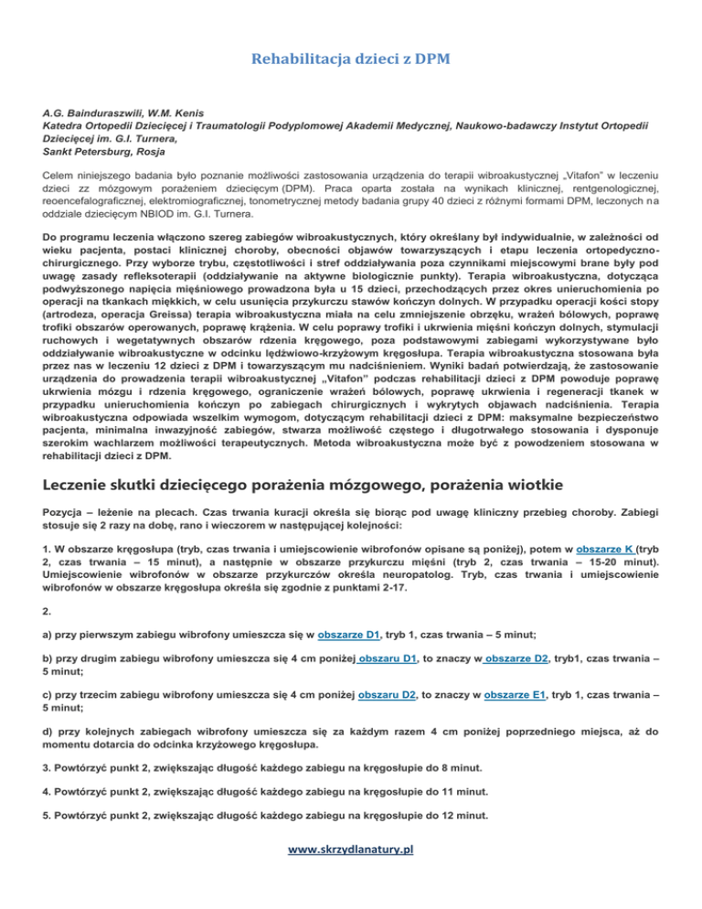 Rehabilitacja dzieci z DPM A.G. Bainduraszwili, W.M. Kenis Katedra Ortopedii Dziecięcej i Traumatologii Podyplomowej Akademii Medycznej, Naukowo-badawczy Instytut Ortopedii Dziecięcej im. G.I. Turnera, Sankt Petersburg, Rosja Celem niniejszego badania było poznanie możliwości zastosowania urządzenia do terapii wibroakustycznej „Vitafon” w leczeniu dzieci zz mózgowym porażeniem dziecięcym (DPM). Praca oparta została na wynikach klinicznej, rentgenologicznej, reoencefalograficznej, elektromiograficznej, tonometrycznej metody badania grupy 40 dzieci z różnymi formami DPM, leczonych na oddziale dziecięcym NBIOD im. G.I. Turnera. Do programu leczenia włączono szereg zabiegów wibroakustycznych, który określany był indywidualnie, w zależności od wieku pacjenta, postaci klinicznej choroby, obecności objawów towarzyszących i etapu leczenia ortopedycznochirurgicznego. Przy wyborze trybu, częstotliwości i stref oddziaływania poza czynnikami miejscowymi brane były pod uwagę zasady refleksoterapii (oddziaływanie na aktywne biologicznie punkty). Terapia wibroakustyczna, dotycząca podwyższonego napięcia mięśniowego prowadzona była u 15 dzieci, przechodzących przez okres unieruchomienia po operacji na tkankach miękkich, w celu usunięcia przykurczu stawów kończyn dolnych. W przypadku operacji kości stopy (artrodeza, operacja Greissa) terapia wibroakustyczna miała na celu zmniejszenie obrzęku, wrażeń bólowych, poprawę trofiki obszarów operowanych, poprawę krążenia. W celu poprawy trofiki i ukrwienia mięśni kończyn dolnych, stymulacji ruchowych i wegetatywnych obszarów rdzenia kręgowego, poza podstawowymi zabiegami wykorzystywane było oddziaływanie wibroakustyczne w odcinku lędźwiowo-krzyżowym kręgosłupa. Terapia wibroakustyczna stosowana była przez nas w leczeniu 12 dzieci z DPM i towarzyszącym mu nadciśnieniem. Wyniki badań potwierdzają, że zastosowanie urządzenia do prowadzenia terapii wibroakustycznej „Vitafon” podczas rehabilitacji dzieci z DPM powoduje poprawę ukrwienia mózgu i rdzenia kręgowego, ograniczenie wrażeń bólowych, poprawę ukrwienia i regeneracji tkanek w przypadku unieruchomienia kończyn po zabiegach chirurgicznych i wykrytych objawach nadciśnienia. Terapia wibroakustyczna odpowiada wszelkim wymogom, dotyczącym rehabilitacji dzieci z DPM: maksymalne bezpieczeństwo pacjenta, minimalna inwazyjność zabiegów, stwarza możliwość częstego i długotrwałego stosowania i dysponuje szerokim wachlarzem możliwości terapeutycznych. Metoda wibroakustyczna może być z powodzeniem stosowana w rehabilitacji dzieci z DPM. Leczenie skutki dziecięcego porażenia mózgowego, porażenia wiotkie Pozycja – leżenie na plecach. Czas trwania kuracji określa się biorąc pod uwagę kliniczny przebieg choroby. Zabiegi stosuje się 2 razy na dobę, rano i wieczorem w następującej kolejności: 1. W obszarze kręgosłupa (tryb, czas trwania i umiejscowienie wibrofonów opisane są poniżej), potem w obszarze K (tryb 2, czas trwania – 15 minut), a następnie w obszarze przykurczu mięśni (tryb 2, czas trwania – 15-20 minut). Umiejscowienie wibrofonów w obszarze przykurczów określa neuropatolog. Tryb, czas trwania i umiejscowienie wibrofonów w obszarze kręgosłupa określa się zgodnie z punktami 2-17. 2. а) przy pierwszym zabiegu wibrofony umieszcza się w obszarze D1, tryb 1, czas trwania – 5 minut; b) przy drugim zabiegu wibrofony umieszcza się 4 cm poniżej obszaru D1, to znaczy w obszarze D2, tryb1, czas trwania – 5 minut; c) przy trzecim zabiegu wibrofony umieszcza się 4 cm poniżej obszaru D2, to znaczy w obszarze Е1, tryb 1, czas trwania – 5 minut; d) przy kolejnych zabiegach wibrofony umieszcza się za każdym razem 4 cm poniżej poprzedniego miejsca, aż do momentu dotarcia do odcinka krzyżowego kręgosłupa. 3. Powtórzyć punkt 2, zwiększając długość każdego zabiegu na kręgosłupie do 8 minut. 4. Powtórzyć punkt 2, zwiększając długość każdego zabiegu na kręgosłupie do 11 minut. 5. Powtórzyć punkt 2, zwiększając długość każdego zabiegu na kręgosłupie do 12 minut. www.skrzydlanatury.pl 6. Skrócić czas trwania każdego z zabiegów na kręgosłupie do 7 minut, przechodząc do trybu 2 i powtarzając punkt 2. 7. Wydłużyć czas trwania zabiegu na kręgosłupie do 10 minut i powtórzyć punkt 2 w trybie 2. 8. Wydłużyć czas trwania zabiegu na kręgosłupie do 13 minut i powtórzyć punkt 2 w trybie 2. 9. Przy pozytywnej reakcji zwiększyć czas trwania zabiegów na kręgosłupie do 15 minut i powtórzyć punkt 2 w trybie 2. 10. Tygodniowa przerwa. 11. а) jeśli efekt terapii jest zadowalający, należy powtarzać punkt 9 przez rok, co miesiąc robiąc 7-dniowe przerwy. Jeśli zabiegi przynoszą większy efekt w przypadku któregoś z odcinków kręgosłupa, należy skupić proces leczenia na tym odcinku; b) w przypadku braku rezultatu należy przejść do punktu 12. 12. Zmniejszyć czas trwania zabiegów na kręgosłupie do 7 minut i powtórzyć punkt 2 w trybie 4. 13. Zwiększyć czas trwania zabiegów na kręgosłupie do 10 minut i powtórzyć punkt 2 w trybie 4. 14. Zwiększyć czas trwania zabiegów na kręgosłupie do 13 minut i powtórzyć punkt 2 w trybie 4. 15. Przy pozytywnej reakcji zwiększyć czas trwania zabiegów na kręgosłupie do 15 minut i powtórzyć punkt 2 w trybie 4. 16. Tygodniowa przerwa. а) jeśli efekt terapii jest zadowalający, należy powtarzać punkt 15 przez rok, co miesiąc robiąc 7-dniowe przerwy. Jeśli zabiegi przynoszą lepszy efekt w przypadku któregoś z odcinków kręgosłupa, proces leczenia należy skupić na tym odcinku; www.skrzydlanatury.pl