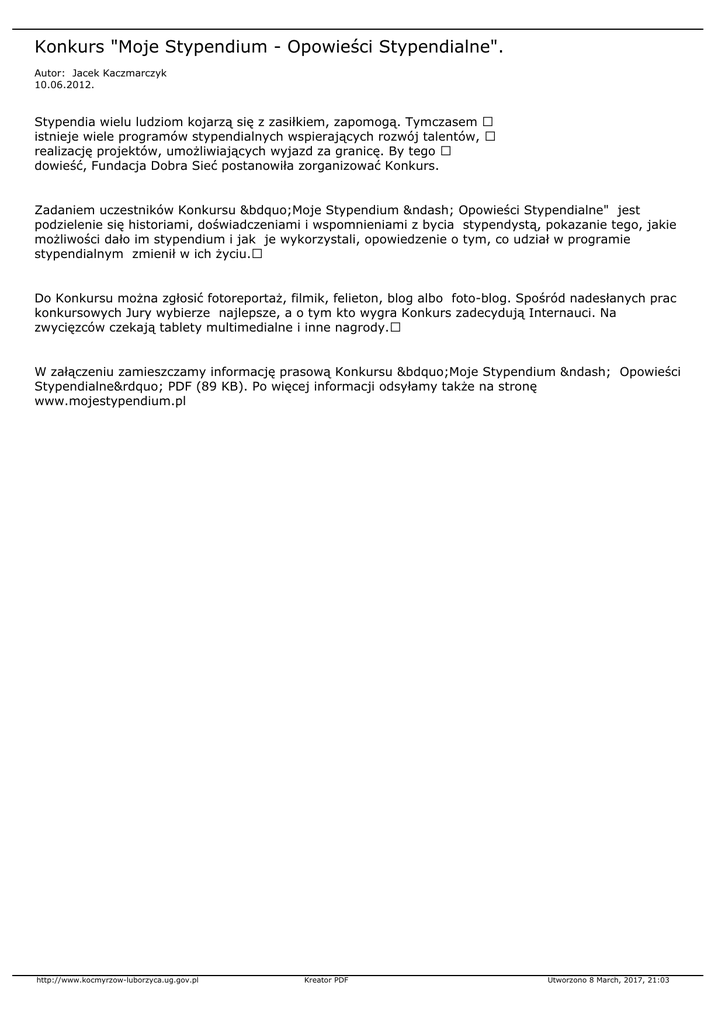 Konkurs "Moje Stypendium - Opowieści Stypendialne". Autor: Jacek Kaczmarczyk 10.06.2012. Stypendia wielu ludziom kojarzą się z zasiłkiem, zapomogą. Tymczasem istnieje wiele programów stypendialnych wspierających rozwój talentów, realizację projektów, umożliwiających wyjazd za granicę. By tego dowieść, Fundacja Dobra Sieć postanowiła zorganizować Konkurs. Zadaniem uczestników Konkursu „Moje Stypendium – Opowieści Stypendialne" jest podzielenie się historiami, doświadczeniami i wspomnieniami z bycia stypendystą, pokazanie tego, jakie możliwości dało im stypendium i jak je wykorzystali, opowiedzenie o tym, co udział w programie stypendialnym zmienił w ich życiu. Do Konkursu można zgłosić fotoreportaż, filmik, felieton, blog albo foto-blog. Spośród nadesłanych prac konkursowych Jury wybierze najlepsze, a o tym kto wygra Konkurs zadecydują Internauci. Na zwycięzców czekają tablety multimedialne i inne nagrody. W załączeniu zamieszczamy informację prasową Konkursu „Moje Stypendium – Opowieści Stypendialne” PDF (89 KB). Po więcej informacji odsyłamy także na stronę www.mojestypendium.pl http://www.kocmyrzow-luborzyca.ug.gov.pl Kreator PDF Utworzono 8 March, 2017, 21:03