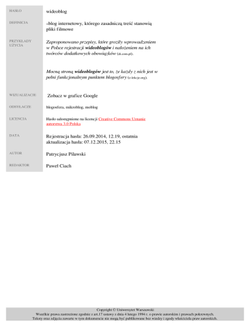 HASŁO wideoblog DEFINICJA «blog PRZYKŁADY UŻYCIA Zaproponowano przepisy, które groziły wprowadzeniem w Polsce rejestracji wideoblogów i nałożeniem na ich twórców dodatkowych obowiązków (di.com.pl). internetowy, którego zasadniczą treść stanowią pliki filmowe» Mocną stroną wideoblogów jest to, że każdy z nich jest w pełni funkcjonalnym punktem blogosfery (e-lekcje.org). WIZUALIZACJE Zobacz w grafice Google ODSYŁACZE blogosfera, mikroblog, moblog LICENCJA Hasło udostępnione na licencji Creative Commons Uznanie autorstwa 3.0 Polska DATA Rejestracja hasła: 26.09.2014, 12.19, ostatnia aktualizacja hasła: 07.12.2015, 22.15 AUTOR Patrycjusz Pilawski REDAKTOR Paweł Ciach Copyright © Uniwersytet Warszawski Wszelkie prawa zastrzeżone zgodnie z art.17 ustawy z dnia 4 lutego 1994 r. o prawie autorskim i prawach pokrewnych. Teksty oraz zdjęcia zawarte w tym dokumencie nie mogą być publikowane bez wiedzy i zgody właściciela praw autorskich. Powered by TCPDF (www.tcpdf.org)