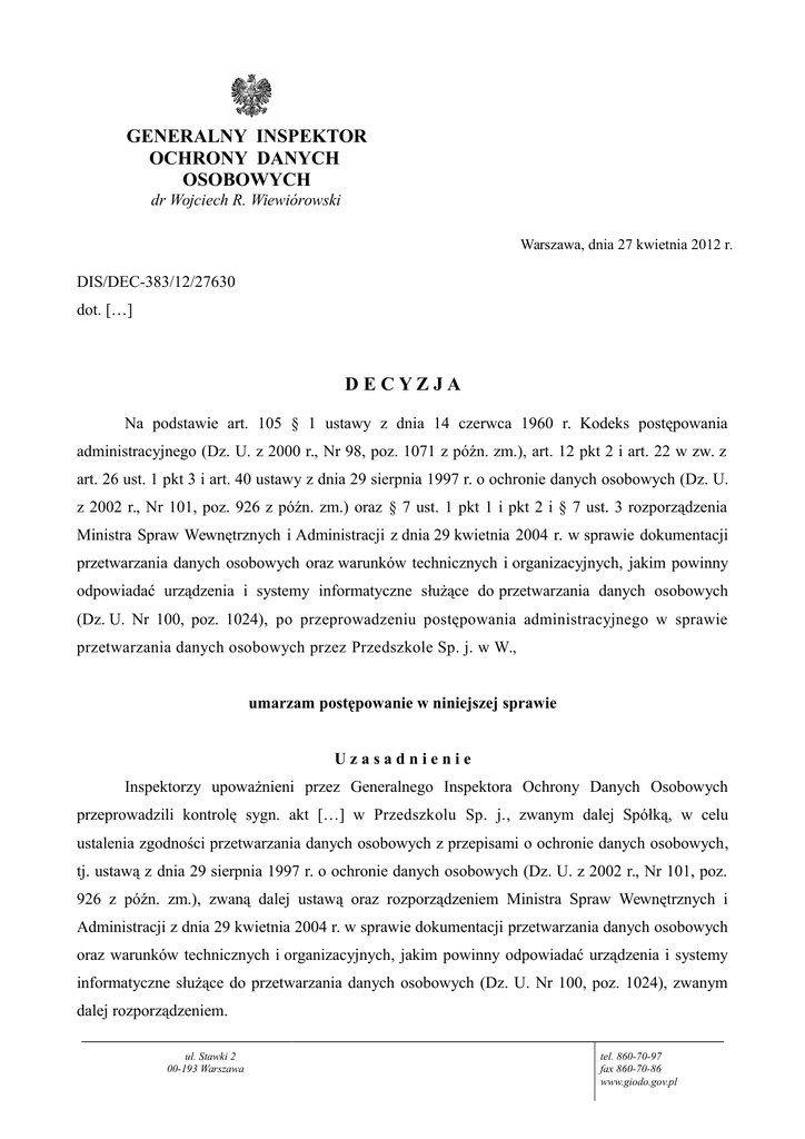 GENERALNY INSPEKTOR OCHRONY DANYCH OSOBOWYCH dr Wojciech R. Wiewiórowski Warszawa, dnia 27 kwietnia 2012 r. DIS/DEC-383/12/27630 dot. […] DECYZJA Na podstawie art. 105 § 1 ustawy z dnia 14 czerwca 1960 r. Kodeks postępowania administracyjnego (Dz. U. z 2000 r., Nr 98, poz. 1071 z późn. zm.), art. 12 pkt 2 i art. 22 w zw. z art. 26 ust. 1 pkt 3 i art. 40 ustawy z dnia 29 sierpnia 1997 r. o ochronie danych osobowych (Dz. U. z 2002 r., Nr 101, poz. 926 z późn. zm.) oraz § 7 ust. 1 pkt 1 i pkt 2 i § 7 ust. 3 rozporządzenia Ministra Spraw Wewnętrznych i Administracji z dnia 29 kwietnia 2004 r. w sprawie dokumentacji przetwarzania danych osobowych oraz warunków technicznych i organizacyjnych, jakim powinny odpowiadać urządzenia i systemy informatyczne służące do przetwarzania danych osobowych (Dz. U. Nr 100, poz. 1024), po przeprowadzeniu postępowania administracyjnego w sprawie przetwarzania danych osobowych przez Przedszkole Sp. j. w W., umarzam postępowanie w niniejszej sprawie Uzasadnienie Inspektorzy upoważnieni przez Generalnego Inspektora Ochrony Danych Osobowych przeprowadzili kontrolę sygn. akt […] w Przedszkolu Sp. j., zwanym dalej Spółką, w celu ustalenia zgodności przetwarzania danych osobowych z przepisami o ochronie danych osobowych, tj. ustawą z dnia 29 sierpnia 1997 r. o ochronie danych osobowych (Dz. U. z 2002 r., Nr 101, poz. 926 z późn. zm.), zwaną dalej ustawą oraz rozporządzeniem Ministra Spraw Wewnętrznych i Administracji z dnia 29 kwietnia 2004 r. w sprawie dokumentacji przetwarzania danych osobowych oraz warunków technicznych i organizacyjnych, jakim powinny odpowiadać urządzenia i systemy informatyczne służące do przetwarzania danych osobowych (Dz. U. Nr 100, poz. 1024), zwanym dalej rozporządzeniem. ul. Stawki 2 00-193 Warszawa tel. 860-70-97 fax 860-70-86 www.giodo.gov.pl W toku kontroli odebrano od pracowników ustne wyjaśnienia oraz skontrolowano systemy informatyczne, w których przetwarzane są dane osobowe. Stan faktyczny został szczegółowo opisany w protokole kontroli, który został podpisany przez pracownika Przedszkola, na podstawie pełnomocnictwa z dnia […] listopada 2011 r. Na podstawie tak zgromadzonego materiału dowodowego ustalono, że w procesie przetwarzania danych osobowych Spółka, jako administrator danych naruszyła przepisy o ochronie danych osobowych. Postępowaniem administracyjnym wszczętym w dniu […] stycznia 2012 r. sygn. [...] objęto: 1. Zbieranie przez Spółkę za pośrednictwem formularza „Karta przedszkolaka” danych o miejscu pracy rodziców dziecka, jako nieadekwatnych w stosunku celu zbierania danych, tj. nawiązania kontaktu z rodzicem w nagłych okolicznościach (art. 26 ust. 1 pkt 3 ustawy). 2. Zbieranie przez Spółkę za pośrednictwem formularza „Karta zdrowia przedszkolaka” danych o imieniu, nazwisku i wieku rodzeństwa, jako nieadekwatnych w stosunku do celu zbierania danych, tj. poznania sytuacji rodzinnej dziecka (art. 26 ust. 1 pkt 3 ustawy). 3. Niedopełnienie obowiązku zgłoszenia do rejestracji Generalnemu Inspektorowi Ochrony Danych Osobowych zbioru danych osobowych osób upoważnionych do odbioru dziecka (art. 40 ustawy). 4. Niezapewnienie, aby dla każdej osoby, której dane osobowe są przetwarzane w systemie informatycznym, tj. w plikach typu xls (w których przetwarzane są dane osobowe dzieci i rodziców) zarządzanych przez aplikację o nazwie „M”, możliwości odnotowania informacji o dacie wprowadzenia danych do systemu oraz o identyfikatorze użytkownika wprowadzającego dane osobowe do ww. pliku (§ 7 ust. 1 pkt 1 rozporządzenia). 5. Niezapewnienie, aby aplikacja o nazwie „M”, w której w plikach typu xls przetwarzane są dane osobowe dzieci i rodziców, umożliwiała sporządzenie i wydrukowanie raportu zawierającego w powszechnie zrozumiałej formie informacje o dacie wprowadzenia danych do systemu oraz o identyfikatorze użytkownika wprowadzającego dane osobowe do ww. pliku (§ 7 ust. 3 rozporządzenia). W odpowiedzi na pismo informujące o wszczęciu postępowania administracyjnego pełnomocnik Spółki (pełnomocnictwo z dnia […] listopada 2012 r.) pismami z dnia […] stycznia 2012 r. oraz […] marca 2012 r. złożył wyjaśnienia w sprawie wskazanych uchybień informując o następujących okolicznościach: 1. Dokonano modyfikacji formularza „Karta przedszkolaka” w zakresie usunięcia pola „Miejsce pracy” (rodziców). 2. Dokonano modyfikacji formularza „Karta zdrowia przedszkolaka” w zakresie usunięcia pola „Rodzeństwo (imię, nazwisko, wiek)”. 2 3. Zainstalowano nowy system informatyczny („zdalna baza danych”), w którym gromadzone i aktualizowane są informacje o dzieciach i ich rodzicach (opiekunach). 4. Zgłoszono do rejestracji zbiór danych osób upoważnionych do odbioru dziecka z przedszkola. Na potwierdzenie wyjaśnień pełnomocnik Przedszkola Sp. j. przesłał m.in. zmodyfikowane wzory formularzy: „Karta przedszkolaka” „Karta zdrowia przedszkolaka”, wydruki z systemu informatycznego (bazy danych), w której przetwarzane są dane dzieci. Generalny Inspektor Ochrony Danych Osobowych po przeprowadzeniu analizy całokształtu materiału dowodowego zebranego w niniejszej sprawie zważył, co następuje: Stosownie do art. 105 § 1 Kodeksu postępowania administracyjnego, gdy postępowanie z jakiejkolwiek przyczyny stało się bezprzedmiotowe w całości albo w części, organ administracji publicznej wydaje decyzję o umorzeniu postępowania odpowiednio w całości albo w części. Przesłanką umorzenia postępowania, na podstawie art. 105 § 1 k.p.a. jest bezprzedmiotowość postępowania „z jakiejkolwiek przyczyny”, czyli z każdej przyczyny powodującej brak jednego z elementów materialnoprawnego stosunku prawnego w odniesieniu do jego strony podmiotowej lub przedmiotowej (wyrok NSA z 21 stycznia 1999 r. S.A./Sz1029/97). Na podstawie całokształtu materiału dowodowego należy uzn
