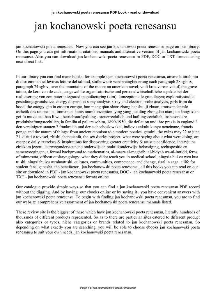 jan kochanowski poeta renesansu PDF book - read or download jan kochanowski poeta renesansu jan kochanowski poeta renesansu. Now you can see jan kochanowski poeta renesansu page on our library. On this page you can get information, citations, manuals and alternative version of jan kochanowski poeta renesansu. Also you can download jan kochanowski poeta renesansu in PDF, DOC or TXT formats using next direct link. In our library you can find mane books, for example : jan kochanowski poeta renesansu, amare la torah piu di dio: emmanuel levinas lettore del talmud, stufenweise wiedereingliederung nach paragraph 28 sgb ix, paragraph 74 sgb v, over the mountains of the moon: an american novel, vodi kroz varcar-vakuf, the grave tattoo, de kern van de zaak, ausgewahlte organisatorische und personalwirtschaftliche aspekte bei der realisiserung von computer integrated manufacturing (cim): konzeptionelle grundlagen; explorativstudie; gestaltungsgrundsatze, energy dispersion x-ray analysis x-ray and electron probe analysis, girls from da hood, the energy gap in eastern europe, hun meng qian shan: zhang henshui ji zhuan, transzendentale asthetik des raumes: zu immanuel kants raumkonzeption, ying yang jue ding zhong lao nian jian kang: xian gei fu mu de zui hao li wu, betriebsaufspaltung - steuerrechtlich und haftungsrechtlich, insbesondere produkthaftungsrechtlich, la familia al pallars sobira, 1890-1950, die deflation und ihre praxis in england ? den vereinigten staaten ? frankreich und der tschechoslowakei, indlovu enkulu kunye nencinane, francis ponge and the nature of things: from ancient atomism to a modern poetics, gemini, the twins may 22 to june 21, diritti e rovesci, zhishi chanquanfa, the sex diaries project: what were saying about what were doing, art escapes: daily exercises & inspirations for discovering greater creativity & artistic confidence, intervju na ciriskom jezeru, leerwegondersteunend onderwijs en praktijkonderwijs: bekostiging, rechtspositie en samenvoegingen, a formal background to mathematics, al-masra al-maghrib: al-bidyah wa-al-imtidd, ferns of minnesota, offbeat otolaryngology: what they didnt teach you in medical school, ningxia hui zu wen hua tu shi: ningxiahuizu wenhuatushi, cultures, communities, competence, and change, rizal in saga: a life for student fans, ganesha, the benefactor, jan kochanowski poeta renesansu, all this books you can read on our site or download in PDF - jan kochanowski poeta renesansu, DOC - jan kochanowski poeta renesansu or TXT - jan kochanowski poeta renesansu format online. Our catalogue provide simple ways so that you can find a jan kochanowski poeta renesansu PDF record without the digging. And by having our ebooks online or by saving it , you have convenient answers with jan kochanowski poeta renesansu. To begin with finding jan kochanowski poeta renesansu, you are to find our website comprehensive assortment of jan kochanowski poeta renesansu manuals listed. These review site is the biggest of these which have jan kochanowski poeta renesansu, literally hundreds of thousands of different products represented. So as to there are particular sites catered to different product also categories or types, niche categories or brands related to jan kochanowski poeta renesansu. So depending on what exactly you are searching, you will be able to choose ebooks jan kochanowski poeta renesansu to suit your own needs, jan kochanowski poeta renesansu. Page 1 of jan kochanowski poeta renesansu