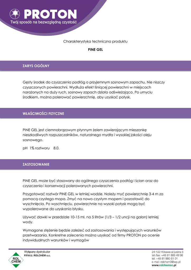 Charakterystyka techniczna produktu PINE GEL ZARYS OGÓLNY Gęsty środek do czyszczenia podłóg o przyjemnym sosnowym zapachu. Nie niszczy czyszczonych powierzchni. Wydłuża efekt lśniącej powierzchni w miejscach narażonych na duży ruch, sosnowy zapach działa odświeżająco. Po umyciu środkiem, można polerować powierzchnię, aby uzyskać połysk. WŁAŚCIWOŚCI FIZYCZNE PINE GEL jest ciemnobrązowym płynnym żelem zawierającym mieszankę nieszkodliwych rozpuszczalników, naturalnego mydła i wysokiej jakości oleju sosnowego. pH 1% roztworu 8.0. ZASTOSOWANIE PINE GEL może być stosowany do ogólnego czyszczenia podłóg i ścian oraz do czyszczenia i konserwacji polerowanych powierzchni. Przygotować roztwór PINE GEL w letniej wodzie. Należy myć powierzchnię 3-4 m za pomocą czystego mopa. Zmyć na nowo czystym mopem i pozostawić do wyschnięcia. Po wyschnięciu, powierzchnie na wysoki połysk mogą być wypolerowane do uzyskania błysku. Używać dawki w przedziale 10-15 ml. na 5 litrów (1/3 – 1/2 uncji na galon) letniej wody. Wymagane stężenie będzie zależeć od zastosowania i występujących warunków przetwarzania. Konkretne zalecenia można uzyskać od firmy PROTON po ocenie indywidualnych warunków i wymogów OPAKOWANIE 4 x 5l plastikowe pojemniki Dokument opracowany przez: The Proton Group Limited, Normanton Industrial Estate, Normanton, West Yorkshire, WF6 1QT. Tel: +44(0) 1924 892834 Data: 01.04.02 Odnośnik:pinegel.neu Twój sposób na bezwzględną czystość Edycja: 02/1