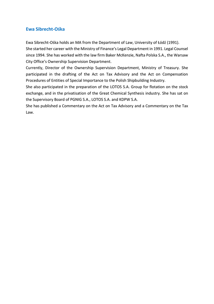 Ewa Sibrecht-Ośka Ewa Sibrecht-Ośka holds an MA from the Department of Law, University of Łódź (1991). She started her career with the Ministry of Finance’s Legal Department in 1991. Legal Counsel since 1994. She has worked with the law firm Baker McKenzie, Nafta Polska S.A., the Warsaw City Office’s Ownership Supervision Department. Currently, Director of the Ownership Supervision Department, Ministry of Treasury. She participated in the drafting of the Act on Tax Advisory and the Act on Compensation Procedures of Entities of Special Importance to the Polish Shipbuilding Industry. She also participated in the preparation of the LOTOS S.A. Group for flotation on the stock exchange, and in the privatisation of the Great Chemical Synthesis industry. She has sat on the Supervisory Board of PGNIG S.A., LOTOS S.A. and KDPW S.A. She has published a Commentary on the Act on Tax Advisory and a Commentary on the Tax Law.