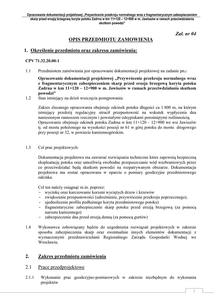 Opracowanie dokumentacji projektowej „Przywrócenie przekroju normalnego wraz z fragmentarycznym zabezpieczeniem skarp przed erozją brzegową koryta potoku Zadrna w km 11+120 – 12+900 w m. Jawiszów w ramach przeciwdziałania skutkom powodzi” Zał. nr 04 OPIS PRZEDMIOTU ZAMOWIENIA 1. Określenie przedmiotu oraz zakresu zamówienia: CPV 71.32.20.00-1 1.1 Przedmiotem zamówienia jest opracowanie dokumentacji projektowej na zadanie pn.: 1.2 Opracowanie dokumentacji projektowej „Przywrócenie przekroju normalnego wraz z fragmentarycznym zabezpieczeniem skarp przed erozja brzegową koryta potoku Zadrna w km 11+120 – 12+900 w m. Jawiszów w ramach przeciwdziałania skutkom powodzi” Stan istniejący na dzień wszczęcia postępowania: Zakres zlecanego opracowania obejmuje odcinek potoku długości ca 1 800 m, na którym istniejący przekrój regulacyjny utracił przepustowość na wskutek wypłycenia dna naniesionym rumoszem rzecznym i powstałymi odsypiskami porośniętymi roślinnością. Opracowanie obejmuje odcinek potoku Zadrna w km 11+120 – 12+900 we wsi Jawiszów tj. od mostu połoŜonego na wysokości posesji nr 61 w górę potoku do mostu drogowego przy posesji nr 32, w powiecie kamiennogórskim. 1.3 Cel prac projektowych: Dokumentacja projektowa ma zawierać rozwiązania techniczne które zapewnią bezpieczną eksploatację potoku oraz umoŜliwią swobodne przepuszczanie wód wezbraniowych przez co przeciwdziałać będą skutkom powodzi na rozpatrywanym obszarze. Dokumentacja projektowa ma zostać opracowana w oparciu o pomiary geodezyjne przedmiotowego odcinka. Cel ten naleŜy osiągnąć m.in. poprzez: - wycinkę oraz karczowanie korzeni wyciętych drzew i krzewów - zwiększenie przepustowości (udroŜnienie, przywrócenie przekroju poprzecznego), - ujednolicenie profilu podłuŜnego koryta przedmiotowego potoku) - fragmentaryczne zabezpieczenie skarp potoku przed erozją brzegową (za pomocą narzutu kamiennego) - zabezpieczenie dna przed erozją denną (za pomocą gurtów) 1.4 Wykonawca zobowiązany będzie do uzgodnienia rozwiązań projektowych w zakresie sposobu zabezpieczenia skarp oraz ewentualnie innych elementów dokumentacji z wyznaczonymi przedstawicielami Regionalnego Zarządu Gospodarki Wodnej we Wrocławiu. 2. Zakres przedmiotu zamówienia 2.1 Prace przedprojektowe 2.1.1 Wykonanie prac geodezyjno-pomiarowych w zakresie niezbędnym do wykonania projektów 1 Opracowanie dokumentacji projektowej „Przywrócenie przekroju normalnego wraz z fragmentarycznym zabezpieczeniem skarp przed erozją brzegową koryta potoku Zadrna w km 11+120 – 12+900 w m. Jawiszów w ramach przeciwdziałania skutkom powodzi” 2.1.2 Wykonanie dokumentacji hydrologicznej, w tym m. in. obliczenia hydrologiczne i hydrauliczne 2.1.3 Uzyskanie map ewidencji gruntów wraz z wypisami, 2.2 Prace projektowe 2.2.1 Projekt techniczny zawierający m. in.: - opis techniczny - wyniki obliczeń hydraulicznych i hydrologicznych - rysunki sporządzone na mapach zasadniczych uzupełnionych o niezbędne pomiary geodezyjne, - profil podłuŜny, - przekroje poprzeczne, - rysunki szczegółowych rozwiązań technicznych, - obliczenia i zbilansowania mas ziemnych 2.2.2 Przedmiary robót − opracowany zgodnie z Rozporządzeniem Ministra Infrastruktury z dnia 2.09.2004 r. w sprawie szczegółowego zakresu i formy dokumentacji projektowej, specyfikacji technicznych wykonania i odbioru robót budowlanych oraz programu funkcjonalnouŜytkowego (Dz.U.2004 nr 202 poz.2072) 2.2.3 Kosztorys inwestorski − opracowany zgodnie z Rozporządzeniem Ministra Infrastruktury z dn. 18 maja 2004 r. w sprawie określenia metod i podstaw sporządzania kosztorysu inwestorskiego, obliczania planowanych kosztów prac projektowych oraz planowanych kosztów robót budowlanych określonych w programie funkcjonalno – uŜytkowym (Dz. U. Nr 130, poz. 1389). 2.2.4 Specyfikacja techniczna wykonania i odbioru robót budowlanych − opracowany zgodnie z Rozporządzeniem Ministra Infrastruktury z dnia 2.09.2004 r. w sprawie szczegółowego zakresu i formy dokumentacji projektowej, specyfikacji technicznych wykonania i odbioru robót budowlanych oraz programu funkcjonalnouŜytkowego (Dz.U.2004 nr 202 poz.2072) 2.2.5 Inwentaryzacja drzew i krzewów przeznaczonych do wycinki wykonana pod nadzorem przyrodniczym − sporządzona zgodnie z Ustawą z dnia 16.04.2004r. o ochronie przyrody (Dz. U. z 2004 Nr 92, poz. 880 z późn. zm.) 2.2.6 Dokumentację naleŜy wykonać zgodnie z Rozporządzeniem Ministra Infrastruktury z dnia 2.09.2004 w sprawie szczegółowego zakresu i formy dokumentacji projektowej, specyfikacji technicznych wykonania i odbioru robót budowlanych oraz programu funkcjonalno-uŜytkowego (Dz.U.2004 nr 202 poz.2072) 3. Usługi towarzyszące pracom projektowym 3.1. Wykonawca obowiązany jest uzyskać uzgodnienia, opracowania i dokumenty niezbędne do uzyskania prawomocnej decyzji umoŜliwiającej realizację inwestycji w szczególności: uzyskanie uzgodnień dot. kolizji z istniejącym uzbrojeniem terenu; wyznaczenia miejsca deponii stałej jeŜeli wystąpi. 2 Opracowanie dokumentacji projektowej „Przywrócenie przekroju normalnego wraz z fragmentarycznym zabezpieczeniem skarp przed erozją brzegową koryta potoku Zadrna w km 11+120 – 12+900 w m. Jawiszów w ramach przeciwdziałania skutkom powodzi” 3.2 Uzyskanie prawomocnej decyzji ustalającej warunki prowadzenia robót w myśl art. 118 ustawy z dnia 16 kwietnia 2004 roku o ochronie przyrody (Dz. U. z 2004 r. Nr 92, poz. 6056, z późn. zm) 3.3 Uzyskanie zgody na wycinkę drzew i krzewów zgodnie z ustawą z dnia 16.04.2004 r. o ochronie przyrody (Dz. U. z 2004 r. Nr 92, poz. 880 z późn. zm). 3.4 Uzyskanie zgody właścicieli/władających na zajęcia trwałe i czasowe działek przyległych do terenu prowadzenia robót. 4. Terminy wykonania zamówienia: 31.10.2013 r. 5. Inne wymagania 5.1 Dokumentacja projektowa powinna być dodatkowo przedstawiona w formie numeryc