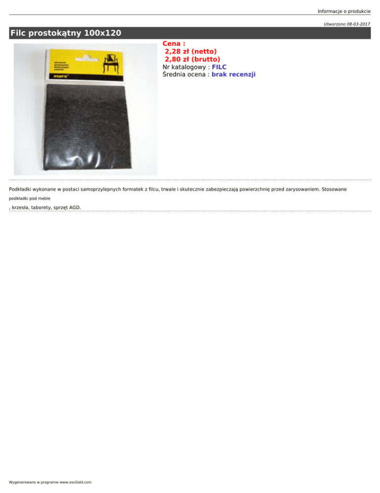 Informacje o produkcie Utworzono 08-03-2017 Filc prostokątny 100x120 Cena : 2,28 zł (netto) 2,80 zł (brutto) Nr katalogowy : FILC Średnia ocena : brak recenzji Podkładki wykonane w postaci samoprzylepnych formatek z filcu, trwale i skutecznie zabezpieczają powierzchnię przed zarysowaniem. Stosowane podkładki pod meble , krzesła, taborety, sprzęt AGD. Wygenerowano w programie www.oscGold.com