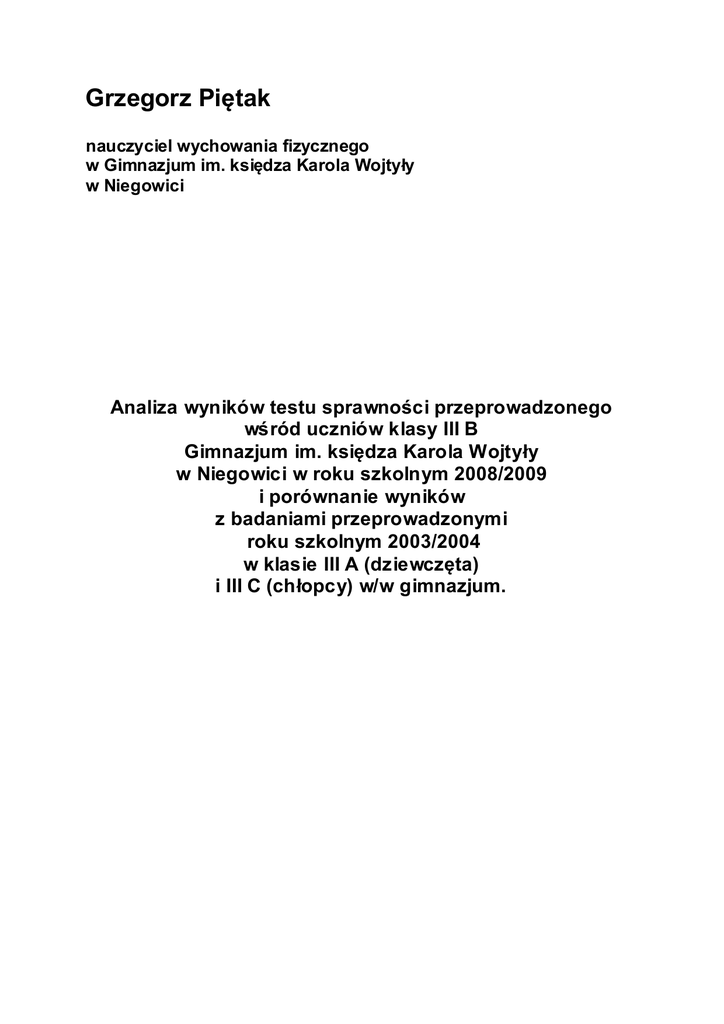Grzegorz Piętak nauczyciel wychowania fizycznego w Gimnazjum im. księdza Karola Wojtyły w Niegowici Analiza wyników testu sprawności przeprowadzonego wśród uczniów klasy III B Gimnazjum im. księdza Karola Wojtyły w Niegowici w roku szkolnym 2008/2009 i porównanie wyników z badaniami przeprowadzonymi roku szkolnym 2003/2004 w klasie III A (dziewczęta) i III C (chłopcy) w/w gimnazjum. Niegowić, dn. 30 maja 2009 r. Na wstępie przeprowadzono analizę różnic pomiędzy wynikami uzyskanymi w pierwszym i w drugim badaniu zdolności siłowych (rzut piłką lekarską w tył) w grupie dziewcząt i chłopców klasy III B w roku szkolnym 2008/2009. Tabela I. Średnie arytmetyczne i miary zmienności w badanej grupie dziewcząt i chłopców (rok szkolny 2008/2009). I badanie Różnica pomiędzy II a I badaniem II badanie Płeć x1 S R x2 S R X2-1 S % Dziewczęta kl. III B 6,52 1,17 3,9 – 8,6 7,09 1,08 5,5 – 9,3 0,56 0,57 9,81 Chłopcy kl. III B 9,7 1,62 6,0 – 13,2 10,45 2,07 6,3 – 14,3 0,75 0,77 7,34 Jak wynika z tab. I różnice pomiędzy uzyskanymi wynikami zarówno wśród dziewcząt jak i chłopców są dodatnie, co jednoznacznie określa wzrost zdolności siłowych w badanych grupach po rocznym cyklu szkolenia. Dodatkowo zostało to zilustrowane na ryc. 1. rzut piłką lekarską w tył rok szkolny 2008/2009 12,00 10,00 8,00 6,00 4,00 2,00 0,00 dziewczęta chłopcy (kolor niebieski – badanie I , kolor pomarańczowy – badanie II) Ryc. 1. Średnie wyniki uzyskane przez dziewczęta i chłopców w pierwszym i drugim badaniu (rok szkolny 2008/2009). Tabela II. Średnie arytmetyczne i miary zmienności w porównawczej grupie dziewcząt i chłopców (rok szkolny 2003/2004). Płeć x1 Dziewczęta kl. III A 6,28 Chłopcy kl. III C 7,02 I badanie S Różnica pomiędzy II a I badaniem X2-1 S % II badanie S R R x2 0,58 5,3 – 7,1 6,82 0,79 5,3 – 8,1 0,53 0,73 8,88 1,81 4,6 – 10,5 8,24 1,54 6,4 – 11,1 1,22 1,09 20,55 Poniżej przedstawiono w/w wyniki w formie graficznej. Rz ut piłk ą lek a rsk a w t ył - rok sz k . 2 0 0 3 / 2 0 0 4 9,00 8,00 7,00 6,00 5,00 4,00 3,00 2,00 1,00 0,00 d ziew częt a chło p cy (kolor niebieski – badanie I , kolor fioletowy – badanie II) Ryc. 2. Średnie wyniki uzyskane przez dziewczęta i chłopców w grupie porównawczej (rok szkolny 2003/2004). Porównując wyniki badań przeprowadzonych w roku szkolnym 2008/2009 z badaniami z roku szkolnego 2003/2004 można stwierdzić, że zarówno w jednach jak i w drugich badaniach nastąpił przyrost wartości badanej zdolności siłowej (w tym wypadku badano ją przy pomocy testu – rzut piłką lekarską w tył). Wśród dziewcząt procentowy przyrost średnich wartości uzyskanych wyników okazał się wyższy w badaniu przeprowadzonym w latach 2008/2009 i wyniósł 9,81 %, a w roku szk. 2003/04 wyniósł 8,88 %. Wśród chłopców procentowy przyrost średnich arytmetycznych wyników z roku szk. 2003/2004 był na poziomie 20,55 %, a w badaniu klasy III B (rok szkolny 2008/09) wynik procentowy wyniósł 7,34 %. Istotną różnicą jaka pojawiła się podczas porównania badań jest znaczący przyrost średnich arytmetycznych wyników uzyskiwanych przez dziewczęta i chłopców w badaniu z roku szk. 2008/09 w stosunku do badania z roku szk. 2003/04. Jak wynika z tabel średnia arytmetyczna wyników uzyskanych przez dziewczęta z kl. III B w pierwszym badaniu z roku szk. 2008/09 wynosi 6,52 metra, a badania drugiego – 7,09 m. Analogicznie wyniki badania pierwszego w roku szk. 2003/04 wyniósł 6,28 metra, a badania drugiego – 6,82 m. Wynika z tego, że zarówno w pierwszym jak i w drugim badaniu dziewczęta z klasy III B (rok szk. 2008/09) uzyskały lepsze wyniki od dziewcząt z kl. III A w roku szk. 2003/04. Poniżej zamieszczono wykres zawierający opisane dane w formie graficznej. 7,50 7,00 6,50 6,00 5,50 1 b a da n i e 1 2 b a d a ni e 2 (kolor niebieski – wyniki z roku szk. 2003/04 , kolor pomarańczowy – wyniki z roku szk. 2008/09) Ryc. 3. Porównanie średnich arytmetycznych uzyskanych wyników przez badane dziewczęta w roku szk. 2003/04 z wynikami z roku szk. 2008/09. Podobnie kształtuje się różnica wśród chłopców. Średnia arytmetyczna wyników uzyskanych przez chłopców z klasy III B w roku szk. 2008/09 w badaniu pierwszym wynosi 9,7 metra, w badaniu drugim – 10,45 m. Natomiast wyniki średnich arytmetycznych wyników rzutu piłką lekarską w tył przez chłopców w roku szk. 2003/04 kształtowały się następująco: badanie I – 7,02 metra, badania II – 8,24 m. Na podstawie tych badań można stwierdzić, iż średnie arytmetyczne wyników uzyskanych przez chłopców w roku szkolnym 2008/09 są znacząco wyższe od wyników uzyskanych przez grupę chłopców badaną w roku 2003/04 zarówno podczas pierwszego jak i drugiego badania. Poniżej przedstawiono dane w formie graficznej. 12,00 10,00 8,00 6,00 4,00 2,00 0,00 1 2 badanie 1 badanie 2 (kolor niebieski – wyniki z roku szk. 2003/04 , kolor pomarańczowy – wyniki z roku szk. 2008/09) Ryc. 4. Porównanie średnich arytmetycznych uzyskanych wyników przez badanych chłopców w roku szk. 2003/04 z wynikami z roku szk. 2008/09. Następnie porównano poziom rozwoju zdolności siłowych badanych za pomocą testu – skok w dal z miejsca. Podobnie jak przy rzucie piłką lekarską badania przeprowadzono dwukrotnie, na początku i pod koniec cyklu szkoleniowego. Wyniki w grupie dziewcząt i chłopców przedstawiono w tabeli III. Tabela III. Średnie arytmetyczne i miary zmienności w badanej grupie dziewcząt i chłopców(rok szkolny 2008/2009). I badanie Płeć x1 x2 S R X2-1 S % 175 21,59 150 - 210 4,14 8,61 2,73 220,01 20,01 192 - 250 222,33 19,26 200 - 253 1,87 5,01 0,91 Dziewczęta kl. III B 171,5 Chłopcy kl. III B S Różnica pomiędzy II a I badaniem II badanie R 23,47 140 - 209 Jak wynika z tab. III wyniki kształtują się podobnie jak w teście mierzącym odległość rzutu p. lekarską w tył. Zanot