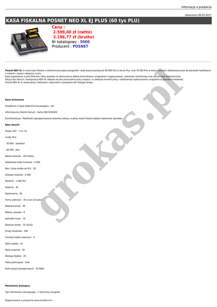 Informacje o produkcie Utworzono 08-03-2017 KASA FISKALNA POSNET NEO XL EJ PLUS (60 tys PLU) Cena : 2.599,00 zł (netto) 3.196,77 zł (brutto) Nr katalogowy : 5060 Producent : POSNET .p l Posnet NEO XL to nowa kasa fiskalna z elektroniczną kopią paragonów i dużą bazą towarową do 60 000 PLU w wersji Plus, oraz 30 000 PLU w wersji standard. Dedykowana jest do placówek handlowych o średnim i dużym natężeniu ruchu. Kasę wyposażono w port Ethernet, który pozwala na równoczesną zdalną komunikację z programem magazynowym, systemem monitoringu oraz odczyt kopii elektronicznej. Edycja baz danych i konfiguracja NEO XL odbywa się bez przerywania pracy kasjera, co zwiększa komfort pracy i efektywność wykorzystania urządzenia w placówce handlowej. Posnet NEO XL to nowoczesne, efektywne i optymalne rozwiązanie dla Twojego sklepu. Dane techniczne Urządzenia z kopią elektroniczną paragonu - tak Informatyczny Nośnik Danych - Karta 2GB SD/SDHC as Eurofiskalizacja - Możliwość zaprogramowania dowolnej waluty, w jakiej moduł fiskalny będzie rejestrował sprzedaż. Bazy danych Stawki VAT - 7 (A...G) Liczba PLU: - 30 000 - standard Nazwa towarów - 40 znaków Dodatkowe kody kreskowe - 6 000 Max. liczba kodów do PLU - 20 Zestawy towarów - 6 000 Notatnik - 1 000 PLU gr Kasjerzy - 35 ok - 60 000 - plus Opakowania - 65 Formy płatności - 35 w tym 20 walut Rabaty/narzuty - 50 Rabaty czasowe - 8 Jednostki miary - 10 Klawisze skrótu - 75 (3x25) Grupy towarowe - 100 Formaty kodów ważonych - 9 Opisy wypłat - 10 Opisy towarów - 50 Obsługa błędów - 20 Kwity parkingowe - brak Bufor pozycji paragonowych - 20 0000 Mechanizm drukujący Typ mechanizmu drukującego - 1 termiczny (oryginał) Wygenerowano w programie www.oscGold.com Liczba znaków w wierszu - 40 Szerokość papieru - 57mm Długość rolki papieru - 100m Szybkość wydruku - 20 linii/s Obcinacz papieru – brak Wyświetlacze Wyświetlacz operatora - Graficzny 4x24 znaki Wyświetlacz klienta - LCD 2x16 alfanumeryczny Liczba klawiszy klawiatury - 56 w tym 25 programowalnych (trzy poziomy) Komunikacja Porty standardowe - 4xRS232 Porty dodatkowe - 2 x RS232, 1 x PS2 (po zastosowaniu Multipleksera) Szuflada - 6V, 12V, 18V, 24V as - Ethernet .p l Klawiatura ok Obsługiwane urządzenia - komputer, modem, skaner, waga, pinpad, weryfikator cen, drukarka paragonowa, multiplekser, szuflada Komunikacja z komputerem – ON-LINE bez przerywania pracy kasjera Zasilanie - Zasilacz zewnętrzny - 230V / 24V / 2,08A gr - Wbudowany akumulator zapewniający wydruk min. 6000 linii Wymiary, waga, temeratury Wymiary - 314 x 147 x 368 mm (szer. x wys. dł.) Waga ~4,4kg Zakres temperatur pracy: 5 – 40oC Inne Wyposażenie dodatkowe Szuflada kasowa Posnet SKL Szuflada kasowa flip-top Szuflada kasowa duża i średnia Multiplekser Silikonowa osłona klawiatury Informacje o produkcie Najważniejsze funkcje - Ethernet (100 Mb) – komunikacja On-line bez przerywania pracy kasjera - Baza towarowa 60 000 PLU – programowanie do 6 800 PLU / min. - 100 metrowa rolka papieru - Konfigurowalne napięcie sterowania szufladą (6V, 12V, 18V, 24V) - Pełna obsługa kasy w trybie fiskalnym z poziomu aplikacji komputerowej (bazy danych i konfiguracja) - Duża, programowalna klawiatura z trzema poziomami klawiszy skrótu - Rozbudowane funkcje kasjerskie (deklaracja stanu i weryfikacja utargu, maksymalna wartość dla paragonu oraz produktu, etc.) - Tryb sprzedaży z widoczną nazwą towaru, tj. definiowaniem ilości, ceny, numeru PLU i rabatu - Obsługa kart lojalnościowych i rabatowych bezpośrednio na kasie lub z autoryzacją systemu zewnętrznego - Przypominanie o obowiązkowym przeglądzie technicznym i niewykonanym raporcie dobowym gr ok as - Możliwość wstrzymania sprzedaży, gdy nie wykonano raportu dobowego .p l - Możliwość integracji z dowolnym systemem wideomonitoringu sklepowego Wygenerowano w programie www.oscGold.com