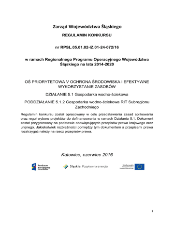 Zarząd Województwa Śląskiego REGULAMIN KONKURSU nr RPSL.05.01.02-IZ.01-24-072/16 w ramach Regionalnego Programu Operacyjnego Województwa Śląskiego na lata 2014-2020 OŚ PRIORYTETOWA V OCHRONA ŚRODOWISKA I EFEKTYWNE WYKORZYSTANIE ZASOBÓW DZIAŁANIE 5.1 Gospodarka wodno-ściekowa PODDZIAŁANIE 5.1.2 Gospodarka wodno-ściekowa RIT Subregionu Zachodniego Regulamin konkursu został opracowany w celu przedstawienia zasad aplikowania oraz reguł wyboru projektów do dofinansowania w ramach Działania 5.1. Dokument został przygotowany na podstawie obowiązujących przepisów prawa krajowego oraz unijnego. Jakiekolwiek rozbieżności pomiędzy tym dokumentem a przepisami prawa rozstrzygać należy na rzecz przepisów prawa. Katowice, czerwiec 2016 1 Spis treści 1. Podstawy prawne ............................................................................................................................. 6 1.1 Podstawy prawne udzielania pomocy publicznej w ramach konkursu. ............................ 7 2. Podstawowe informacje o konkursie ............................................................................................. 9 2.1 Założenia ogólne ....................................................................................................................... 9 2.1.1 Ograniczenia i limity w realizacji projektów, w tym również szczególne warunki dostępu dla konkursu ...................................................................................................................... 9 2.2 Typy projektów możliwych do realizacji w ramach konkursu ........................................... 10 2.3 Podmioty uprawnione do ubiegania się o dofinansowanie .............................................. 10 2.4 Wymagania dotyczące partnerstwa w projekcie ................................................................ 10 2.5 Grupa docelowa ...................................................................................................................... 11 2.6 Kwota środków przeznaczonych na dofinansowanie projektów...................................... 11 2.7 Forma, miejsce i sposób złożenia wniosku o dofinansowanie......................................... 12 3. Wskaźniki pomiaru stopnia osiągnięcia założeń konkursu ...................................................... 14 4. Kryteria wyboru projektów............................................................................................................. 19 4.1 Ocena formalna ....................................................................................................................... 19 4.2 Ocena merytoryczna .............................................................................................................. 24 4.3 Kryteria zgodności ze Strategią ZIT/RIT ............................................................................. 36 5. Procedura oceny i wyboru projektów do dofinansowania ....................................................... 46 5.1 Rozstrzygnięcie konkursu ...................................................................................................... 49 5.2 Procedura odwoławcza .......................................................................................................... 51 6. Kwalifikowalność wydatków w ramach konkursu ...................................................................... 51 7. Wymagania dotyczące realizacji zasady równości szans i niedyskryminacji, w tym dostępności dla osób z niepełnosprawnością oraz zasady równości szans kobiet i mężczyzn 52 8. Umowa o dofinansowanie ............................................................................................................. 53 8.1 Warunki zawarcia umowy o dofinansowanie ...................................................................... 54 8.2 Zabezpieczenie prawidłowej realizacji umowy o dofinansowanie ................................... 55 9. Dodatkowe informacje ................................................................................................................... 57 10. Forma i sposób udzielania Wnioskodawcy wyjaśnień w kwestiach dotyczących konkursu 59 11. Załączniki....................................................................................................................................... 61 2 Wykaz skrótów 1. EFRR – Europejski Fundusz Rozwoju Regionalnego 2. ePUAP – elektroniczna Platforma Usług Administracji Publicznej dostępna pod adresem http://epuap.gov.pl; 3. IOK- Instytucja Organizująca Konkurs- Zarząd Województwa Śląskiego/ Śląskie Centrum Przedsiębiorczości/ Wojewódzki Urząd Pracy w Katowicach; 4. IZ RPO WSL – Instytucja Zarządzająca Regionalnym Programem Operacyjnym Województwa Śląskiego na lata 2014 – 2020; 5. IP RPO WSL – Instytucja Pośrednicząca Regionalnego Programu Operacyjnego Województwa Śląskiego na lata 2014 – 2020; 6. IZ – Instytucja Zarządzająca; 7. JST – Jednostka Samorządu Terytorialnego; 8. KOP – Komisja Oceny Projektów; 9. LSI 2014 – Lokalny system informatyczny RPO WSL 2014-2020, wersja szkoleniowa dostępna jest pod adresem: https://lsi-szkol.slaskie.pl, natomiast wersja produkcyjna pod adresem: https://lsi.slaskie.pl 10. SEKAP – System Elektronicznej Komunikacji Administracji Publicznej dostępnej pod adresem https://www.sekap.pl; 11. SZOOP - Szczegółowy Opis Osi Priorytetowych dla Regionalnego Programu Operacyjnego Województwa Śląskiego na lata 2014-2020; 12. ZIT/RIT – Zintegrowane Inwestycje Terytorialne/Regionalne Inwestycje Terytorialne (jeśli dotyczy). 3 Słownik pojęć 1. Awaria krytyczna LSI 2014 - rozumiana jako nieprawidłowości w działaniu po stronie systemu uniemożliwiające korzystanie użytkownikom z podstawowych usług1 w zakresie naborów, potwierdzonych przez IOK. 2. Braki formalne – uchybienia we właściwym przygotowaniu dokumentacji aplikacyjnej, w tym poprawnym ustaleniu poziomu (%) dofinansowania, kwalifi
