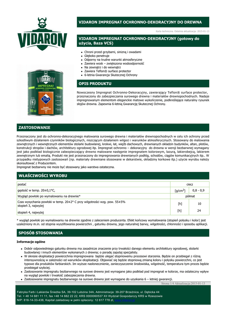 VIDARON IMPREGNAT OCHRONNO-DEKORACYJNY DO DREWNA Karta techniczna. Ostatnia aktualizacja: 2015-01-13 VIDARON IMPREGNAT OCHRONNO-DEKORACYJNY (gotowy do użycia, Baza VCS) Chroni przed grzybami, sinizną i owadami Głęboko penetruje Odporny na trudne warunki atmosferyczne Zawiera wosk – zwiększona wodoodporność Na zewnątrz i do wewnątrz Zawiera Teflon® surface protector 6-letnia Gwarancja Skutecznej Ochrony OPIS PRODUKTU Nowoczesny Impregnat OchronnoDekoracyjny, zawierający Teflon® surface protector, przeznaczony do zabezpieczania surowego drewna i materiałów drewnopochodnych. Nadaje impregnowanym elementom eleganckie matowe wykończenie, podkreślające naturalny rysunek słojów drewna. Zapewnia 6letnią Gwarancję Skutecznej Ochrony. ZASTOSOWANIE Przeznaczony jest do ochronnodekoracyjnego malowania surowego drewna i materiałów drewnopochodnych w celu ich ochrony przed szkodliwym działaniem czynników biologicznych, niszczącym działaniem wilgoci i warunków atmosferycznych. Stosowany do malowania zewnętrznych i wewnętrznych elementów stolarki budowlanej, krokwi, łat, więźb dachowych, drewnianych okładzin budynków, altan, płotów, konstrukcji stropów i dachów, architektury ogrodowej itp. Impregnat ochronno – dekoracyjny do drewna w wersji bezbarwnej wymagany jest jako podkład biologicznie zabezpieczający drewno malowane następnie impregnatem kolorowym, lazurą, lakierobejcą, lakierem zewnętrznym lub emalią. Produkt nie jest przeznaczony do impregnowania drewnianych podłóg, schodów, ciągów komunikacyjnych itp.. W przypadku nietypowych zastosowań (np. materiały drewniane stosowane w dekarstwie, okładziny korkowe itp.) użycie wyrobu należy skonsultować z Producentem. Impregnat bezbarwny nie może być stosowany jako warstwa ostateczna. WŁAŚCIWOŚCI WYROBU ciecz postać gęstość w temp. 20±0,1°C, [g/cm3] Wygląd powłoki po wymalowaniu na drewnie* Czas wysychania powłoki w temp. 20±2° C przy wilgotności wzg. pow. 55±5% stopień 3, najwyżej stopień 4, najwyżej 0,8 - 0,9 półmat [h] 10 [h] 24 * wygląd powłoki po wymalowaniu na drewnie zgodnie z zaleceniem producenta. Efekt końcowy wymalowania (stopień połysku i kolor) jest uzależniony m.in. od stopnia wyszlifowania powierzchni , gatunku drewna, jego naturalnej barwy, wilgotności, chłonności i sposobu aplikacji. SPOSÓB STOSOWANIA Informacje ogólne Dobór odpowiedniego gatunku drewna ma zasadnicze znaczenie przy trwałości danego elementu architektury ogrodowej, stolarki budowlanej i innych elementów wykonanych z drewna; o poradę zapytaj specjalisty. W okresie eksploatacji powierzchnia impregnowana będzie ulegać stopniowemu procesowi starzenia. Będzie on przebiegał z różną intensywnością w zależności od warunków eksploatacji. Objawiać się będzie stopniową zmianą koloru i połysku powierzchni, co jest typowe dla produktów farbiarskich. Im wyższe nasłonecznienie, zanieczyszczenie środowiska, wilgotność, temperatura tym proces będzie przebiegał szybciej. Zastosowanie impregnatu bezbarwnego na surowe drewno jest wymagane jako podkład pod impregnat w kolorze, ma ostateczny wpływ na wygląd powłoki i trwałość zabezpieczenia drewna. Zastosowanie impregnatu bezbarwnego na surowe drewno jest wymagane do uzyskania 6 – letniej gwarancji. Strona 1/4 Aktualizacja:2015-01-13 Fabryka Farb i Lakierów Śnieżka SA, 39102 Lubzina 34A, Administracja: 39207 Brzeźnica, ul. Dębicka 44 Tel. + 48 14 681 11 11, fax +48 14 682 22 22, KRS 0000060537 XII Wydział Gospodarczy KRS w Rzeszowie NIP: 8181433438, Kapitał zakładowy w pełni opłacony: 12 617 778 zł, www.vidaron.pl Impregnat ma działanie zabezpieczające i zapobiegawcze biokorozji (nie zwalcza owadów, grzybów i pleśni we wcześniej zakażonym drewnie). Czasy schnięcia uzależnione są od ilości warstw, temperatury, wilgotności podłoża i otoczenia oraz gatunku drewna. Nie zalecany jest do drewna twardego i egzotycznego. Dobór odpowiedniego gatunku drewna ma zasadnicze znaczenie przy trwałości danego elementu architektury ogrodowej, stolarki budowlanej i innych elementów wykonanych z drewna; o poradę zapytaj specjalisty. Przygotowanie podłoża Surowe drewno przeznaczone do impregnowania powinno być oczyszczone i suche, gładkie, wolne od kurzu, tłustych i żywicznych plam. Drewno zażywiczone i zatłuszczone przemyć benzyną ekstrakcyjną, wysuszyć. Drewno powinno być wcześniej wysezonowane i wysuszone, o wilgotności nie większej niż 20%; drewno wilgotne nie wchłonie impregnatu. Drewno przeznaczone do impregnowania może być po obróbce piłowania, szlifowania, strugania, polerowania. W celu nadania ładnego wyglądu, podkreślenia rysunku słojów drewna, polepszenia właściwości aplikacyjnych, wydłużenia trwałości impregnowania oraz utrzymania powierzchni w czystości zaleca się przeszlifować drewno wzdłuż słojów papierem ściernym o gradacji ok. 120200, dodatkowo należy powierzchnię zapolerować. Powierzchnie narażone na długotrwałe osadzanie się wody i śniegu (np. czołowe powierzchnie sztachet ogrodowych) powinny być gładkie bez ubytków, wyrwań, dokładnie zapolerowane i kanty zaokrąglone. Wszystkie ostre krawędzie drewna zaokrąglić tak, aby promień wynosił minimum 2mm – umożliwia to naniesienie takiej samej ilości produktu jak na powierzchnie płaskie (produkt nie spłynie). Na powierzchniach poziomych narażonych na zaleganie wody i śniegu zaleca się wykonanie skosu minimum 15° w celu szybkiego odprowadzenia wody. Przygotowanie nowych elementów – zwrócić uwagę na uszczelnienie łączeń poszczególnych detali przedmiotu na ingerencję wody. Surowe drewno przeznaczone do impregnowania powinno być oczyszczone i suche, gładkie, wolne od kurzu, tłustych i żywicznych plam. Renowacja Powierzchnię całkowicie oczyścić ze starych powłok farb czy lakierów. Umyć, odtłuścić i osuszyć. W przypadku renowacji wcześniej impregnow