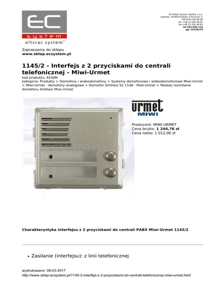 ELTCRAC System Spółka z o.o. siedziba: 30-803 Kraków ul.Ruciana 3, NIP 679-278-49-99 tel: +48 12 292 48 61 fax:+48 12 292 48 62 tel 535-999-116 gg: 35229170 Zapraszamy do sklepu www.sklep.ecsystem.pl 1145/2 - Interfejs z 2 przyciskami do centrali telefonicznej - Miwi-Urmet kod produktu: 4430M kategoria: Produkty > Domofony i wideodomofony > Systemy domofonowe i wideodomofonowe Miwi-Urmet > Miwi-Urmet - domofony analogowe > Domofon Sinthesi S2 1148 - Miwi-Urmet > Moduły rozmówne domofonu Sinthesi Miwi-Urmet Producent: MIWI-URMET Cena brutto: 1 244,76 zł Cena netto: 1 012,00 zł Charakterystyka interfejsu z 2 przyciskami do centrali PABX Miwi-Urmet 1145/2 Zasilanie (interfejsu): z linii telefonicznej wydrukowano: 08-03-2017 http://www.sklep-ecsystem.pl/1145-2-interfejs-z-2-przyciskami-do-centrali-telefonicznej-miwi-urmet.html Zasilanie (przekaźnika): 12Vdc ±2V 10 - 12Vac ±2V Max. pobór prądu (przekaźnika i ogrzewania): 300mA 12Vdc Obciążalność napięciowa przekaźnika: max. 48V @ 0.5A Obciążalność prądowa przekaźnika: max. 1A @ 30V Zakres temperatur: -20°C ÷ +50°C Normy: EN50081-1 EN50082-2 EN60950 Opis interfejsu z 2 przyciskami do centrali PABX Miwi-Urmet 1145 2 1145/2 Interfejs z dwoma przyciskami do centrali telefonicznej PABX - Miwi-Urmet Interfejs 1145/2 firmy Miwi-Urmet przeznaczony jest do obsługi centrali telefonicznej PABX. Zasilanie (interfejsu) z linii telefonicznej. Interfejs 1145/2 firmy Miwi-Urmet ma wbudowany moduł rozmówny i 2 przyciski. Wymiary interfejsu z 2 przyciskami do centrali PABX Miwi-Urmet 1145 2 104 x 153 x 16mm wydrukowano: 08-03-2017 http://www.sklep-ecsystem.pl/1145-2-interfejs-z-2-przyciskami-do-centrali-telefonicznej-miwi-urmet.html Polecamy: Unifony-słuchawki domofonowe do systemów analogowych wydrukowano: 08-03-2017 http://www.sklep-ecsystem.pl/1145-2-interfejs-z-2-przyciskami-do-centrali-telefonicznej-miwi-urmet.html Zapraszamy do kontaktu: wydrukowano: 08-03-2017 http://www.sklep-ecsystem.pl/1145-2-interfejs-z-2-przyciskami-do-centrali-telefonicznej-miwi-urmet.html