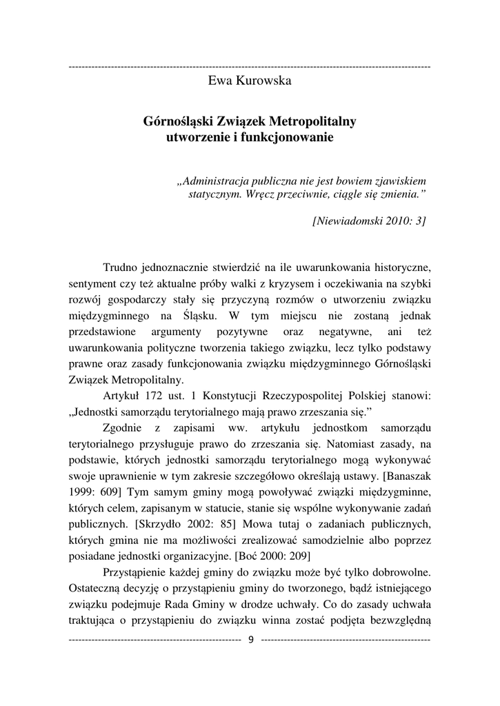 --------------------------------------------------------------------------------------------------------------- Ewa Kurowska Górnośląski Związek Metropolitalny utworzenie i funkcjonowanie „Administracja publiczna nie jest bowiem zjawiskiem statycznym. Wręcz przeciwnie, ciągle się zmienia.” [Niewiadomski 2010: 3] Trudno jednoznacznie stwierdzić na ile uwarunkowania historyczne, sentyment czy też aktualne próby walki z kryzysem i oczekiwania na szybki rozwój gospodarczy stały się przyczyną rozmów o utworzeniu związku międzygminnego na Śląsku. W tym miejscu nie zostaną jednak przedstawione argumenty pozytywne oraz negatywne, ani też uwarunkowania polityczne tworzenia takiego związku, lecz tylko podstawy prawne oraz zasady funkcjonowania związku międzygminnego Górnośląski Związek Metropolitalny. Artykuł 172 ust. 1 Konstytucji Rzeczypospolitej Polskiej stanowi: „Jednostki samorządu terytorialnego mają prawo zrzeszania się.” Zgodnie z zapisami ww. artykułu jednostkom samorządu terytorialnego przysługuje prawo do zrzeszania się. Natomiast zasady, na podstawie, których jednostki samorządu terytorialnego mogą wykonywać swoje uprawnienie w tym zakresie szczegółowo określają ustawy. [Banaszak 1999: 609] Tym samym gminy mogą powoływać związki międzygminne, których celem, zapisanym w statucie, stanie się wspólne wykonywanie zadań publicznych. [Skrzydło 2002: 85] Mowa tutaj o zadaniach publicznych, których gmina nie ma możliwości zrealizować samodzielnie albo poprzez posiadane jednostki organizacyjne. [Boć 2000: 209] Przystąpienie każdej gminy do związku może być tylko dobrowolne. Ostateczną decyzję o przystąpieniu gminy do tworzonego, bądź istniejącego związku podejmuje Rada Gminy w drodze uchwały. Co do zasady uchwała traktująca o przystąpieniu do związku winna zostać podjęta bezwzględną ----------------------------------------------------- 9 ---------------------------------------------------- --------------------------------------------------------------------------------------------------------------- większością głosów ustawowego składu rady, nie wymieniono jednak obligatoryjnych elementów takiej uchwały. Istotnym jest tutaj, iż gmina w podejmowaniu decyzji o przystąpieniu do związku winna kierować się interesem społeczności lokalnej. [Boć 2000: 209] Należy jednak zaznaczyć, iż związki międzygminne nie mogą stanowić jednostki nadrzędnej w strukturze organizacyjnej nad gminami członkowskimi. Nie mogą być instytucjami wyższego szczebla do swoich założycieli. [Banaszak 1999: 609] Ustawa z dnia 8 marca 1990 roku o samorządzie gminnym zawiera Rozdział 7 o tytule „Związki i porozumienia międzygminne” i w artykule 64 ust. 1 zawiera regulację o treści „W celu wspólnego wykonywania zadań publicznych gminy mogą tworzyć związki międzygminne”. Przed podjęciem ww. uchwał o przystąpieniu do związku międzygminnego, gminy zobowiązane są do prowadzenia konsultacji, negocjacji, których tematem są wszelkie zadania oraz cele nowotworzonego związku. [Dolnicki 1999: 137] Równocześnie każda gmina zobowiązana jest do poinformowania właściwego miejscowo wojewody o zamiarze przystąpienia do związku (art. 66 ustawy o samorządzie gminnym). Wojewoda, mimo pełnienia funkcji organu nadzoru, nie ma prawnie skutecznych możliwości, aby przeszkodzić gminie w przystąpieniu do związku. Może tylko podejmować działania w momencie podejmowania przez gminy uchwał niezgodnych z prawem. [Boć 2000: 210] Zgodnie z cytowaną ustawą związek zobowiązany jest do posiadania statutu, w którym zostaną określone: nazwa i siedziba związku; uczestnicy i czas trwania związku; zadania związku; organy związku, ich struktura, zakres i tryb działania; zasady korzystania z obiektów i urządzeń związku, zasady udziału w kosztach wspólnej działalności, zyskach i pokrywania strat związku; zasady przystępowania i występowania członków oraz zasady rozliczeń majątkowych, zasady likwidacji związku, inne zasady określające współdziałanie (art. 67 ust. 2 ustawy o samorządzie gminnym). Po ustaleniu treści statutu rozpoczyna się właściwy proces rejestracji podmiotu, który musi zostać wpisany do rejestru związków międzygminnych. Rejestr prowadzony jest przez Ministra Spraw Wewnętrznych i Administracji. Proces rejestracji związku przebiega zgodnie z Rozporządzeniem Ministra Spraw Wewnętrznych i Administracji z dnia 5 października ----------------------------------------------------- 10 ---------------------------------------------------- --------------------------------------------------------------------------------------------------------------- 2001 roku w sprawie sposobu prowadzenia związków międzygminnych oraz ogłaszania statutów związków. Zgodnie z treścią rozporządzenia gminy zgłaszają utworzenie związku za pośrednictwem wojewody. Zgłoszenie zawiera szereg załączników, które stanowią uchwały rad gmin o utworzeniu związku, uchwały rad gmin o przyjęciu statutu, statut związku, informację wojewody w sprawie zgodności z prawem wyżej wymienionych uchwał rad miejskich oraz odpisy protokołów rad gmin, w zakresie, który dotyczy trybu podejmowania uchwał w sprawie utworzenia związku oraz w sprawie przyjęcia statutu. Sam rejestr, który jest jawny, prowadzi się w formie księgi rejestrowej, zawierającej rubryki, do których wpisuje się kolejno: numer wpisu, nazwę i siedzibę związku, oznaczenie gmin przystępujących do związku, zadania związku, czas trwania związku, datę rejestracji związku, datę ogłoszenia statutu związku oraz jego zmian, datę likwidacji związku. Po dokonaniu rejestracji związku Minister właściwy do spraw administracji zawiadamia pisemnie rady gmin przystępujące do związku, wojewodę oraz właściwą miejscową regionalną izbę obrachunkową o tym fakcie. Następnie wojewoda zobowiązan