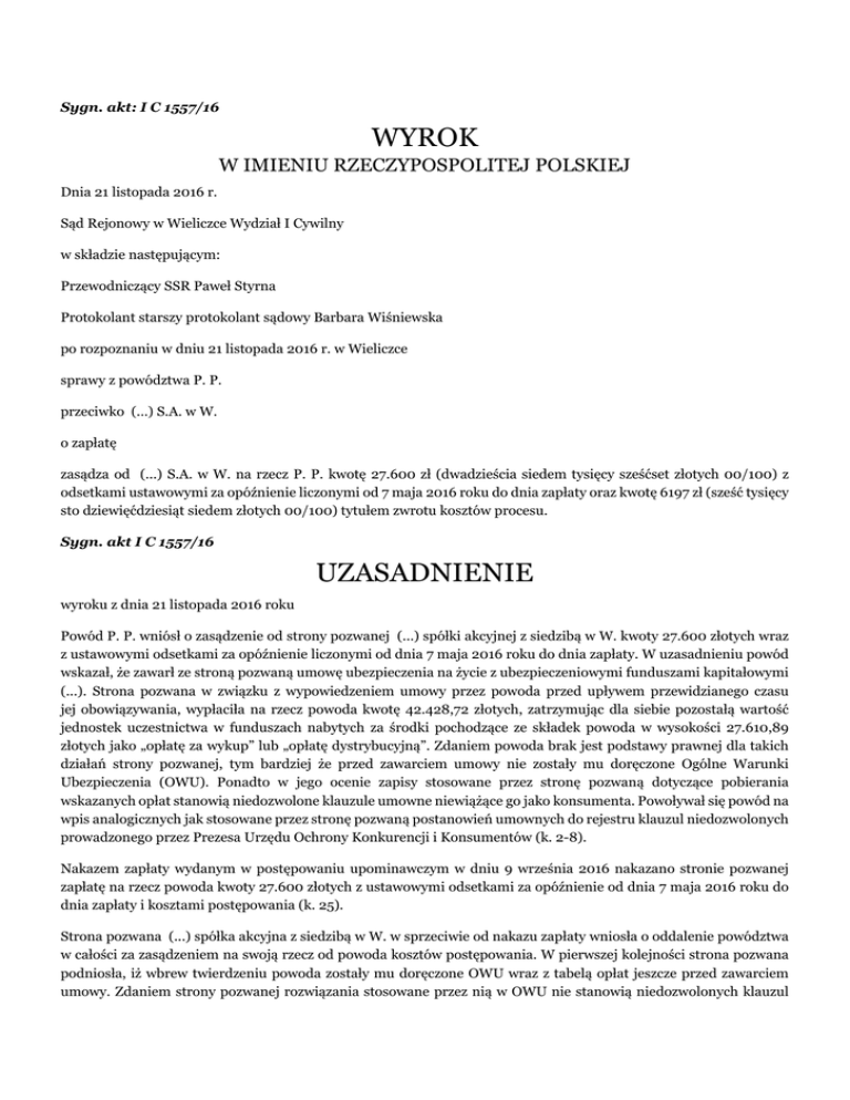 Sygn. akt: I C 1557/16 WYROK W IMIENIU RZECZYPOSPOLITEJ POLSKIEJ Dnia 21 listopada 2016 r. Sąd Rejonowy w Wieliczce Wydział I Cywilny w składzie następującym: Przewodniczący SSR Paweł Styrna Protokolant starszy protokolant sądowy Barbara Wiśniewska po rozpoznaniu w dniu 21 listopada 2016 r. w Wieliczce sprawy z powództwa P. P. przeciwko (...) S.A. w W. o zapłatę zasądza od (...) S.A. w W. na rzecz P. P. kwotę 27.600 zł (dwadzieścia siedem tysięcy sześćset złotych 00/100) z odsetkami ustawowymi za opóźnienie liczonymi od 7 maja 2016 roku do dnia zapłaty oraz kwotę 6197 zł (sześć tysięcy sto dziewięćdziesiąt siedem złotych 00/100) tytułem zwrotu kosztów procesu. Sygn. akt I C 1557/16 UZASADNIENIE wyroku z dnia 21 listopada 2016 roku Powód P. P. wniósł o zasądzenie od strony pozwanej (...) spółki akcyjnej z siedzibą w W. kwoty 27.600 złotych wraz z ustawowymi odsetkami za opóźnienie liczonymi od dnia 7 maja 2016 roku do dnia zapłaty. W uzasadnieniu powód wskazał, że zawarł ze stroną pozwaną umowę ubezpieczenia na życie z ubezpieczeniowymi funduszami kapitałowymi (...). Strona pozwana w związku z wypowiedzeniem umowy przez powoda przed upływem przewidzianego czasu jej obowiązywania, wypłaciła na rzecz powoda kwotę 42.428,72 złotych, zatrzymując dla siebie pozostałą wartość jednostek uczestnictwa w funduszach nabytych za środki pochodzące ze składek powoda w wysokości 27.610,89 złotych jako „opłatę za wykup” lub „opłatę dystrybucyjną”. Zdaniem powoda brak jest podstawy prawnej dla takich działań strony pozwanej, tym bardziej że przed zawarciem umowy nie zostały mu doręczone Ogólne Warunki Ubezpieczenia (OWU). Ponadto w jego ocenie zapisy stosowane przez stronę pozwaną dotyczące pobierania wskazanych opłat stanowią niedozwolone klauzule umowne niewiążące go jako konsumenta. Powoływał się powód na wpis analogicznych jak stosowane przez stronę pozwaną postanowień umownych do rejestru klauzul niedozwolonych prowadzonego przez Prezesa Urzędu Ochrony Konkurencji i Konsumentów (k. 2-8). Nakazem zapłaty wydanym w postępowaniu upominawczym w dniu 9 września 2016 nakazano stronie pozwanej zapłatę na rzecz powoda kwoty 27.600 złotych z ustawowymi odsetkami za opóźnienie od dnia 7 maja 2016 roku do dnia zapłaty i kosztami postępowania (k. 25). Strona pozwana (...) spółka akcyjna z siedzibą w W. w sprzeciwie od nakazu zapłaty wniosła o oddalenie powództwa w całości za zasądzeniem na swoją rzecz od powoda kosztów postępowania. W pierwszej kolejności strona pozwana podniosła, iż wbrew twierdzeniu powoda zostały mu doręczone OWU wraz z tabelą opłat jeszcze przed zawarciem umowy. Zdaniem strony pozwanej rozwiązania stosowane przez nią w OWU nie stanowią niedozwolonych klauzul umownych przede wszystkim dlatego, że „świadczenie wykupu” jest głównym świadczeniem strony pozwanej z umowy ubezpieczenia, a regulujące je postanowienia umowne sformułowane zostały w sposób jednoznaczny. Zakwestionowane przez powoda postanowienia umowne nie są też w ocenie strony pozwanej sprzeczne z dobrymi obyczajami. Przy umowie ubezpieczenia długoterminowej koszty ponoszone przez ubezpieczyciela są większe na początku obowiązywania umowy niż na jej końcu, ponadto zgodnie z przepisami regulującymi zasady rachunkowości zakładów ubezpieczeń strona pozwana jest zobowiązana rozliczyć koszty akwizycji umowy ubezpieczenia w momencie jej rozwiązania, a powinny być one pokryte z wpłaconych przez powoda składek. Strona pozwana podnosiła nadto, że umowa z powodem miała charakter długoterminowy, zaś wypłata całej zgromadzonej na jej rachunku kwoty wiązałaby się ze stratą finansową po stronie ubezpieczyciela. Wysokość wypłaconego powodowi świadczenia jest adekwatna do kosztów poniesionych przez stronę pozwaną z uwzględnieniem momentu, w którym doszło do rozwiązania umowy. Strona pozwana zakwestionowała też zasadność odwoływania się przez powoda do wyroków Sądu Ochrony Konkurencji i Konsumentów w przedmiocie uznania za niedozwolone klauzul stosowanych przez inne podmioty działające na rynku ubezpieczeń (k. 28-34). Bezsporne w niniejszej sprawie było to, że: Powoda wiązała ze stroną pozwaną umowa ubezpieczenia na życie z ubezpieczeniowymi funduszami kapitałowymi (...). Sąd ustalił następujący stan faktyczny: W dniu 18 listopada 2013 roku powód złożył do osoby wykonującej czynności agencyjne w imieniu strony pozwanej wniosek o zawarcie umowy ubezpieczenia na życie z ubezpieczeniowymi funduszami kapitałowymi (...). Wniosek powoda o zawarcie umowy wpłynął do siedziby strony pozwanej w dniu 21 listopada 2013 roku. Powód pisemnie potwierdził, że w dacie podpisania wniosku otrzymał OWU oznaczone kodem (...)(...) wraz z załącznikami nr 1, 2 i 3. We wniosku o zawarcie umowy powód zobowiązał się do uiszczania corocznych składek w wysokości po 24.000 złotych. Dowód: wniosek o zawarcie umowy (k. 36). Dowodem zawarcia przez strony umowy stała się polisa nr (...). Na odwrotnej stronie doręczonej powodowi polisy zawarto „Tabelę opłat i limitów” stanowiącą wyciąg z załącznika nr 1 do OWU. Wskazano w tej tabeli m. in. że strona pozwana pobiera „opłatę dystrybucyjną” w wysokości określonej jako procent wartości składki pierwszorocznej: w pierwszym i drugim roku polisy – 120%, w trzecim i czwartym – 115%, w piątym i szóstym – 110%, w siódmym i następnych latach polisy do końca okresu składkowego lub okresu utrzymania umowy – 100%, a po zakończeniu okresu utrzymania umowy – 0%. Dowód: polisa (k. 12). Umowa ubezpieczenia została rozwiązana z dniem 22 grudnia 2015 roku. Jednostki uczestnictwa nabyte ze środków pochodzących ze składek uiszczonych przez powoda zostały umorzone, a ich wartość na ten dzień wynosiła 46.217,90 złotych – na „umowie głównej” i 23.821,71 z