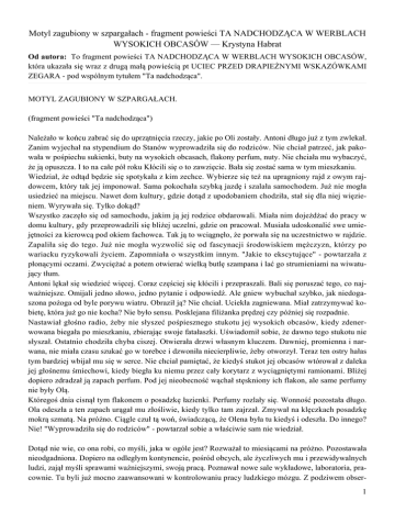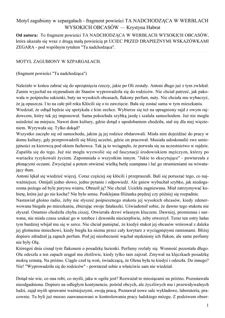 Motyl zagubiony w szpargałach - fragment powieści TA NADCHODZĄCA W WERBLACH WYSOKICH OBCASÓW — Krystyna Habrat Od autora: To fragment powieści TA NADCHODZĄCA W WERBLACH WYSOKICH OBCASÓW, która ukazała się wraz z drugą małą powieścią pt UCIEC PRZED DRAPIEŻNYMI WSKAZÓWKAMI ZEGARA - pod wspólnym tytułem "Ta nadchodząca". MOTYL ZAGUBIONY W SZPARGAŁACH. (fragment powieści "Ta nadchodząca") Należało w końcu zabrać się do uprzątnięcia rzeczy, jakie po Oli zostały. Antoni długo już z tym zwlekał. Zanim wyjechał na stypendium do Stanów wyprowadziła się do rodziców. Nie chciał patrzeć, jak pakowała w pośpiechu sukienki, buty na wysokich obcasach, flakony perfum, nuty. Nie chciała mu wybaczyć, że ją opuszcza. I to na całe pół roku Kłócili się o to zawzięcie. Bała się zostać sama w tym mieszkaniu. Wiedział, że odtąd będzie się spotykała z kim zechce. Wybierze się też na upragniony rajd z owym rajdowcem, który tak jej imponował. Sama pokochała szybką jazdę i szalała samochodem. Już nie mogła usiedzieć na miejscu. Nawet dom kultury, gdzie dotąd z upodobaniem chodziła, stał się dla niej więzieniem. Wyrywała się. Tylko dokąd? Wszystko zaczęło się od samochodu, jakim ją jej rodzice obdarowali. Miała nim dojeżdżać do pracy w domu kultury, gdy przeprowadzili się bliżej uczelni, gdzie on pracował. Musiała udoskonalić swe umiejętności za kierowcą pod okiem fachowca. Tak ją to wciągnęło, że porwała się na uczestnictwo w rajdzie. Zapaliła się do tego. Już nie mogła wyzwolić się od fascynacji środowiskiem mężczyzn, którzy po wariacku ryzykowali życiem. Zapomniała o wszystkim innym. "Jakie to ekscytujące" - powtarzała z płonącymi oczami. Zwyciężać a potem otwierać wielką butlę szampana i lać go strumieniami na wiwatujący tłum. Antoni lękał się wiedzieć więcej. Coraz częściej się kłócili i przepraszali. Bali się poruszać tego, co najważniejsze. Omijali jedno słowo, jedno pytanie i odpowiedź. Ale gniew wybuchał szybko, jak niedogaszona pożoga od byle porywu wiatru. Obraził ją? Nie chciał. Uciekła zagniewana. Miał zatrzymywać kobietę, która już go nie kocha? Nie było sensu. Posklejana filiżanka prędzej czy później się rozpadnie. Nastawiał głośno radio, żeby nie słyszeć pośpiesznego stukotu jej wysokich obcasów, kiedy zdenerwowana biegała po mieszkaniu, zbierając swoje fatałaszki. Uświadomił sobie, że dawno tego stukotu nie słyszał. Ostatnio chodziła chyba ciszej. Otwierała drzwi własnym kluczem. Dawniej, promienna i narwana, nie miała czasu szukać go w torebce i dzwoniła niecierpliwie, żeby otworzył. Teraz ten ostry hałas tym bardziej wbijał mu się w serce. Nie chciał pamiętać, że kiedyś stukot jej obcasów wtórował z daleka jej głośnemu śmiechowi, kiedy biegła ku niemu przez cały korytarz z wyciągniętymi ramionami. Bliżej dopiero zdradzał ją zapach perfum. Pod jej nieobecność wąchał stęskniony ich flakon, ale same perfumy nie były Olą. Któregoś dnia cisnął tym flakonem o posadzkę łazienki. Perfumy rozlały się. Wonność pozostała długo. Ola odeszła a ten zapach urągał mu złośliwie, kiedy tylko tam zajrzał. Zmywał na klęczkach posadzkę mokrą szmatą. Na próżno. Ciągle czuł tą woń, świadczącą, że Olena była tu kiedyś i odeszła. Do innego? Nie! "Wyprowadziła się do rodziców" - powtarzał sobie a właściwie sam nie wiedział. Dotąd nie wie, co ona robi, co myśli, jaka w ogóle jest? Rozważał to miesiącami na próżno. Pozostawała nieodgadniona. Dopiero na odległym kontynencie, pośród obcych, ale życzliwych mu i przewidywalnych ludzi, zajął myśli sprawami ważniejszymi, swoją pracą. Poznawał nowe sale wykładowe, laboratoria, pracownie. Tu byli już mocno zaawansowani w kontrolowaniu pracy ludzkiego mózgu. Z podziwem obser1 wował, jak działa komputer sterowany samą myślą człowieka, bez udziału rąk. Albo w jaki sposób pomaga osobie nie władającej nawet nogami, analizując impulsy z jej mózgu i przekładając je na ruchy kursora na ekranie. Ileż w tym możliwości dla chorych z uszkodzeniem systemu nerwowego! Nadzieja dla chorych na schizofrenię i Parkinsona! Słuchał, oglądał, dyskutował, notował. Głowa rosła mu od wrażeń i pomysłów. Czasem tylko obudziwszy się w środku nocy powtarzał sobie półgłosem a potem zapisywał to wielkim literami: SZCZĘŚCIE NIE JEST DO NICZEGO POTRZEBNE. MIŁOŚĆ TEŻ NIE JEST POTRZEBNA. TYLKO PRACA. Przywoływał te słowa i w ciągu dnia, ile razy coś, gdzieś, za nim szeptało o innych stronach życia. Powtarzał to sobie uparcie i stawał się bardziej spokojny. UCZONEMU NIEPOTRZEBNE SZCZĘŚCIE. TYLKO SPOKÓJ DO PRACY. Ilekroć słyszał gdzieś w pobliżu szybkie stukanie obcasów, mówił sobie: PRZECIEŻ JEJ NIGDY NIE BYŁO! Człowieku, tylko wysnułeś ją sobie z rozmyślań, gdy siedziałeś samotnie w kawiarni w przerwie pomiędzy zajęciami ze studentami, albo w pustce pokoju w hotelu asystentów, kiedy oczy znużyły się już wkuwaniem obcych słówek. TY JĄ SOBIE TYLKO WYMYŚLIŁEŚ! Wcześniej, zanim wyjechał na stypendium, przyszło mu zobaczyć to, o czym Olena śniła latami - jej występ na scenie kabaretu. Poszedł tam, choć od trzech tygodni mieszkała już u swych rodziców. Usiadł z tyłu, skulił się i spuścił głowę, żeby go nie widziała. Później nie pamiętał, o czym to wszystko było, kto występował przed nią. Czekał tylko na nią przepełniony tysiącami sprzecznych uczuć, których nie mógł zwalczyć - żalem do niej, strachem o jej powodzenie, zazdrością, miłością, nienawiścią... Wreszcie ukazała się. Ona, a jakby nie ona. Mniejsza, onieśmielona, bezbronna. Z przerażeniem słuchał, jak zaczęła mówić nieswoim, cieniutkim głosikiem, jak piskliwie śpiewała. Zżerała ją straszna trema! Czuł, jak się sili, a wychodziło coraz go