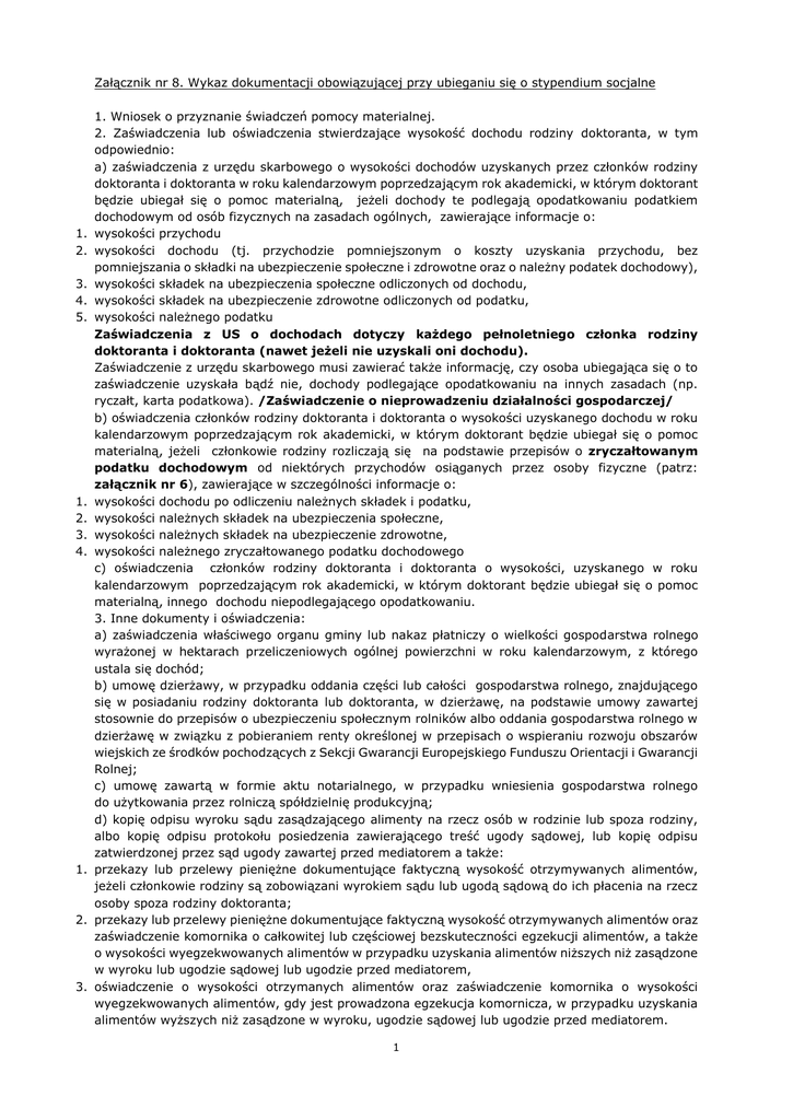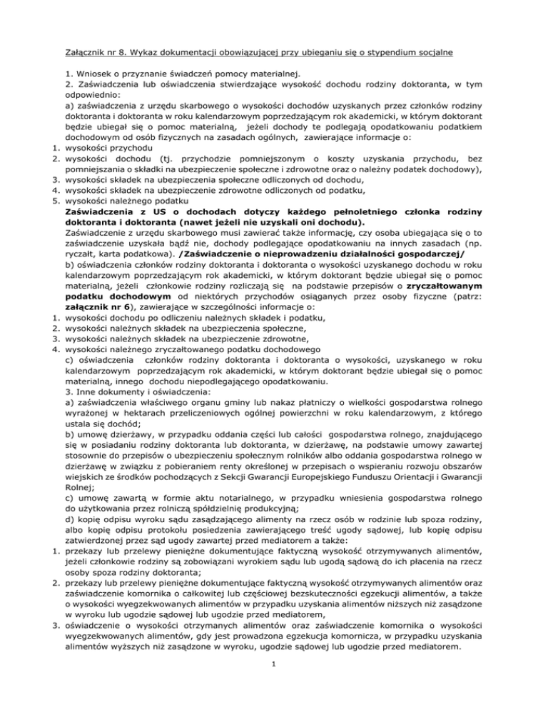 Załącznik nr 8. Wykaz dokumentacji obowiązującej przy ubieganiu się o stypendium socjalne 1. 2. 3. 4. 5. 1. 2. 3. 4. 1. 2. 3. 1. Wniosek o przyznanie świadczeń pomocy materialnej. 2. Zaświadczenia lub oświadczenia stwierdzające wysokość dochodu rodziny doktoranta, w tym odpowiednio: a) zaświadczenia z urzędu skarbowego o wysokości dochodów uzyskanych przez członków rodziny doktoranta i doktoranta w roku kalendarzowym poprzedzającym rok akademicki, w którym doktorant będzie ubiegał się o pomoc materialną, jeżeli dochody te podlegają opodatkowaniu podatkiem dochodowym od osób fizycznych na zasadach ogólnych, zawierające informacje o: wysokości przychodu wysokości dochodu (tj. przychodzie pomniejszonym o koszty uzyskania przychodu, bez pomniejszania o składki na ubezpieczenie społeczne i zdrowotne oraz o należny podatek dochodowy), wysokości składek na ubezpieczenia społeczne odliczonych od dochodu, wysokości składek na ubezpieczenie zdrowotne odliczonych od podatku, wysokości należnego podatku Zaświadczenia z US o dochodach dotyczy każdego pełnoletniego członka rodziny doktoranta i doktoranta (nawet jeżeli nie uzyskali oni dochodu). Zaświadczenie z urzędu skarbowego musi zawierać także informację, czy osoba ubiegająca się o to zaświadczenie uzyskała bądź nie, dochody podlegające opodatkowaniu na innych zasadach (np. ryczałt, karta podatkowa). /Zaświadczenie o nieprowadzeniu działalności gospodarczej/ b) oświadczenia członków rodziny doktoranta i doktoranta o wysokości uzyskanego dochodu w roku kalendarzowym poprzedzającym rok akademicki, w którym doktorant będzie ubiegał się o pomoc materialną, jeżeli członkowie rodziny rozliczają się na podstawie przepisów o zryczałtowanym podatku dochodowym od niektórych przychodów osiąganych przez osoby fizyczne (patrz: załącznik nr 6), zawierające w szczególności informacje o: wysokości dochodu po odliczeniu należnych składek i podatku, wysokości należnych składek na ubezpieczenia społeczne, wysokości należnych składek na ubezpieczenie zdrowotne, wysokości należnego zryczałtowanego podatku dochodowego c) oświadczenia członków rodziny doktoranta i doktoranta o wysokości, uzyskanego w roku kalendarzowym poprzedzającym rok akademicki, w którym doktorant będzie ubiegał się o pomoc materialną, innego dochodu niepodlegającego opodatkowaniu. 3. Inne dokumenty i oświadczenia: a) zaświadczenia właściwego organu gminy lub nakaz płatniczy o wielkości gospodarstwa rolnego wyrażonej w hektarach przeliczeniowych ogólnej powierzchni w roku kalendarzowym, z którego ustala się dochód; b) umowę dzierżawy, w przypadku oddania części lub całości gospodarstwa rolnego, znajdującego się w posiadaniu rodziny doktoranta lub doktoranta, w dzierżawę, na podstawie umowy zawartej stosownie do przepisów o ubezpieczeniu społecznym rolników albo oddania gospodarstwa rolnego w dzierżawę w związku z pobieraniem renty określonej w przepisach o wspieraniu rozwoju obszarów wiejskich ze środków pochodzących z Sekcji Gwarancji Europejskiego Funduszu Orientacji i Gwarancji Rolnej; c) umowę zawartą w formie aktu notarialnego, w przypadku wniesienia gospodarstwa rolnego do użytkowania przez rolniczą spółdzielnię produkcyjną; d) kopię odpisu wyroku sądu zasądzającego alimenty na rzecz osób w rodzinie lub spoza rodziny, albo kopię odpisu protokołu posiedzenia zawierającego treść ugody sądowej, lub kopię odpisu zatwierdzonej przez sąd ugody zawartej przed mediatorem a także: przekazy lub przelewy pieniężne dokumentujące faktyczną wysokość otrzymywanych alimentów, jeżeli członkowie rodziny są zobowiązani wyrokiem sądu lub ugodą sądową do ich płacenia na rzecz osoby spoza rodziny doktoranta; przekazy lub przelewy pieniężne dokumentujące faktyczną wysokość otrzymywanych alimentów oraz zaświadczenie komornika o całkowitej lub częściowej bezskuteczności egzekucji alimentów, a także o wysokości wyegzekwowanych alimentów w przypadku uzyskania alimentów niższych niż zasądzone w wyroku lub ugodzie sądowej lub ugodzie przed mediatorem, oświadczenie o wysokości otrzymanych alimentów oraz zaświadczenie komornika o wysokości wyegzekwowanych alimentów, gdy jest prowadzona egzekucja komornicza, w przypadku uzyskania alimentów wyższych niż zasądzone w wyroku, ugodzie sądowej lub ugodzie przed mediatorem. 1 e) decyzję właściwego organu przyznająca zaliczkę alimentacyjną z określeniem jej wysokości; (obowiązuje do 30.09.2008) f) decyzję Funduszu Alimentacyjnego o przyznaniu świadczeń z Funduszu i ich wysokości miesięcznej (obowiązuje od 1 października 2008 r.) g) odpis wyroku oddalającego powództwo o ustalenie świadczenia alimentacyjnego od drugiego z rodziców; h) kopia prawomocnego orzeczenia sądu zobowiązującego jednego z rodziców do ponoszenia całkowitych kosztów utrzymania dziecka - doktoranta; i) odpis zupełny aktu urodzenia, w przypadku gdy ojciec jest nieznany; j) informację sądu o toczącym się postępowaniu w sprawie o przysposobienie dziecka lub prawomocny wyrok sądu rodzinnego stwierdzający przysposobienie dziecka w przypadku osoby faktycznie opiekującej się dzieckiem, lub która wystąpiła o przysposobienie tego dziecka (dziecko to wlicza się wówczas do rodziny doktoranta); k) kopię odpisu prawomocnego wyroku sądu orzekającego rozwód lub separację lub ugody zawartej przed mediatorem; l) dokument określający datę utraty dochodu oraz miesięczną wysokość utraconego dochodu przez doktoranta lub członka rodziny doktoranta; m) dokument lub oświadczenie określające wysokość uzyskanego dochodu z pierwszego pełnego miesiąca zatrudnienia przez doktoranta lub członka rodziny doktoranta; n) kopię decyzji o przyznaniu stypendium doktoranckiego lub innego stypendium wykazanego jako dochód niepodlegający opodatkowaniu; o) kopię aktu zgonu rodzica(