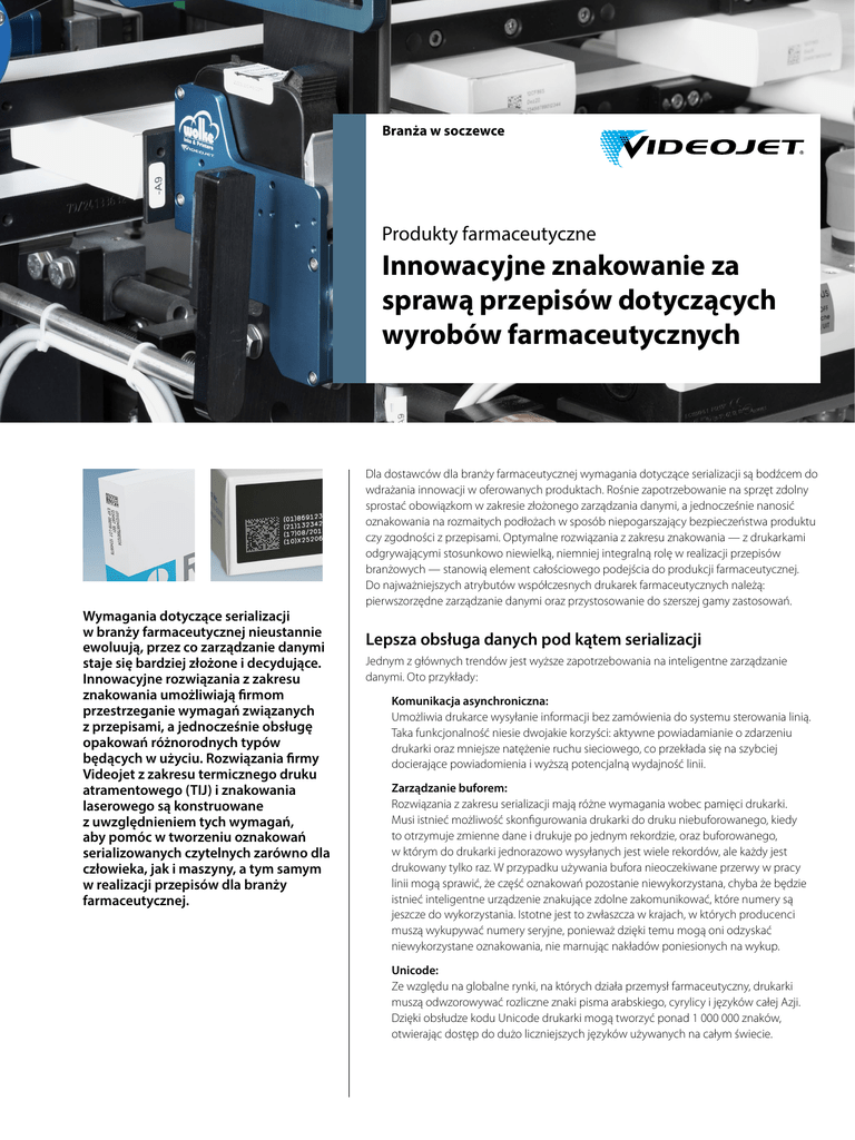 Branża w soczewce Produkty farmaceutyczne Innowacyjne znakowanie za sprawą przepisów dotyczących wyrobów farmaceutycznych Wymagania dotyczące serializacji w branży farmaceutycznej nieustannie ewoluują, przez co zarządzanie danymi staje się bardziej złożone i decydujące. Innowacyjne rozwiązania z zakresu znakowania umożliwiają firmom przestrzeganie wymagań związanych z przepisami, a jednocześnie obsługę opakowań różnorodnych typów będących w użyciu. Rozwiązania firmy Videojet z zakresu termicznego druku atramentowego (TIJ) i znakowania laserowego są konstruowane z uwzględnieniem tych wymagań, aby pomóc w tworzeniu oznakowań serializowanych czytelnych zarówno dla człowieka, jak i maszyny, a tym samym w realizacji przepisów dla branży farmaceutycznej. Dla dostawców dla branży farmaceutycznej wymagania dotyczące serializacji są bodźcem do wdrażania innowacji w oferowanych produktach. Rośnie zapotrzebowanie na sprzęt zdolny sprostać obowiązkom w zakresie złożonego zarządzania danymi, a jednocześnie nanosić oznakowania na rozmaitych podłożach w sposób niepogarszający bezpieczeństwa produktu czy zgodności z przepisami. Optymalne rozwiązania z zakresu znakowania — z drukarkami odgrywającymi stosunkowo niewielką, niemniej integralną rolę w realizacji przepisów branżowych — stanowią element całościowego podejścia do produkcji farmaceutycznej. Do najważniejszych atrybutów współczesnych drukarek farmaceutycznych należą: pierwszorzędne zarządzanie danymi oraz przystosowanie do szerszej gamy zastosowań. Lepsza obsługa danych pod kątem serializacji Jednym z głównych trendów jest wyższe zapotrzebowania na inteligentne zarządzanie danymi. Oto przykłady: Komunikacja asynchroniczna: Umożliwia drukarce wysyłanie informacji bez zamówienia do systemu sterowania linią. Taka funkcjonalność niesie dwojakie korzyści: aktywne powiadamianie o zdarzeniu drukarki oraz mniejsze natężenie ruchu sieciowego, co przekłada się na szybciej docierające powiadomienia i wyższą potencjalną wydajność linii. Zarządzanie buforem: Rozwiązania z zakresu serializacji mają różne wymagania wobec pamięci drukarki. Musi istnieć możliwość skonfigurowania drukarki do druku niebuforowanego, kiedy to otrzymuje zmienne dane i drukuje po jednym rekordzie, oraz buforowanego, w którym do drukarki jednorazowo wysyłanych jest wiele rekordów, ale każdy jest drukowany tylko raz. W przypadku używania bufora nieoczekiwane przerwy w pracy linii mogą sprawić, że część oznakowań pozostanie niewykorzystana, chyba że będzie istnieć inteligentne urządzenie znakujące zdolne zakomunikować, które numery są jeszcze do wykorzystania. Istotne jest to zwłaszcza w krajach, w których producenci muszą wykupywać numery seryjne, ponieważ dzięki temu mogą oni odzyskać niewykorzystane oznakowania, nie marnując nakładów poniesionych na wykup. Unicode: Ze względu na globalne rynki, na których działa przemysł farmaceutyczny, drukarki muszą odwzorowywać rozliczne znaki pisma arabskiego, cyrylicy i języków całej Azji. Dzięki obsłudze kodu Unicode drukarki mogą tworzyć ponad 1 000 000 znaków, otwierając dostęp do dużo liczniejszych języków używanych na całym świecie. Przystosowanie do szerszej gamy zastosowań Większość globalnych przepisów dla branży farmaceutycznej odnosi się do jednostki sprzedażnej, a wymaga, aby większa treść oznakowania była nanoszona z wyższą rozdzielczością, nawet na trudnych podłożach. W związku z tym pojawiły się innowacje w zakresie znakowania w szeregu zastosowań: Polietylen o dużej gęstości (HDPE) Buteleczki z tworzywa HDPE są niezmiernie popularnym opakowaniem wyrobów farmaceutycznych, zwłaszcza w Ameryce Północnej. Jeszcze do niedawna trudność sprawiało wykonanie oznakowań o wysokiej rozdzielczości i wysokim kontraście nadających się do odczytu maszynowego. Jednak niedawno w technologiach drukowania laserowego wdrożono innowacje polegające na wykorzystaniu fal UV, dzięki którym na tworzywie HDPE można tworzyć wyraziste, nieścieralne czarne znaki, m.in. numery seryjne i kody kreskowe 2D. Materiały nieporowate i częściowo porowate Termiczny druk atramentowy (TIJ) jest technologią często wybieraną przez klientów ze względu na zdolność znakowania z wysoką rozdzielczością przy dużych prędkościach linii. Jednak liczne produkty występują w opakowaniach nieporowatych lub częściowo porowatych, takich jak folie plastikowe, folie metalowe, tworzywa sztuczne i materiały powlekane, w przypadku których technologia TIJ wcześniej się nie sprawdzała. Osiągnięcia w dziedzinie drukarek i atramentów w technologii TIJ umożliwiły znakowanie na tych podłożach ze wszystkimi tradycyjnymi zaletami tej technologii. System laserowy Videojet 7810 tworzy trwałe oznakowania wysokiej rozdzielczości na opakowaniach z tworzywa HDPE z zastosowaniem fal UV Łańcuch chłodniczy Obsługa produktów w łańcuchu chłodniczym stanowi szybko rosnący segment rynku farmaceutycznego. Na etapie dystrybucji lub po pakowaniu proces ten może spowodować kondensację lub przypadkową ekspozycję na wilgoć, co może obniżyć jakość znakowania. Niedawno opracowane atramenty charakteryzują się lepszą odpornością na wodę niż obecnie oferowane wyroby barwnikowe, a tym samym lepszą trwałość oznakowania w łańcuchu dostaw. Opakowania wyrobów farmaceutycznych i urządzeń medycznych w większym stopniu niż opakowania w innych branżach wymagają zmiennego znakowania o najwyższej jakości. W świetle niedawno wprowadzonych przepisów jest to szczególnie aktualne. Ważna jest współpraca z dostawcą systemów znakowania, który konstruuje swoje produkty z uwzględnieniem współczesnych wyzwań, a przy tym może spełnić wymagania konkretnych projektów, dysponując stosownymi kompetencjami i globalną siecią pomocy technicznej. Zadz