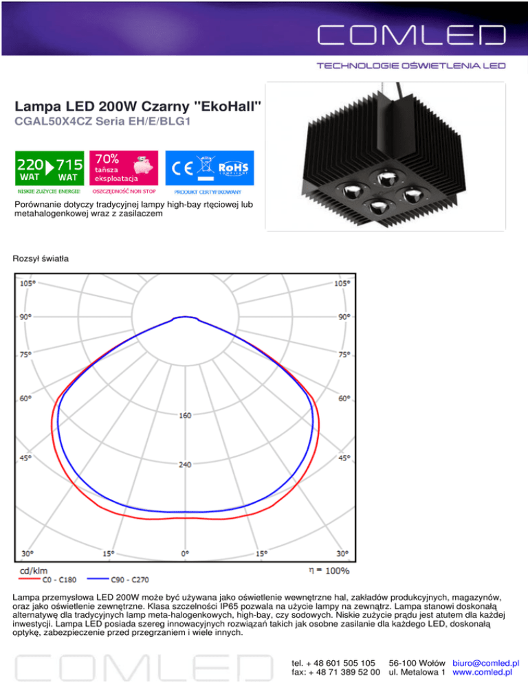Lampa LED 200W Czarny "EkoHall" CGAL50X4CZ Seria EH/E/BLG1 Porównanie dotyczy tradycyjnej lampy high-bay rtęciowej lub metahalogenkowej wraz z zasilaczem Rozsył światła Lampa przemysłowa LED 200W może być używana jako oświetlenie wewnętrzne hal, zakładów produkcyjnych, magazynów, oraz jako oświetlenie zewnętrzne. Klasa szczelności IP65 pozwala na użycie lampy na zewnątrz. Lampa stanowi doskonałą alternatywę dla tradycyjnych lamp meta-halogenkowych, high-bay, czy sodowych. Niskie zużycie prądu jest atutem dla każdej inwestycji. Lampa LED posiada szereg innowacyjnych rozwiązań takich jak osobne zasilanie dla każdego LED, doskonałą optykę, zabezpieczenie przed przegrzaniem i wiele innych. tel. + 48 601 505 105 56-100 Wołów [email protected] fax: + 48 71 389 52 00 ul. Metalowa 1 www.comled.pl Źródło światła Napięcie zasilające Częstotliwość znamionowa zasilania Współczynnik mocy BRIDGELUX G1 high power LED 4 x 50W 186-264 AC 50-60Hz >0,95 Współczynnik zniekształceń Strumień świetlny (w/g specyfikacji chip-ów LED) 30 000 lm Strumień świetlny (minus straty na optyce) 24 000 lm Zasilanie Pobór mocy (±10%) Tj 90°C Maksymalny strumień świetlny Barwa światła Współczynnik oddawania barw 30-34V 220 W 150 lm/W 6000 ÷ 6500 K (opcjonalnie od 3000 do 10000 K) Ra>75 Kąt rozsyłu światła 60° (opcjonalnie 100°) Temperatura pracy -30°C do +40°C Wilgotność otoczenia Temperatura przechowywania Trwałość źródła światła Klasa szczelności Certyfikaty Sposób montażu Wymiary zew. (dł./szer./wys.) / Waga Kolory opraw Obudowa/układ optyczny Uwagi 10% – 90% RH +10°C do +60°C >50'000h IP65 CE RoHS Hak wg specyfikacji (opcjonalnie na wysięgniku ϕ60 / ϕ48) 295x295x239mm / 10,40kg Czarny (opcjonalnie Srebrny chrom, tytan) Aluminium anodowane, szkło optyczne hartowane Lampy zostały zaprojektowane i wykonywane zgodnie z normą PN-EN 60598-1:2007 oraz spełniają standardy dyrektywy niskonapięciowej (LVD) nr 2006/95/WE idyrektywy kompatybilności elektromagnetycznej (EMC) nr 2004/108/WE. Oprawy zostały wyprodukowane bez zastosowania materiałów niebezpiecznych wyszczególnionych w dyrektywie (RoHS) nr 2002/95/WE. tel. + 48 601 505 105 56-100 Wołów [email protected] fax: + 48 71 389 52 00 ul. Metalowa 1 www.comled.pl