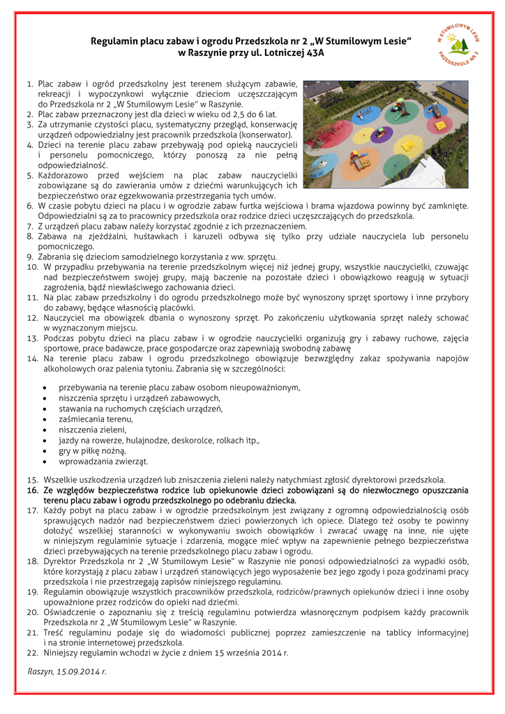 Regulamin placu zabaw i ogrodu Przedszkola nr 2 „W Stumilowym Lesie” w Raszynie przy ul. Lotniczej 43A 1. Plac zabaw i ogród przedszkolny jest terenem służącym zabawie, rekreacji i wypoczynkowi wyłącznie dzieciom uczęszczającym do Przedszkola nr 2 „W Stumilowym Lesie” w Raszynie. 2. Plac zabaw przeznaczony jest dla dzieci w wieku od 2,5 do 6 lat. 3. Za utrzymanie czystości placu, systematyczny przegląd, konserwację urządzeń odpowiedzialny jest pracownik przedszkola (konserwator). 4. Dzieci na terenie placu zabaw przebywają pod opieką nauczycieli i personelu pomocniczego, którzy ponoszą za nie pełną odpowiedzialność. 5. Każdorazowo przed wejściem na plac zabaw nauczycielki zobowiązane są do zawierania umów z dziećmi warunkujących ich bezpieczeństwo oraz egzekwowania przestrzegania tych umów. 6. W czasie pobytu dzieci na placu i w ogrodzie zabaw furtka wejściowa i brama wjazdowa powinny być zamknięte. Odpowiedzialni są za to pracownicy przedszkola oraz rodzice dzieci uczęszczających do przedszkola. 7. Z urządzeń placu zabaw należy korzystać zgodnie z ich przeznaczeniem. 8. Zabawa na zjeżdżalni, huśtawkach i karuzeli odbywa się tylko przy udziale nauczyciela lub personelu pomocniczego. 9. Zabrania się dzieciom samodzielnego korzystania z ww. sprzętu. 10. W przypadku przebywania na terenie przedszkolnym więcej niż jednej grupy, wszystkie nauczycielki, czuwając nad bezpieczeństwem swojej grupy, mają baczenie na pozostałe dzieci i obowiązkowo reagują w sytuacji zagrożenia, bądź niewłaściwego zachowania dzieci. 11. Na plac zabaw przedszkolny i do ogrodu przedszkolnego może być wynoszony sprzęt sportowy i inne przybory do zabawy, będące własnością placówki. 12. Nauczyciel ma obowiązek dbania o wynoszony sprzęt. Po zakończeniu użytkowania sprzęt należy schować w wyznaczonym miejscu. 13. Podczas pobytu dzieci na placu zabaw i w ogrodzie nauczycielki organizują gry i zabawy ruchowe, zajęcia sportowe, prace badawcze, prace gospodarcze oraz zapewniają swobodną zabawę 14. Na terenie placu zabaw i ogrodu przedszkolnego obowiązuje bezwzględny zakaz spożywania napojów alkoholowych oraz palenia tytoniu. Zabrania się w szczególności: przebywania na terenie placu zabaw osobom nieupoważnionym, niszczenia sprzętu i urządzeń zabawowych, stawania na ruchomych częściach urządzeń, zaśmiecania terenu, niszczenia zieleni, jazdy na rowerze, hulajnodze, deskorolce, rolkach itp., gry w piłkę nożną, wprowadzania zwierząt. 15. Wszelkie uszkodzenia urządzeń lub zniszczenia zieleni należy natychmiast zgłosić dyrektorowi przedszkola. 16. Ze względów bezpieczeństwa rodzice lub opiekunowie dzieci zobowiązani są do niezwłocznego opuszczania terenu placu zabaw i ogrodu przedszkolnego po odebraniu dziecka. 17. Każdy pobyt na placu zabaw i w ogrodzie przedszkolnym jest związany z ogromną odpowiedzialnością osób sprawujących nadzór nad bezpieczeństwem dzieci powierzonych ich opiece. Dlatego też osoby te powinny dołożyć wszelkiej staranności w wykonywaniu swoich obowiązków i zwracać uwagę na inne, nie ujęte w niniejszym regulaminie sytuacje i zdarzenia, mogące mieć wpływ na zapewnienie pełnego bezpieczeństwa dzieci przebywających na terenie przedszkolnego placu zabaw i ogrodu. 18. Dyrektor Przedszkola nr 2 „W Stumilowym Lesie” w Raszynie nie ponosi odpowiedzialności za wypadki osób, które korzystają z placu zabaw i urządzeń stanowiących jego wyposażenie bez jego zgody i poza godzinami pracy przedszkola i nie przestrzegają zapisów niniejszego regulaminu. 19. Regulamin obowiązuje wszystkich pracowników przedszkola, rodziców/prawnych opiekunów dzieci i inne osoby upoważnione przez rodziców do opieki nad dziećmi. 20. Oświadczenie o zapoznaniu się z treścią regulaminu potwierdza własnoręcznym podpisem każdy pracownik Przedszkola nr 2 „W Stumilowym Lesie” w Raszynie. 21. Treść regulaminu podaje się do wiadomości publicznej poprzez zamieszczenie na tablicy informacyjnej i na stronie internetowej przedszkola. 22. Niniejszy regulamin wchodzi w życie z dniem 15 września 2014 r. Raszyn, 15.09.2014 r.