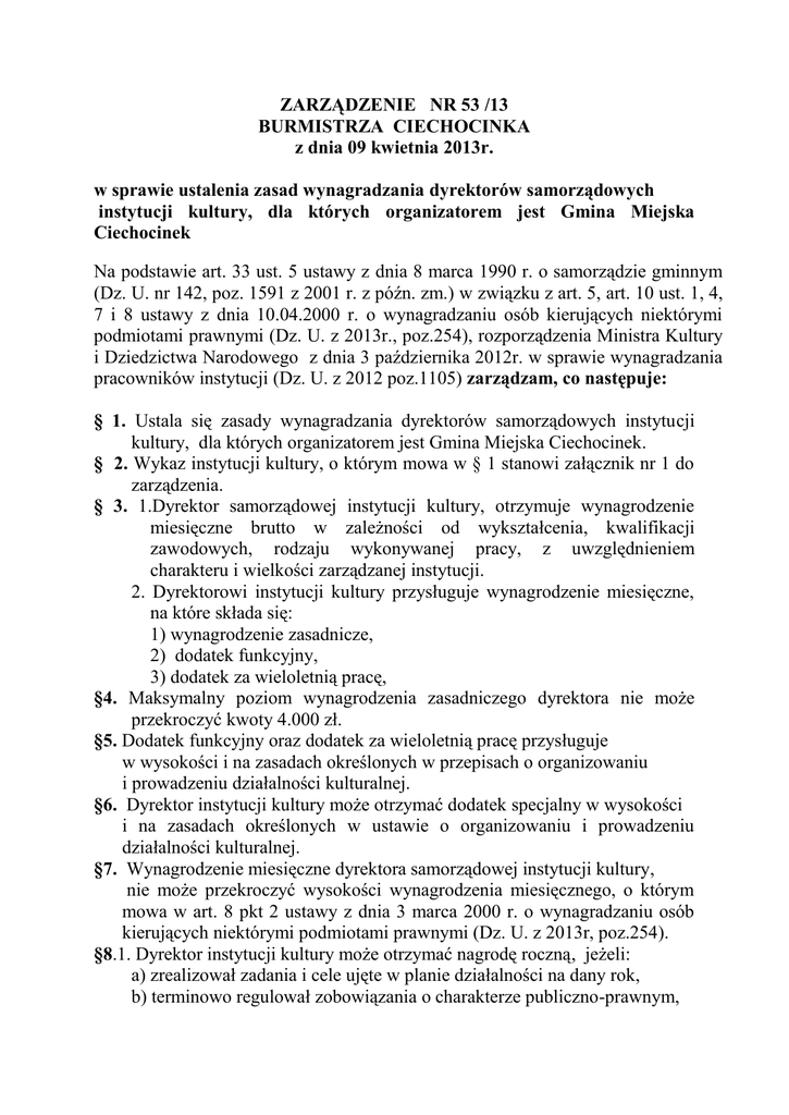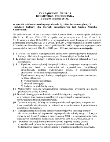 ZARZĄDZENIE NR 53 /13 BURMISTRZA CIECHOCINKA z dnia 09 kwietnia 2013r. w sprawie ustalenia zasad wynagradzania dyrektorów samorządowych instytucji kultury, dla których organizatorem jest Gmina Miejska Ciechocinek Na podstawie art. 33 ust. 5 ustawy z dnia 8 marca 1990 r. o samorządzie gminnym (Dz. U. nr 142, poz. 1591 z 2001 r. z późn. zm.) w związku z art. 5, art. 10 ust. 1, 4, 7 i 8 ustawy z dnia 10.04.2000 r. o wynagradzaniu osób kierujących niektórymi podmiotami prawnymi (Dz. U. z 2013r., poz.254), rozporządzenia Ministra Kultury i Dziedzictwa Narodowego z dnia 3 października 2012r. w sprawie wynagradzania pracowników instytucji (Dz. U. z 2012 poz.1105) zarządzam, co następuje: § 1. Ustala się zasady wynagradzania dyrektorów samorządowych instytucji kultury, dla których organizatorem jest Gmina Miejska Ciechocinek. § 2. Wykaz instytucji kultury, o którym mowa w § 1 stanowi załącznik nr 1 do zarządzenia. § 3. 1.Dyrektor samorządowej instytucji kultury, otrzymuje wynagrodzenie miesięczne brutto w zależności od wykształcenia, kwalifikacji zawodowych, rodzaju wykonywanej pracy, z uwzględnieniem charakteru i wielkości zarządzanej instytucji. 2. Dyrektorowi instytucji kultury przysługuje wynagrodzenie miesięczne, na które składa się: 1) wynagrodzenie zasadnicze, 2) dodatek funkcyjny, 3) dodatek za wieloletnią pracę, §4. Maksymalny poziom wynagrodzenia zasadniczego dyrektora nie może przekroczyć kwoty 4.000 zł. §5. Dodatek funkcyjny oraz dodatek za wieloletnią pracę przysługuje w wysokości i na zasadach określonych w przepisach o organizowaniu i prowadzeniu działalności kulturalnej. §6. Dyrektor instytucji kultury może otrzymać dodatek specjalny w wysokości i na zasadach określonych w ustawie o organizowaniu i prowadzeniu działalności kulturalnej. §7. Wynagrodzenie miesięczne dyrektora samorządowej instytucji kultury, nie może przekroczyć wysokości wynagrodzenia miesięcznego, o którym mowa w art. 8 pkt 2 ustawy z dnia 3 marca 2000 r. o wynagradzaniu osób kierujących niektórymi podmiotami prawnymi (Dz. U. z 2013r, poz.254). §8.1. Dyrektor instytucji kultury może otrzymać nagrodę roczną, jeżeli: a) zrealizował zadania i cele ujęte w planie działalności na dany rok, b) terminowo regulował zobowiązania o charakterze publiczno-prawnym, c) gospodarował środkami dotacji w sposób celowy, oszczędny i zgodny z prawem (brak nieprawidłowości wykorzystania dotacji stwierdzonych przez kontrole). 2. Dyrektor, który nie przepracował całego roku kalendarzowego ma prawo do nagrody rocznej w wysokości proporcjonalnej do okresu pracy pod warunkiem, że okres ten wynosi co najmniej 6 miesięcy. 3. Przepracowanie co najmniej 6 miesięcy warunkujących nabycie do nagrody rocznej nie jest wymagane w przypadkach: a) rozwiązania stosunku pracy w związku z: - przejściem na emeryturę lub rentę z tytułu niezdolności do pracy albo świadczenie rehabilitacyjne, - przeniesieniem służbowym, powołaniem lub wyborem, - likwidacją pracodawcy albo zmniejszeniem zatrudnienia z przyczyn dotyczących pracodawcy, b) powrotu z urlopu wychowawczego, c) wygaśnięcia stosunku pracy w związku ze śmiercią pracownika . 4. Dyrektor nie nabywa prawa do nagrody rocznej w przypadkach: a) nieusprawiedliwionej nieobecności w pracy trwającej dłużej niż dwa dni, b) stawienia się do pracy lub przebywania w pracy w stanie nietrzeźwości, c) wymierzenia dyrektorowi kary dyscyplinarnej lub wydalenia z pracy, d) rozwiązania stosunku pracy bez wypowiedzenia z winy pracownika, e) braku realizacji lub niezadowalających działań w zakresie realizacji zadań kierowanej jednostki, f) stwierdzenia wydatkowania dotacji w sposób niegospodarny, niecelowy, nieefektywny, niezgodny z prawem. 5. Decyzję o przyznaniu i wysokości nagrody rocznej podejmuje Burmistrz Ciechocinka na umotywowany wniosek stanowiący załącznik nr 2 do zarządzenia. 6. Dyrektor składa wniosek burmistrzowi w terminie do końca lutego następnego roku oraz informuje na piśmie o realizacji zadań w roku poprzednim. Załącznikiem do wniosku jest ocena, o której mowa w art.10 ust. 4 i 5 ustawy z dnia 3 marca 2000 r. o wynagradzaniu osób kierujących niektórymi podmiotami prawnymi (Dz. U. z 2013r, poz.254). 7. Nagroda jest wypłacana najpóźniej do końca pierwszego kwartału roku następującego po roku, za który przysługuje nagroda. 8. Wysokość nagrody rocznej dla dyrektorów instytucji kultury nie może przekroczyć trzykrotności ich przeciętnego wynagrodzenia miesięcznego w roku poprzedzającym przyznanie nagrody. §9. Dyrektorowi nie przysługuje roszczenie z tytułu nagrody rocznej. §10. Środki na wypłatę nagrody rocznej planowane są w budżetach instytucji kultury. §11. Informację o przyznaniu nagrody rocznej włącza się do akt osobowych dyrektorów instytucji kultury. §12. Dyrektorom przysługuje również prawo do innych świadczeń wynikających z obowiązujących przepisów prawa. §13. W sprawach nieuregulowanych niniejszym zarządzeniem mają zastosowanie przepisy ustawy z dnia 25 października 1991 r. o organizowaniu i prowadzeniu działalności kulturalnej (Dz. U. z 2012 r. poz. 406), ustawy z dnia 3 marca 2000 r. o wynagradzaniu osób kierujących niektórymi podmiotami prawnymi (Dz. U. z 2013r. poz.254), rozporządzenia Ministra Kultury i Dziedzictwa Narodowego z dnia 3 października 2012 r. w sprawie wynagradzania pracowników instytucji kultury (Dz. U. z 2012 r. poz. 1105) oraz przepisy Kodeksu pracy. §14.Traci moc zarządzenie nr 16/10 Burmistrza Ciechocinka z dnia 26 lutego 2010r. w sprawie ustalenia zasad wynagradzania Dyrektora Miejskiej Biblioteki Publicznej w Ciechocinku oraz Miejskiego Centrum Kultury w Ciechocinku. §15. Wykonanie zarządzenia powierzam Sekretarzowi Miasta. §16. Regulamin wchodzi w życie po upływie dwóch tygodni od dnia podania go do wiadomości dyrektorów, których dotyczy, z mocą obowiązującą od 