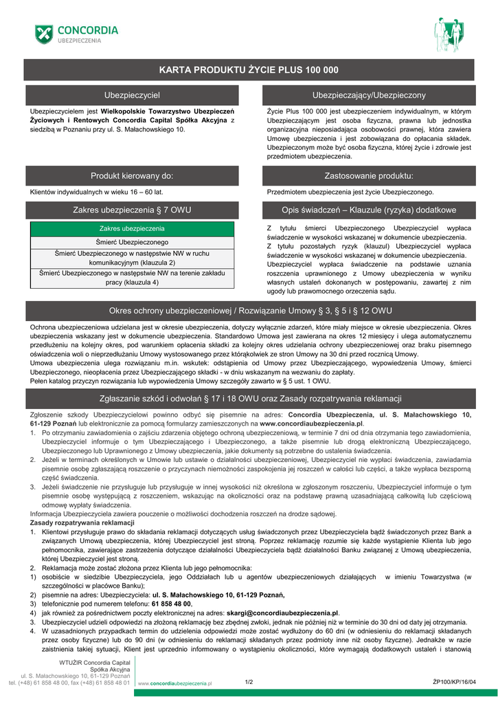 KARTA PRODUKTU ŻYCIE PLUS 100 000 Ubezpieczyciel Ubezpieczający/Ubezpieczony Ubezpieczycielem jest Wielkopolskie Towarzystwo Ubezpieczeń Życiowych i Rentowych Concordia Capital Spółka Akcyjna z siedzibą w Poznaniu przy ul. S. Małachowskiego 10. Życie Plus 100 000 jest ubezpieczeniem indywidualnym, w którym Ubezpieczającym jest osoba fizyczna, prawna lub jednostka organizacyjna nieposiadająca osobowości prawnej, która zawiera Umowę ubezpieczenia i jest zobowiązana do opłacania składek. Ubezpieczonym może być osoba fizyczna, której życie i zdrowie jest przedmiotem ubezpieczenia. Produkt kierowany do: Zastosowanie produktu: Klientów indywidualnych w wieku 16 – 60 lat. Przedmiotem ubezpieczenia jest życie Ubezpieczonego. Zakres ubezpieczenia § 7 OWU Opis świadczeń – Klauzule (ryzyka) dodatkowe Zakres ubezpieczenia Z tytułu śmierci Ubezpieczonego Ubezpieczyciel wypłaca świadczenie w wysokości wskazanej w dokumencie ubezpieczenia. Z tytułu pozostałych ryzyk (klauzul) Ubezpieczyciel wypłaca świadczenie w wysokości wskazanej w dokumencie ubezpieczenia. Ubezpieczyciel wypłaca świadczenie na podstawie uznania roszczenia uprawnionego z Umowy ubezpieczenia w wyniku własnych ustaleń dokonanych w postępowaniu, zawartej z nim ugody lub prawomocnego orzeczenia sądu. Śmierć Ubezpieczonego Śmierć Ubezpieczonego w następstwie NW w ruchu komunikacyjnym (klauzula 2) Śmierć Ubezpieczonego w następstwie NW na terenie zakładu pracy (klauzula 4) Okres ochrony ubezpieczeniowej / Rozwiązanie Umowy § 3, § 5 i § 12 OWU Ochrona ubezpieczeniowa udzielana jest w okresie ubezpieczenia, dotyczy wyłącznie zdarzeń, które miały miejsce w okresie ubezpieczenia. Okres ubezpieczenia wskazany jest w dokumencie ubezpieczenia. Standardowo Umowa jest zawierana na okres 12 miesięcy i ulega automatycznemu przedłużeniu na kolejny okres, pod warunkiem opłacenia składki za kolejny okres udzielania ochrony ubezpieczeniowej oraz braku pisemnego oświadczenia woli o nieprzedłużaniu Umowy wystosowanego przez którąkolwiek ze stron Umowy na 30 dni przed rocznicą Umowy. Umowa ubezpieczenia ulega rozwiązaniu m.in. wskutek: odstąpienia od Umowy przez Ubezpieczającego, wypowiedzenia Umowy, śmierci Ubezpieczonego, nieopłacenia przez Ubezpieczającego składki - w dniu wskazanym na wezwaniu do zapłaty. Pełen katalog przyczyn rozwiązania lub wypowiedzenia Umowy szczegóły zawarto w § 5 ust. 1 OWU. Zgłaszanie szkód i odwołań § 17 i 18 OWU oraz Zasady rozpatrywania reklamacji Zgłoszenie szkody Ubezpieczycielowi powinno odbyć się pisemnie na adres: Concordia Ubezpieczenia, ul. S. Małachowskiego 10, 61-129 Poznań lub elektronicznie za pomocą formularzy zamieszczonych na www.concordiaubezpieczenia.pl. 1. Po otrzymaniu zawiadomienia o zajściu zdarzenia objętego ochroną ubezpieczeniową, w terminie 7 dni od dnia otrzymania tego zawiadomienia, Ubezpieczyciel informuje o tym Ubezpieczającego i Ubezpieczonego, a także pisemnie lub drogą elektroniczną Ubezpieczającego, Ubezpieczonego lub Uprawnionego z Umowy ubezpieczenia, jakie dokumenty są potrzebne do ustalenia świadczenia. 2. Jeżeli w terminach określonych w Umowie lub ustawie o działalności ubezpieczeniowej, Ubezpieczyciel nie wypłaci świadczenia, zawiadamia pisemnie osobę zgłaszającą roszczenie o przyczynach niemożności zaspokojenia jej roszczeń w całości lub części, a także wypłaca bezsporną część świadczenia. 3. Jeżeli świadczenie nie przysługuje lub przysługuje w innej wysokości niż określona w zgłoszonym roszczeniu, Ubezpieczyciel informuje o tym pisemnie osobę występującą z roszczeniem, wskazując na okoliczności oraz na podstawę prawną uzasadniającą całkowitą lub częściową odmowę wypłaty świadczenia. Informacja Ubezpieczyciela zawiera pouczenie o możliwości dochodzenia roszczeń na drodze sądowej. Zasady rozpatrywania reklamacji 1. Klientowi przysługuje prawo do składania reklamacji dotyczących usług świadczonych przez Ubezpieczyciela bądź świadczonych przez Bank a związanych Umową ubezpieczenia, której Ubezpieczyciel jest stroną. Poprzez reklamację rozumie się każde wystąpienie Klienta lub jego pełnomocnika, zawierające zastrzeżenia dotyczące działalności Ubezpieczyciela bądź działalności Banku związanej z Umową ubezpieczenia, której Ubezpieczyciel jest stroną. 2. Reklamacja może zostać złożona przez Klienta lub jego pełnomocnika: 1) osobiście w siedzibie Ubezpieczyciela, jego Oddziałach lub u agentów ubezpieczeniowych działających w imieniu Towarzystwa (w szczególności w placówce Banku); 2) pisemnie na adres: Ubezpieczyciela: ul. S. Małachowskiego 10, 61-129 Poznań, 3) telefonicznie pod numerem telefonu: 61 858 48 00, 4) jak również za pośrednictwem poczty elektronicznej na adres: [email protected]. 3. Ubezpieczyciel udzieli odpowiedzi na złożoną reklamację bez zbędnej zwłoki, jednak nie później niż w terminie do 30 dni od daty jej otrzymania. 4. W uzasadnionych przypadkach termin do udzielenia odpowiedzi może zostać wydłużony do 60 dni (w odniesieniu do reklamacji składanych przez osoby fizyczne) lub do 90 dni (w odniesieniu do reklamacji składanych przez podmioty inne niż osoby fizyczne). Jednakże w razie zaistnienia takiej sytuacji, Klient jest uprzednio informowany o wystąpieniu okoliczności, które wymagają dodatkowych ustaleń i stanowią WTUŻIR Concordia Capital Spółka Akcyjna ul. S. Małachowskiego 10, 61-129 Poznań tel. (+48) 61 858 48 00, fax (+48) 61 858 48 01 www.concordiaubezpieczenia.pl 1/2 ŻP100/KP/16/04 KARTA PRODUKTU ŻYCIE PLUS 100 000 przyczynę udzielenia odpowiedzi w terminie późniejszym. 5. Odpowiedź na złożoną reklamację jest udzielana Klientowi w postaci papierowej lub za pomocą innego trwałego nośnika informacji. Na wniosek Klienta odpowiedź na złożoną reklamację może zostać udzielona pocztą elektroniczną. 6. Ubezpieczyciel n