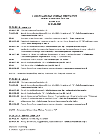 X MIĘDZYNARODOWA WYSTAWA RATOWNICTWO I TECHNIKA PRZECIWPOŻAROWA EDURA 2014 12-14.06.2014 12.06.2014 – czwartek 10.00-17.00 Wystawa otwarta dla publiczności 9.30-11.00 Narada Komendantów Wojewódzkich, Miejskich, Powiatowych PSP - Sala Omega Centrum Kongresowe Targów Kielce 12.00 Uroczyste otwarcie wystawy z udziałem zaproszonych gości - Teren zewnętrzny 12.30-13.30 Zwiedzanie targów przez zaproszonych gości – w tym Pokaz dynamiczny KW PSP w Kielcach oraz ZOSP – teren zewnętrzny za halą G 13.00-17.00 Obrady Komisji Konkursowej – Sala Konferencyjna II p., budynek administracyjny 15.00 Spotkanie członków i sympatyków Klaster Ratownictwa, Bezpieczeństwa, Ochrony Ludności i Środowiska Naturalnego – Sala Lambda, Centrum Kongresowe Targów Kielce 14.30-15.45 Konferencja „Nowa perspektywa finansowania ochrony przeciwpożarowej” – Sala Omega, Centrum Kongresowe Targów Kielce (wstęp za zaproszeniami) 16.00 Posiedzenie Rady Fundacji – Sala konferencyjna G3, Hala G 16.00-17.00 Narada Księży Kapelanów PSP – Sala konferencyjna G1, Hala G 17.00 Klub Generałów – Sala konferencyjna G3, Hala G 14.00-16.00 Pokazy dynamiczne przygotowane przez wystawców – teren zewnętrzny za halą G WIZYTY - Komendanci Wojewódzcy, Miejscy, Powiatowi PSP; delegacje zagraniczne 13.06.2014 – piątek 10.00-17.00 Wystawa otwarta dla publiczności 9.30-11.00 Narada Komendantów Wojewódzkich, Miejskich, Powiatowych PSP - Sala Omega Centrum Kongresowe Targów Kielce 10.00-13.00 Obrady Komisji Konkursowej – Sala Konferencyjna II p., budynek administracyjny 11.00-12.00 Narada Księży Kapelanów PSP – Sala konferencyjna G1, Hala G 13.00-14.00 Narada Kierownictwa Wojskowej Ochrony Przeciwpożarowej- Otwarta konferencja "Wojskowa Ochrona Przeciwpożarowa wczoraj dziś i jutro” – Sala konferencyjna G3, Hala G 19.30 Jubileuszowa Gala – Sala Omega, Centrum Kongresowe Targów Kielce 10.00-16.00 Pokazy dynamiczne przygotowane przez wystawców – teren zewnętrzny za halą G WIZYTY - Komendanci Wojewódzcy, Miejscy, Powiatowi PSP 14.06.2014 – sobota, Dzień OSP 10.00-15.00 Wystawa otwarta dla publiczności 10.00-14.00 Pokazy dynamiczne przygotowane przez wystawców – teren zewnętrzny za halą G Wystawie towarzyszą 1. Wystawa zdjęć 10-lecia EDURY 1