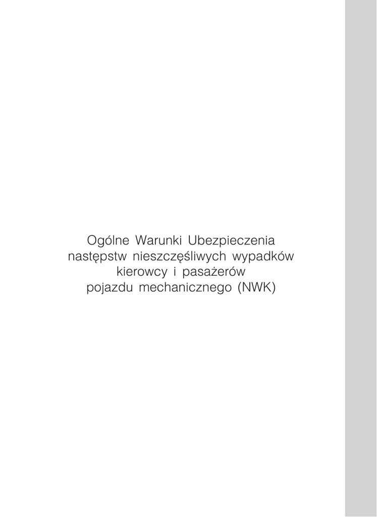 Ogólne Warunki Ubezpieczenia następstw nieszczęśliwych wypadków kierowcy i pasażerów pojazdu mechanicznego (NWK) SPIS TREŚCI Postanowienia ogólne ............................................................................................................. 3 Definicje ................................................................................................................................... 3 PRZEDMIOT I ZAKRES UBEZPIECZENIA Przedmiot i zakres ubezpieczenia ......................................................................................... 4 Wyłączenia odpowiedzialności ............................................................................................... 4 UMOWA UBEZPIECZENIA Zasady ogólne ........................................................................................................................ 5 Sposób zawierania umowy ubezpieczenia ........................................................................... 6 Umowa ubezpieczenia na cudzy rachunek .......................................................................... 6 Czas trwania odpowiedzialności HDI .................................................................................... 7 ROZWIĄZANIE UMOWY UBEZPIECZENIA Rozwiązanie umowy ubezpieczenia ...................................................................................... 7 SPIS TREŚCI Wypowiedzenie umowy ubezpieczenia ................................................................................. 7 Odstąpienie od umowy ubezpieczenia ................................................................................. 8 SUMA UBEZPIECZENIA I WARUNKI JEJ ZMIANY Suma ubezpieczenia .............................................................................................................. 8 Warunki zmiany sumy ubezpieczenia ................................................................................... 8 SPOSÓB USTALANIA I OPŁACANIA/ZWROTU SKŁADKI UBEZPIECZENIOWEJ Sposób ustalania składki ubezpieczeniowej ......................................................................... 9 Sposób opłacania składki ubezpieczeniowej ....................................................................... 9 Zwrot składki ubezpieczeniowej ............................................................................................ 9 PRAWA I OBOWIĄZKI STRON UMOWY Prawa i obowiązki ubezpieczającego ................................................................................. 10 Prawa i obowiązki HDI ......................................................................................................... 12 ODSZKODOWANIA I ŚWIADCZENIA Z UMOWY UBEZPIECZENIA Tryb dochodzenia roszczeń z umowy ubezpieczenia ....................................................... 12 Sposób ustalania wysokości szkody i odszkodowania/świadczenia ................................. 13 Wypłata odszkodowania/świadczenia .................................................................................. 14 Roszczenia regresowe (zwrotne) ......................................................................................... 15 Postanowienia końcowe ........................................................................................................ 16 Postanowienia ogólne §1 1. Ogólne warunki ubezpieczenia (OWU) następstw nieszczęśliwych wypadków kierowcy i pasażerów pojazdu mechanicznego (NWK) mają zastosowanie w umowach ubezpieczenia zawieranych przez HDI Asekuracja Towarzystwo Ubezpieczeń Spółka Akcyjna, zwane dalej HDI, z osobami fizycznymi, osobami prawnymi i jednostkami organizacyjnymi nie posiadającymi osobowości prawnej, zwanymi dalej ubezpieczającymi. 2. W porozumieniu z ubezpieczającymi, do umowy ubezpieczenia mogą zostać wprowadzone postanowienia dodatkowe, odbiegające od zapisów niniejszych OWU. 3. Postanowienia dodatkowe wymagają formy pisemnej pod rygorem nieważności. 5. W sprawach nie uregulowanych w niniejszych OWU mają zastosowanie odpowiednie przepisy kodeksu cywilnego oraz ustawy o działalności ubezpieczeniowej oraz inne powszechnie obowiązujące przepisy prawa. Definicje §2 1. Przez pojęcia użyte w niniejszych OWU rozumie się: 1) Nieszczęśliwy wypadek - nagłe zdarzenie wywołane przyczyną zewnętrzną, związane z ruchem pojazdu, w następstwie którego ubezpieczający/ubezpieczony, niezależnie od swojej woli, doznał trwałego uszczerbku na zdrowiu, rozstroju zdrowia lub zmarł. 2) Przedsiębiorca - osoba fizyczna, osoba prawna i jednostka organizacyjna nie posiadająca osobowości prawnej, prowadząca we własnym imieniu działalność gospodarczą lub zawodową oraz wspólnicy spółki cywilnej w zakresie wykonywanej przez nich działalności gospodarczej. 3) Ruch pojazdu - stan, w którym pojazd znajduje się od momentu uruchomienia silnika, niezależnie od przyczyny powodującej to uruchomienie, trwający do chwili unieruchomienia silnika, obejmujący również sytuacje, gdy po unieruchomieniu silnika pojazd nadal toczy się siłą bezwładności. 4) Środki pomocnicze - wszelkie elementy wspomagające proces leczniczy takie jak: gorsety, ortezy, protezy, kule, stabilizatory, aparaty ortopedyczne. 5) Trwały uszczerbek na zdrowiu - zaburzenia czynności uszkodzonego organu (narządu) lub układu, powodujące ich trwałą dysfunkcję. 6) Ubezpieczający - osoba fizyczna, osoba prawna lub jednostka organizacyjna nie posiadająca osobowości prawnej, zawierająca umowę ubezpieczenia i zobowiązana do opłacania składki ubezpieczeniowej. 3 POSTANOWIENIA OGÓLNE / DEFINICJE 4. W umowie ubezpieczenia zawartej na podstawie niniejszych OWU ma zastosowanie prawo polskie. 7) Ubezpieczony - osoba fizyczna (kierowca i pasażerowie pojazdu), której zdrowie i życie są przedmiotem ubezpieczenia. 8) Uprawniony - osoba upoważniona pisemnie przez ubezpieczającego/ubezpieczonego do otrzymania odszkodowania/świadczenia w przypadku śmierci osoby ubezpieczonej. PRZEDMIOT I ZAKRES UBEZPIE