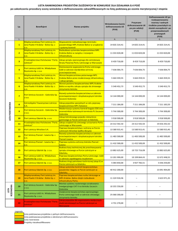 LISTA RANKINGOWA PROJEKTÓW ZŁOŻONYCH W KONKURSIE DLA DZIAŁANIA 8.4 POIŚ po zakończeniu procedury oceny wniosków o dofinansowanie zakwalifikowanych na listę podstawą po ocenie merytorycznej I stopnia Lp. 1. 1 2 3. Wyposażenie rozbudowanego terminalu pasażerskiego MPL Kraków-Balice w urządzenia i systemy kontroli Rozbudowa systemów bezpieczeństwa MPL Kraków-Balice w związku z rozwojem infrastruktury Przedsiębiorstwo Państwowe "Porty Zakup sprzętu operacyjnego dla Lotniskowej Lotnicze" Straży Pożarnej Portu Lotniczego w Warszawie 4 Port Lotniczy Łódź im. Władysława Reymonta Sp. z o.o. 6 LISTA PODSTAWOWA 2. Międzynarodowy Port Lotniczy im. Jana Pawła II Kraków - Balice Sp. z o.o. Międzynarodowy Port Lotniczy im. Jana Pawła II Kraków - Balice Sp. z o.o. Nazwa projektu 3 5 LISTA REZERWOWA Beneficjent Międzynarodowy Port Lotniczy im. Jana Pawła II Kraków - Balice Sp. z o.o. Międzynarodowy Port Lotniczy im. Jana Pawła II Kraków - Balice Sp. z o.o. Dostosowanie wyposażenia Portu Lotniczego Łódź w zakresie standardów ochrony przeciwpożarowej Wzrost bezpieczeństwa pożarowego MPL Kraków Balice przez modernizację infrastruktury i zakup sprzętu. Wzrost poziomu bezpieczeństwa MPL KrakówBalice w wyniku zakupu sprzętu do zimowego utrzymania lotniska 7 Rozwój systemów bezpieczeństwa w zakresie Port lotniczy Szczecin - Goleniów Sp. przeciwpożarowym i eksploatacyjnym lotniska z o.o. Szczecin-Goleniów 8 Górnośląskie Towarzystwo Lotnicze S.A. 9 Port lotniczy Szczecin - Goleniów Sp. z o.o. 10 Port Lotniczy Gdańsk Sp. z o.o. 11 Przedsiębiorstwo Państwowe "Porty Lotnicze" 12 Port Lotniczy Wrocław S.A. 13 Port lotniczy Poznań - Ławica Sp. z o.o. 14 Port lotniczy Poznań - Ławica Sp. z o.o. 15 Port Lotniczy Gdańsk Sp. z o.o. 16 Port Lotniczy Łódź im. Władysława Reymonta Sp. z o.o. 17 Port Lotniczy Gdańsk Sp. z o.o. 18 Port Lotniczy Gdańsk Sp. z o.o. 19 Międzynarodowy Port Lotniczy im. Jana Pawła II Kraków - Balice Sp. z o.o. 20 Port lotniczy Szczecin - Goleniów Sp. z o.o. 21 Port Lotniczy Łódź im. Władysława Reymonta Sp. z o.o. 22 Przedsiębiorstwo Państwowe "Porty Lotnicze" Zakup pojazdów specjalnych w celu poprawy bezpieczeństwa MPL Katowice Modernizacja systemu kontroli bagażu EDS oraz przenośników taśmowych terminalu PL SzczecinGoleniów Zakup lotniskowego pojazdu ratowniczogaśniczego w Porcie Lotniczym w Gdańsku. Zakup urządzeń do zimowego utrzymania Portu Lotniczego w Warszawie Poprawa bezpieczeństwa i ochrony w Porcie Lotniczym Wrocław Spółka Akcyjna Rozwój systemów bezpieczeństwa w zakresie przeciwpożarowym i eksploatacyjnym lotniska Poznań-Ławica Poprawa systemu ochrony lotniska Poznań Ławica Budowa bazy technicznej do przechowywania sprzętu zimowego w Porcie Lotniczym w Gdańsku. Poprawa bezpieczeństwa Portu Lotniczego Łódź w zakresie zapobiegania incydentom Budowa drogi patrolowo-technicznej (etap II) w Porcie Lotniczym w Gdańsku. Zakup systemów kontroli bezpieczeństwa pasażerów i bagażu w Porcie Lotniczym w Gdańsku. Poprawa bezpieczeństwa ruchu lotniczego w MPL Kraków -Balice dzięki rozbudowie infrastruktury Portu. Montaż systemu naziemnego oznakowania nawigacyjnego CAT II na lotnisku Szczecin Goleniów Zwiększenie bezpieczeństwa operacyjnego Portu Lotniczego Łódź w zakresie zimowego utrzymania lotniska Zakup pojazdów dla wyposażenia medycznych służb lotniskowych w Porcie Lotniczym w Warszawie Legenda Lista podstawowa projektów o pełnym dofinansowaniu Lista podstawowa projektów o obniżonym dofinansowaniu Lista rezerwowa Projekty niezakwalifikowane Wnioskowana kwota dofinansowania UE (PLN) Przyznane dofinansowanie UE po pre-selekcji (PLN) 4. 5. Dofinansowanie UE po rozdysponowaniu rezerwy i wolnych środków powstałych na skutek oszczędności po przeprowadzonych przetargach (PLN) 6. 14 835 314,41 14 835 314,41 14 835 314,41 11 033 820,08 11 033 820,08 11 033 820,08 8 459 710,00 8 459 710,00 8 459 710,00 7 636 004,75 7 636 004,75 7 636 004,75 5 664 459,55 5 664 459,55 5 664 459,55 5 540 452,73 5 540 452,73 5 540 452,73 14 144 000,00 14 144 000,00 14 144 000,00 7 211 184,00 7 211 184,00 7 211 183,59 5 744 300,00 5 744 300,00 5 744 300,00 3 918 500,00 3 918 500,00 3 918 500,00 24 312 592,50 24 312 592,50 19 656 292,50 13 580 915,41 13 580 915,41 13 580 915,40 11 483 500,00 11 483 500,00 11 483 500,00 11 432 500,00 11 432 500,00 11 432 500,00 13 882 625,00 10 725 716,08 13 882 625,00 13 201 999,00 10 199 864,43 12 672 448,55 5 083 850,00 3 927 782,51 5 036 250,00 40 912 200,00 – 13 091 904,00 11 324 910,46 – 3 623 971,35 10 355 550,00 – – 25 068 200,00 – – 4 731 270,00 – –
