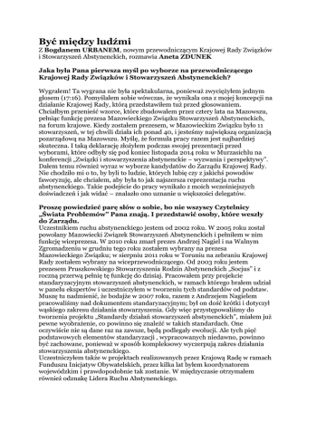 Być między ludźmi Z Bogdanem URBANEM, nowym przewodniczącym Krajowej Rady Związków i Stowarzyszeń Abstynenckich, rozmawia Aneta ZDUNEK Jaka była Pana pierwsza myśl po wyborze na przewodniczącego Krajowej Rady Związków i Stowarzyszeń Abstynenckich? Wygrałem! Ta wygrana nie była spektakularna, ponieważ zwyciężyłem jednym głosem (17:16). Pomyślałem sobie wówczas, że wynikała ona z mojej koncepcji na działanie Krajowej Rady, którą przedstawiłem tuż przed głosowaniem. Chciałbym przenieść wzorce, które zbudowałem przez cztery lata na Mazowszu, pełniąc funkcję prezesa Mazowieckiego Związku Stowarzyszeń Abstynenckich, na forum krajowe. Kiedy zostałem prezesem, w Mazowieckim Związku było 11 stowarzyszeń, w tej chwili działa ich ponad 40, i jesteśmy największą organizacją pozarządową na Mazowszu. Myślę, że formuła pracy razem jest najbardziej skuteczna. I taką deklarację złożyłem podczas swojej prezentacji przed wyborami, które odbyły się pod koniec listopada 2014 roku w Murzasichlu na konferencji „Związki i stowarzyszenia abstynenckie − wyzwania i perspektywy”. Dałem temu również wyraz w wyborze kandydatów do Zarządu Krajowej Rady. Nie chodziło mi o to, by byli to ludzie, których lubię czy z jakichś powodów faworyzuję, ale chciałem, aby była to jak najszersza reprezentacja ruchu abstynenckiego. Takie podejście do pracy wynikało z moich wcześniejszych doświadczeń i jak widać – znalazło ono uznanie u większości delegatów. Proszę powiedzieć parę słów o sobie, bo nie wszyscy Czytelnicy „Świata Problemów” Pana znają. I przedstawić osoby, które weszły do Zarządu. Uczestnikiem ruchu abstynenckiego jestem od 2002 roku. W 2005 roku został powołany Mazowiecki Związek Stowarzyszeń Abstynenckich i pełniłem w nim funkcję wiceprezesa. W 2010 roku zmarł prezes Andrzej Nagiel i na Walnym Zgromadzeniu w grudniu tego roku zostałem wybrany na prezesa Mazowieckiego Związku; w sierpniu 2011 roku w Toruniu na zebraniu Krajowej Rady zostałem wybrany na wiceprzewodniczącego. Od 2003 roku jestem prezesem Pruszkowskiego Stowarzyszenia Rodzin Abstynenckich „Socjus” i z roczną przerwą pełnię tę funkcję do dzisiaj. Pracowałem przy projekcie standaryzacyjnym stowarzyszeń abstynenckich, w ramach którego brałem udział w panelu ekspertów i uczestniczyłem w tworzeniu tych standardów od podstaw. Muszę tu nadmienić, że bodajże w 2007 roku, razem z Andrzejem Nagielem pracowaliśmy nad dokumentem standaryzacyjnym; był on dość krótki i dotyczył wąskiego zakresu działania stowarzyszenia. Gdy więc przystępowaliśmy do tworzenia projektu „Standardy działań stowarzyszeń abstynenckich”, miałem już pewne wyobrażenie, co powinno się znaleźć w takich standardach. One oczywiście nie są dane raz na zawsze, będą podlegały ewolucji. Ale tych pięć podstawowych elementów standaryzacji , wypracowanych niedawno, powinno być zachowane, ponieważ w sposób kompleksowy wyczerpują zakres działania stowarzyszenia abstynenckiego. Uczestniczyłem także w projektach realizowanych przez Krajową Radę w ramach Funduszu Inicjatyw Obywatelskich, przez kilka lat byłem koordynatorem wojewódzkim i prawdopodobnie tak zostanie. W międzyczasie otrzymałem również odznakę Lidera Ruchu Abstynenckiego. Oprócz mnie, w Zarządzie znalazło się także dwóch wiceprzewodniczących: Krzysztof Adach (woj. kujawsko-pomorskie) i Jan Gancarz (woj. śląskie), sekretarz Władysław Keler (woj. łódzkie), który pamięta jeszcze czasy Federacji Klubów Abstynenckich, powstałej w 1988 roku w Sieradzu. Skarbnikiem został Włodzimierz Ziółkowski (woj. łódzkie), a członkami Zarządu Andrzej Netkowski (woj. pomorskie), Wojciech Zielonka (woj. lubelskie) i Zbigniew Jadczak (reg. częstochowski). Do Komisji Rewizyjnej Krajowej Rady wybrano: Marka Szamretę – przewodniczący Komisji (woj. podlaskie), Anielę Racką – członka Komisji (woj. śląskie), Zbigniewa Rycherta – członka Komisji (woj. dolnośląskie). Jak widać, w Zarządzie znaleźli się przedstawiciele ruchu abstynenckiego z całego kraju. Na tym mi zależało, aby Rada stanowiła jak najszerszą reprezentację. Jakie priorytety stoją przed nowym Zarządem? Będziemy na pewno szkolić ludzi, przede wszystkim w pierwszym kontakcie z osobą potrzebującą pomocy. To jest od lat największy problem. Już nie wystarczy, że w stowarzyszeniu będą przeszkolone w tym zakresie osoby pełniące dyżury. Musimy mieć świadomość, że w każdej chwili może przyjść do nas osoba potrzebująca pomocy, niekoniecznie wtedy, gdy jest dyżur. Przykład sprzed kilkunastu dni: wigilia, przychodzi człowiek, który potrzebuje pomocy, w Pruszkowskim Stowarzyszeniu Rodzin Abstynenckich „Socjus” nie ma dyżuru, ale jestem ja, wykonuję prace biurowe. Zaczynam z nim rozmawiać. Gdybym nie potrafił rozmawiać, nie miał wiedzy, odpowiednich umiejętności, ten człowiek odszedłby z kwitkiem, może uciekłby. A tak, na skutek naszej rozmowy, przyszedł do nas ponownie. Zależy mi, aby jak najwięcej członków stowarzyszeń miało przeszkolenie z zakresu pierwszego kontaktu z osobą potrzebującą pomocy i było gotowych do niesienia takiej pomocy. Będziemy dalej szkolić ludzi na temat roli, jaką powinny spełniać organizacje abstynenckie w strukturach społecznych. Stowarzyszenia abstynenckie powinny stać się, i w wielu miejscach tak jest, ważnymi partnerami dla władzy lokalnej w rozwiązywaniu problemów uzależnień. Współpraca z samorządami pozwala na pełniejsze realizowanie zadań statutowych stowarzyszeń i może dać szersze możliwości do działania nie tylko w wymiarze finansowym, ale także merytorycznym czy organizacyjnym. Poziom wiedzy na temat możliwości współpracy jest nadal niski. Dumny jestem z tego, że wielu członków stowarzyszeń abstynenckich ukończyło odpowiednie szkolenia i wiedzą, jak współpra