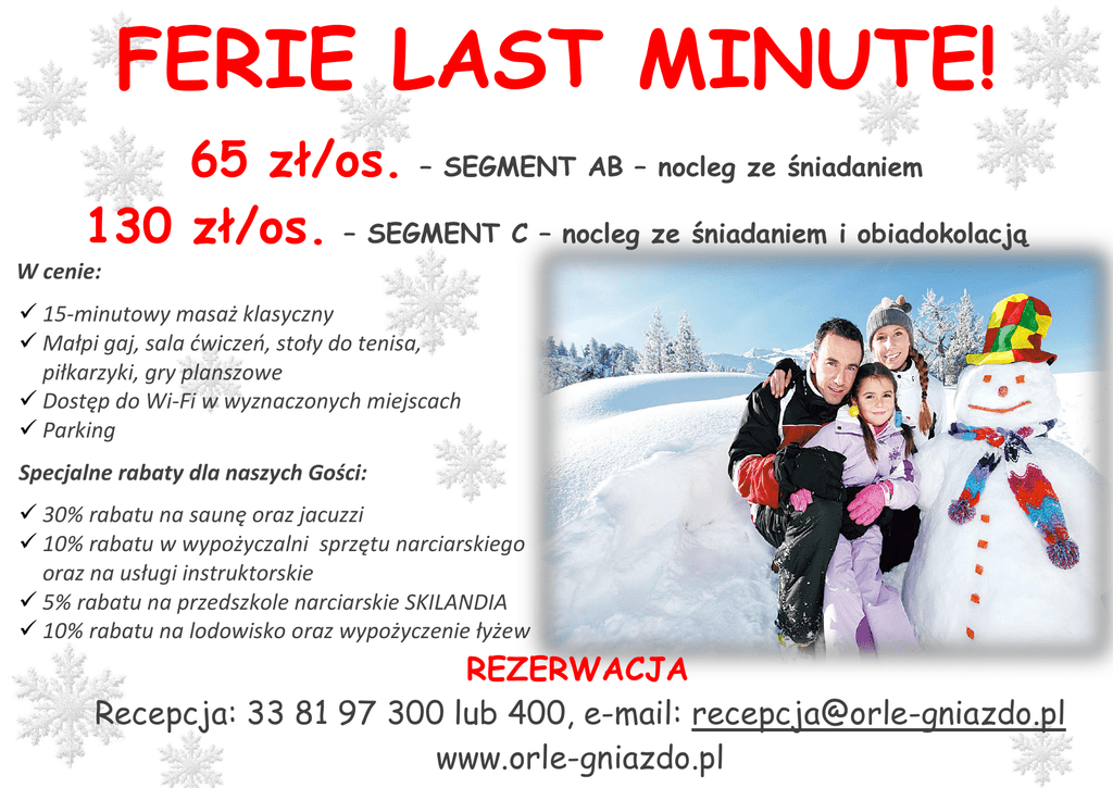 FERIE LAST MINUTE! 65 zł/os. – SEGMENT AB – nocleg ze śniadaniem 130 zł/os. – SEGMENT C – nocleg ze śniadaniem i obiadokolacją W cenie: 15-minutowy masaż klasyczny Małpi gaj, sala ćwiczeń, stoły do tenisa, piłkarzyki, gry planszowe Dostęp do Wi-Fi w wyznaczonych miejscach Parking Specjalne rabaty dla naszych Gości: 30% rabatu na saunę oraz jacuzzi 10% rabatu w wypożyczalni sprzętu narciarskiego oraz na usługi instruktorskie 5% rabatu na przedszkole narciarskie SKILANDIA 10% rabatu na lodowisko oraz wypożyczenie łyżew REZERWACJA Recepcja: 33 81 97 300 lub 400, e-mail: [email protected] www.orle-gniazdo.pl