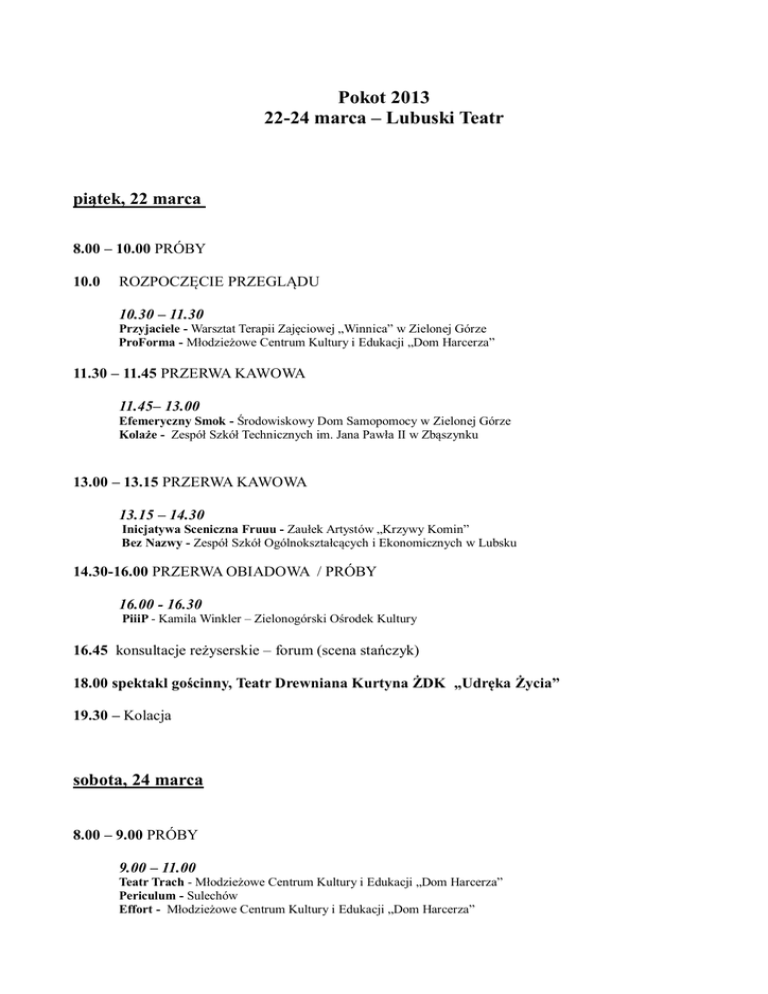Pokot 2013 22-24 marca – Lubuski Teatr piątek, 22 marca 8.00 – 10.00 PRÓBY 10.0 ROZPOCZĘCIE PRZEGLĄDU 10.30 – 11.30 Przyjaciele - Warsztat Terapii Zajęciowej „Winnica” w Zielonej Górze ProForma - Młodzieżowe Centrum Kultury i Edukacji „Dom Harcerza” 11.30 – 11.45 PRZERWA KAWOWA 11.45– 13.00 Efemeryczny Smok - Środowiskowy Dom Samopomocy w Zielonej Górze Kolaże - Zespół Szkół Technicznych im. Jana Pawła II w Zbąszynku 13.00 – 13.15 PRZERWA KAWOWA 13.15 – 14.30 Inicjatywa Sceniczna Fruuu - Zaułek Artystów „Krzywy Komin” Bez Nazwy - Zespół Szkół Ogólnokształcących i Ekonomicznych w Lubsku 14.30-16.00 PRZERWA OBIADOWA / PRÓBY 16.00 - 16.30 PiiiP - Kamila Winkler – Zielonogórski Ośrodek Kultury 16.45 konsultacje reżyserskie – forum (scena stańczyk) 18.00 spektakl gościnny, Teatr Drewniana Kurtyna ŻDK „Udręka Życia” 19.30 – Kolacja sobota, 24 marca 8.00 – 9.00 PRÓBY 9.00 – 11.00 Teatr Trach - Młodzieżowe Centrum Kultury i Edukacji „Dom Harcerza” Periculum - Sulechów Effort - Młodzieżowe Centrum Kultury i Edukacji „Dom Harcerza” 11.00 – 11.15 PRZERWA KAWOWA 11.15 – 14.40 Teatr Avis - Liceum Ogólnokształcące im. K.K Baczyńskiego w Nowej Soli Es - Żarski Dom Kultury Teatr Grymas - Młodzieżowe Centrum Kultury i Edukacji „Dom Harcerza” Grupa Teatralna Ponievash - Młodzieżowe Centrum Kultury i Edukacji „Dom Harcerza” 14.40 – 15.40 PRZERWA OBIADOWA / PRÓBY 15.40 – 17.40 A co mi tam - Międzyrzecki Ośrodek Kultury Teatr Zza Boru - Zabór Marek Krukowski Presents - Zielona Góra 18.00 – konsultacje reżyserskie – forum (sala Stańczyk) 19.30 Kolacja niedziela, 25 marca 8.00 – 9.00 PRÓBY 9.00 – 10.30 Teatr Anigrono - Regionalne Centrum Animacji Kultury w Zielonej Górze Mikrofon Inspicjenta - Lubuski Teatr w Zielonej Górze 10.30 - 10.45 PRZERWA KAWOWA 10.45 – 12.30 Sekcja Filmowa "Miot" – Żarski Dom Kultury Giętki Sztankiet – Lubuski Teatr w Zielonej Górze Teatr Słowa - Młodzieżowe Centrum Kultury i Edukacji „Dom Harcerza” 12.45 spektakl gościnny, Pracownia Teatru Tańca MCKiE „Dom Harcerza” - spektakl improwizowany w wykonaniu grupy projektowej pt. „Ptacy” 13.15 spektakl gościnny, Pracownia Teatru Tańca MCKiE „Dom Harcerza” Duet taneczny: Marek Zadłużny, Kalina Grupa,pt.”Goniąc Kormorany” 14.00 Uroczyste zakończenie przeglądu, ogłoszenie wyników