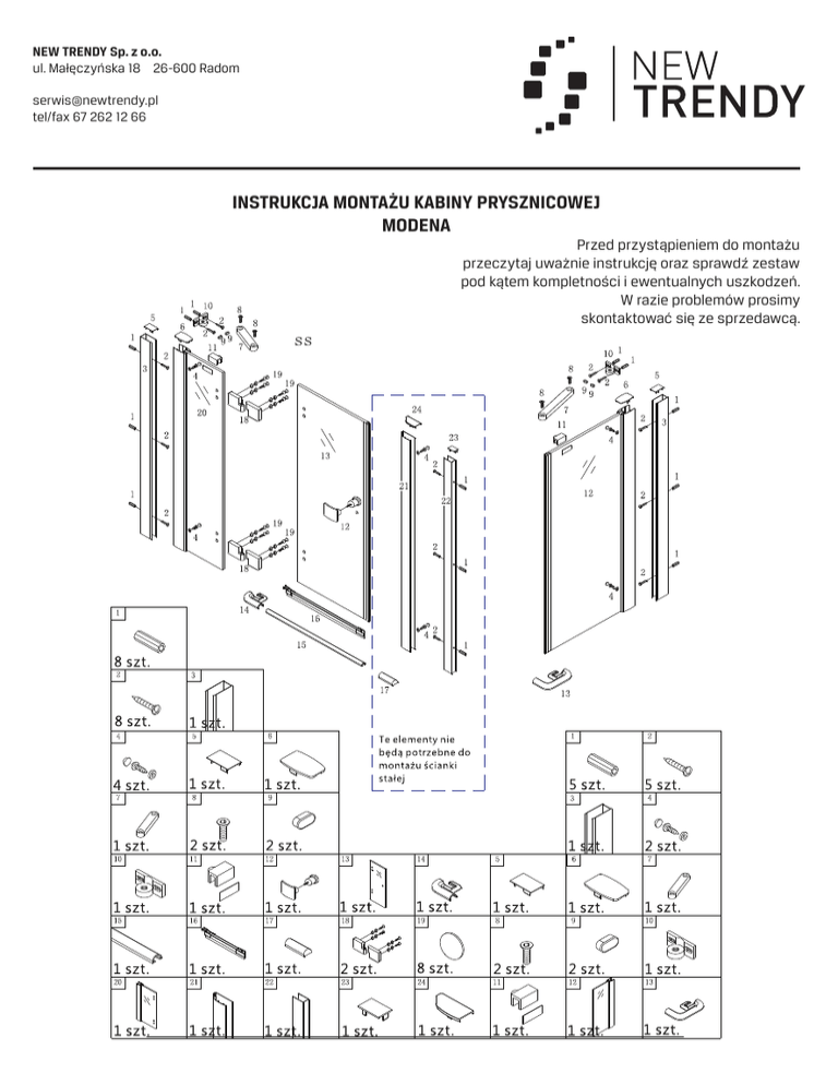NEW TRENDY Sp. z o.o. ul. Małęczyńska 18 26-600 Radom [email protected] tel/fax 67 262 12 66 INSTRUKCJA MONTAŻU KABINY PRYSZNICOWEJ MODENA Przed przystąpieniem do montażu przeczytaj uważnie instrukcję oraz sprawdź zestaw pod kątem kompletności i ewentualnych uszkodzeń. W razie problemów prosimy skontaktować się ze sprzedawcą. Prosimy o czyszczenie aluminiowych powierzchni kabiny oraz szyb miękką szmatka używając łagodnych środków czyszczących. W celu zapewnienia prawidłowego działania rolek należy je raz w miesiącu zabezpieczyć wazeliną sanitarną. Stosowanie środków nie zalecanych przez producenta i niewłaściwa konserwacja rolek może narazić Państwa na utratę gwarancji. ŻYCZYMY PRZYJEMNEGO UŻYTKOWANIA NASZEGO PRODUKTU.