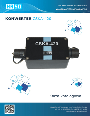 PROFESJONALNE ROZWIĄZANIA W AUTOMATYCE I METANOMETRII KONWERTER CSKA-420 Karta katalogowa HASO S.C. ul. Towarowa 20, 43-100 Tychy, Polska tel. +48 32 323 38 00, fax. +48 32 323 38 31 [email protected], www.haso.pl KONWERTER CSKA-420 CECHA CHARAKTERYSTYCZNA Konwerter CSKA-420 jest urządzeniem służącym do konwersji sygnału prądowego w standardach 420mA oraz 0-20mA na postać cyfrową. Konwerter współpracuje bezpośrednio przez linię zasilająco-transmisyjną z centralą telemetryczną CST-40, CST-40A lub CST-40C, w dalszej części oznaczonej jako CST-40. Konwerter posiada wyjście zasilające pętlę prądową, które można wykorzystać do zasilania pętli pomiarowej oraz urządzenia współpracującego np. czujnika z wyjściem prądowym 4-20mA. Konwerter posiada kategorie M1 oraz 2G. Konwerter może być produkowany w następujących wersjach: CSKA-420 wersja podstawowa (napięcie zasilania pętli 20V) CSKA-420/H wersja podstawowa z interfejsem HART CSKA-420/12 wersja z obniżonym napięciem (napięcie zasilania pętli 12V) CSKA-420/12/H wersja z obniżonym napięciem z interfejsem HART PODSTAWOWE DANE TECHNICZNE Konwerter CSKA-420 Interfejs typu CST-40 „Linia”: - zasilanie - transmisja - maks. długość linii Wejście pomiarowe „4-20”: Zakres pomiarowy Sposób pomiaru Błąd przetwarzania (maksymalny) Impedancja wejściowa Napięcie znamionowe wyjścia do zasilania pętli prądowej Pozycja pracy Temperatura pracy Zakres wilgotności względnej pracy Wymiary zewnętrzne (bez złącz) Masa Stopień ochrony obudowy 40 mA cyfrowa, dwukierunkowa, 10 km 0-25 mA ciągły ± 0,5% 100 Ω dla wersji podstawowej 250 Ω dla wersji HART 20V dla wersji podstawowej 12V dla wersji „12V” dowolna od -10°C do + 40°C od 15% do 95% bez kondensacji 110 x 75 x 56 mm 0,7 kg IP-54 CECHA BUDOWY PRZECIWWYBUCHOWEJ I M1 Ex ia I Ma II 2G Ex ia IIB T4 Gb Certyfikat badania typu WE: TEST 13 ATEX 0055X HASO S.C. ul. Towarowa 20, 43-100 Tychy, Polska tel. +48 32 323 38 00, fax. +48 32 323 38 31 [email protected], www.haso.pl