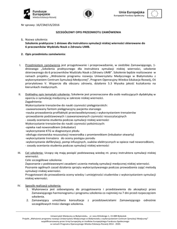 Nr sprawy: 16/CSM/US/2016 SZCEGÓŁOWY OPIS PRZEDMIOTU ZAMÓWIENIA 1. Nazwa szkolenia: Szkolenie praktyczne 1 dniowe dla instruktora symulacji niskiej wierności skierowane do 6 pracowników Wydziału Nauk o Zdrowiu UMB. 2. Opis przedmiotu zamówienia: I. Przedmiotem zamówienia jest przygotowanie i przeprowadzenie, w siedzibie Zamawiającego, 1dniowego „Szkolenia praktycznego dla instruktora symulacji niskiej wierności, szkolenie skierowanego do 6 pracowników Wydziału Nauk o Zdrowiu UMB”. Szkolenie będzie realizowane w ramach projektu „Wdrożenie programu rozwoju Uniwersytetu Medycznego w Białymstoku z wykorzystaniem Centrum Symulacji Medycznej”, Program Operacyjny Wiedza Edukacja Rozwój, Oś priorytetowa V. Wsparcie dla obszaru zdrowia, działanie 5.3 Wysoka jakość kształcenia na kierunkach medycznych. II. Dokładny opis tematyki szkolenia: Szkolenie jest przeznaczone dla osób realizujących dydaktykę w oparciu o symulację medyczną w zakresie niskiej wierności. Zagadnienia: Wykorzystanie trenażerów do nauki czynności pielęgniarskich: -zaawansowany fantom pielęgnacyjny pacjenta starszego -nauka prowadzenia profilaktyki przeciwodleżynowej z wykorzystaniem trenażerów -prowadzenie podstawowych i zaawansowanych czynności resuscytacyjnych - zasady oceniania studenta podczas symulacji niskiej wierności Wykorzystanie trenażerów do nauki czynności położniczych: -opieka nad noworodkiem (inkubator) -wykorzystanie KTG w diagnostyce płodu -obsługa stanowiska resuscytacji noworodka z promiennikiem (inkubator otwarty) -wykorzystanie trenażera do oceny postępu porodu -wykorzystanie defibrylacji, pomp infuzyjnych, ssaków elektrycznych w opiece nad noworodkiem, - zasady oceniania studenta podczas symulacji niskiej wierności III. Cel szkolenia: Uczący się mają posiąść podstawową wiedzę nt. pracy instruktora symulacji niskiej wierności. Cele szczegółowe szkolenia: Zapoznanie z podstawowymi zasadami uczenia metodą symulacji medycznej niskiej wierności. Poznanie ogólnych zasad działania sprzętu wykorzystywanego podczas prowadzenia zajęć metodą symulacji niskiej wierności. Przygotowani do prowadzenia oceny wiedzy i umiejętności studentów z wykorzystaniem symulacji niskiej wierności. IV. Sposób realizacji szkolenia: 1. Wykonawca jest zobowiązany do przygotowania i przedstawienia do akceptacji przez Zamawiającego harmonogramu i programu szkolenia co najmniej na 7 dni przed rozpoczęciem szkolenia. 2. Zamawiający umożliwia konsultacje z przedstawicielami Zamawiającego odnośnie szczegółowych treści danego szkolenia. Uniwersytet Medyczny w Białymstoku, ul. Jana Kilińskiego 1, 15-089 Białystok Projekt „Wdrożenie programu rozwoju Uniwersytetu Medycznego w Białymstoku z wykorzystaniem Centrum Symulacji Medycznej” współfinansowany przez Unię Europejską ze środków Europejskiego Funduszu Społecznego w ramach Programu Operacyjnego Wiedza Edukacja Rozwój 2014 - 2020. 3. Szkolenie praktyczne - zajęcia symulowane. Omówienie poszczególnych etapów pracy instruktora symulacji medycznej niskiej wierności na przykładach w czasie pracy z grupą. 4. Zajęcia praktyczne prowadzone w 2 grupach tematycznych pielęgniarstwo i położnictwo 5. Szkolenie w siedzibie UMB, sale ćwiczeniowe WNoZ. 6. Dokładne miejsce Zamawiający wskaże przed planowanym szkoleniem. 7. Zamawiający zapewnia sale ćwiczeniowe. 8. Wykonawca zobowiązany jest do zapewnienia sprzętu szkoleniowego we własnym zakresie. 9. Każdy uczestnik szkolenia otrzyma certyfikat/zaświadczenie o ukończeniu szkolenia. Certyfikaty/zaświadczenia o ukończeniu szkolenia powinny zawierać logotypy i inf. zgodnie z wytycznymi. Informacje o obowiązku zamieszczania tych oznaczeń będzie przekazywał wykonawcy Dział Projektów Pomocowych UMB 10. Wykonawca zapewni każdemu uczestnikowi materiały szkoleniowe w formie elektronicznej. Materiały zostaną opatrzone odpowiednimi logo (Unii Europejskiej, Programu Operacyjnego Wiedza Edukacja Rozwój oraz nazwą projektu które Zamawiający przekaże Wykonawcy drogą mailową.) Materiały szkoleniowe w formacie PDF zostaną wysłane drogą mailową na adres Zamawiającego przed rozpoczęciem szkolenia oraz przekazane uczestnikom szkolenia najpóźniej w dniu rozpoczęcia szkolenia na nośniku USB w ilości równej liczbie uczestników szkolenia + 1 egzemplarz dla zamawiającego. V. Planowany termin szkolenia: Grudzień 2016. Termin szkolenia określony zostanie przez Zamawiającego na co najmniej 14 dni przed datą szkolenia. VI. Miejsce szkolenia: Szkolenie w siedzibie UMB, sale ćwiczeniowe WNoZ. Dokładne miejsce szkolenia określone zostanie przez Zamawiającego na co najmniej 7 dni przed datą szkolenia VII. Długość szkolenia/kursu: Jednodniowe szkolenie. Łącznie 8 godzin dydaktycznych, w godzinach 8.00-16.00, (1 godzina dydaktyczna = 45 minut). VIII. Planowana liczba uczestników: 6 pracowników UMB IX. Liczebność grupy: Maksymalnie 4 osoby w grupie. tematycznych pielęgniarstwo i położnictwo Zajęcia praktyczne prowadzone w 2 grupach X. Wymagania wobec Wykonawcy Posiadanie co najmniej dwuletniego doświadczenia w prowadzeniu szkoleń w symulacji medycznej. Wykonawca potwierdzi swoje doświadczenie oświadczeniem na formularzu ofertowym. XI. Wymagania wobec prowadzącego szkolenie: Wykonawca winien dysponować co najmniej 2 osobami, które będą prowadziły zajęcia w tym 1 pielęgniarka i 1 położna: - będą certyfikowanymi instruktorami symulacji (uprawnienia poparte certyfikatem europejskiego towarzystwa symulacji lub równoważne) Wykonawca zobowiązuje się do przedłożenia, na każde wezwanie Zamawiającego, dokumentów potwierdzających posiadanie ww. uprawnień oraz doświadczenie.. XII. Kryteria oceny ofert: Zamawiający dokona oceny ważnych ofert na podstawie następującego kryterium: - cena – 40%, Uniwersytet Medyczny w Białymstoku, ul. Jana Kilińskiego 1, 15-089 Białystok Projekt „Wdrożenie p