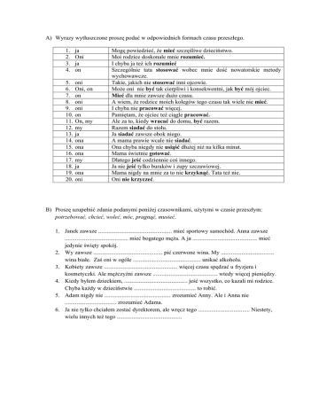 A) Wyrazy wytłuszczone proszę podać w odpowiednich formach czasu przeszłego. 1. 2. 3. 4. ja Oni ja on 5. 6. 7. 8. 9. 10. 11. 12. 13. 14. 15. 16. 17. 18. 19. 20. oni Oni, on on oni oni on On, my my ja ona ona ona my ja ona oni Mogę powiedzieć, Ŝe mieć szczęśliwe dzieciństwo. Moi rodzice doskonale mnie rozumieć. I chyba ja teŜ ich rozumieć Szczególnie tata stosować wobec mnie dość nowatorskie metody wychowawcze. Takie, jakich nie stosować inni ojcowie. MoŜe oni nie być tak cierpliwi i konsekwentni, jak być mój ojciec. Mieć dla mnie zawsze duŜo czasu. A wiem, Ŝe rodzice moich kolegów tego czasu tak wiele nie mieć. I chyba nie pracować więcej. Pamiętam, Ŝe ojciec teŜ ciągle pracować. Ale za to, kiedy wracać do domu, być razem. Razem siadać do stołu. Ja siadać zawsze obok niego. A mama prawie wcale nie siadać. Ona chyba niegdy nie usiąść dłuŜej niŜ na kilka minut. Mama świetnie gotować. Dlatego jeść codziennie coś innego. Ja nie jeść tylko buraków i zupy szczawiowej. Mama nigdy na mnie za to nie krzyknąć. Tata teŜ nie. Oni nie krzyczeć. B) Proszę uzupełnić zdania podanymi poniŜej czasownikami, uŜytymi w czasie przeszłym: potrzebować, chcieć, woleć, móc, pragnąć, musieć. 1. Janek zawsze .................................................. mieć sportowy samochód. Anna zawsze ........................................... mieć bogatego męŜa. A ja ............................................ mieć jedynie święty spokój. 2. Wy zawsze ............................................... pić czerwone wina. My .................................... wina białe. Zaś oni w ogóle .............................................. unikać alkoholu. 3. Kobiety zawsze .................................................. więcej czasu spędzać u fryzjera i kosmetyczki. Ale męŜczyźni zawsze ............................................ wtedy więcej pieniędzy. 4. Kiedy byłem dzieckiem, ........................................... jeść wszystko, co kazali mi rodzice. Chyba kaŜdy w dzieciństwie .......................................... to robić. 5. Adam nigdy nie ............................................. zrozumieć Anny. Ale i Anna nie ................................... zrozumieć Adama. 6. Ja nie tylko chciałem zostać dyrektorem, ale wręcz tego ................................... Niestety, wielu innych teŜ tego ............................................