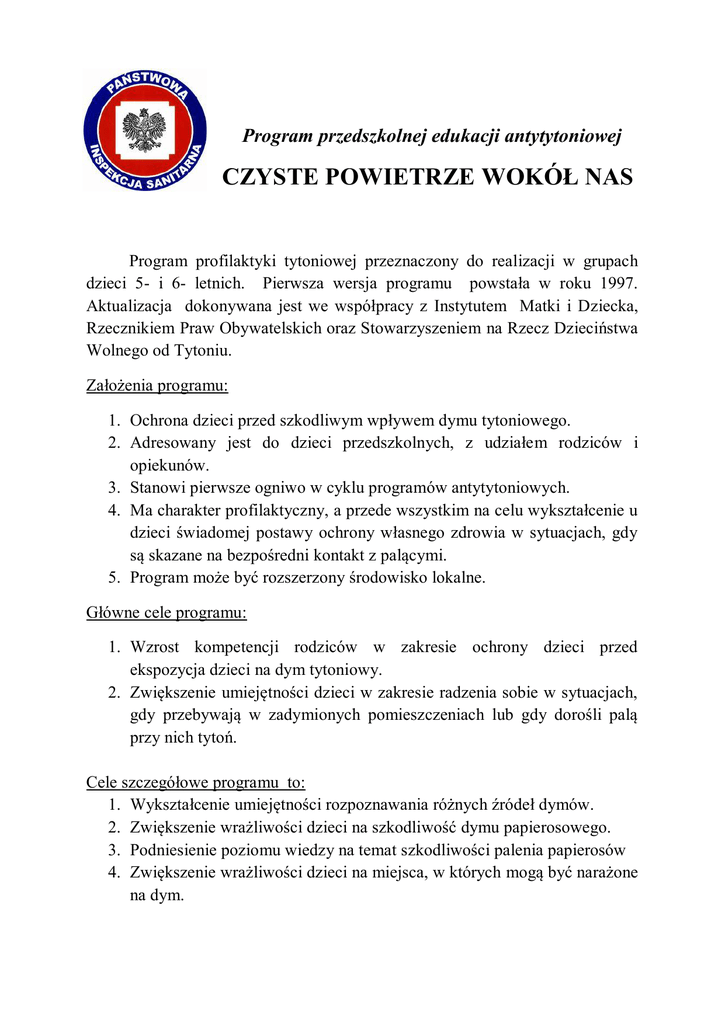 Program przedszkolnej edukacji antytytoniowej CZYSTE POWIETRZE WOKÓŁ NAS Program profilaktyki tytoniowej przeznaczony do realizacji w grupach dzieci 5- i 6- letnich. Pierwsza wersja programu powstała w roku 1997. Aktualizacja dokonywana jest we współpracy z Instytutem Matki i Dziecka, Rzecznikiem Praw Obywatelskich oraz Stowarzyszeniem na Rzecz Dzieciństwa Wolnego od Tytoniu. Założenia programu: 1. Ochrona dzieci przed szkodliwym wpływem dymu tytoniowego. 2. Adresowany jest do dzieci przedszkolnych, z udziałem rodziców i opiekunów. 3. Stanowi pierwsze ogniwo w cyklu programów antytytoniowych. 4. Ma charakter profilaktyczny, a przede wszystkim na celu wykształcenie u dzieci świadomej postawy ochrony własnego zdrowia w sytuacjach, gdy są skazane na bezpośredni kontakt z palącymi. 5. Program może być rozszerzony środowisko lokalne. Główne cele programu: 1. Wzrost kompetencji rodziców w zakresie ochrony dzieci przed ekspozycja dzieci na dym tytoniowy. 2. Zwiększenie umiejętności dzieci w zakresie radzenia sobie w sytuacjach, gdy przebywają w zadymionych pomieszczeniach lub gdy dorośli palą przy nich tytoń. Cele szczegółowe programu to: 1. Wykształcenie umiejętności rozpoznawania różnych źródeł dymów. 2. Zwiększenie wrażliwości dzieci na szkodliwość dymu papierosowego. 3. Podniesienie poziomu wiedzy na temat szkodliwości palenia papierosów 4. Zwiększenie wrażliwości dzieci na miejsca, w których mogą być narażone na dym. Program składa się z pięciu zajęć warsztatowych: I. Wycieczka (źródła dymów) II. Co i dlaczego dymi? III. Jak się czuję, kiedy dymi papieros? IV. Co się dzieje, gdy ludzie palą papierosy? V. Jak unikać dymu papierosowego? Poszczególne zajęcia skoncentrowane są na odbiorze wrażeń poprzez oddziaływanie na wiele zmysłów dzieci oraz dostosowane do rozwoju poznawczego, aktywności, doświadczeń i potrzeb dziecka.