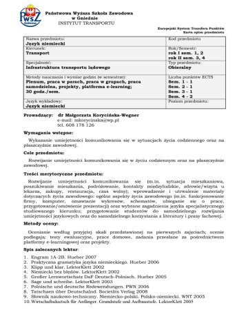 Państwowa Wyższa Szkoła Zawodowa w Gnieźnie INSTYTUT TRANSPORTU Europejski System Transferu Punktów Karta opisu przedmiotu Nazwa przedmiotu: Kod przedmiotu Język niemiecki Kierunek: Rok/Semestr: Transport rok I sem. 1, 2 rok II sem. 3, 4 Specjalność: Typ przedmiotu: Infrastruktura transportu lądowego Obieralny Metody nauczania i wymiar godzin (w semestrze): Liczba punktów ECTS Plenum, praca w parach, praca w grupach, praca samodzielna, projekty, platforma e-learning; 30 godz./sem. Sem. Sem. Sem. Sem. Język wykładowy: Poziom przedmiotu: 1 2 3 4 - 1 1 1 2 Język niemiecki Prowadzący: dr Małgorzata Korycińska-Wegner e-mail: [email protected] tel. 608 178 126 Wymagania wstępne: Wykazanie umiejętności komunikowania się w sytuacjach życia codziennego oraz na płaszczyźnie zawodowej. Cele przedmiotu: Rozwijanie umiejętności komunikowania się w życiu codziennym oraz na płaszczyźnie zawodowej. Treści merytoryczne przedmiotu: Rozwijanie umiejętności komunikowania się (m.in. sytuacja mieszkaniowa, poszukiwanie mieszkania, podróżowanie, kontakty międzyludzkie, zdrowie/wizyta u lekarza, zakupy, restauracja, czas wolny); wprowadzenie i utrwalenie materiały dotyczących życia zawodowego: ogólne aspekty życia zawodowego (m.in. funkcjonowanie firmy, komputer, omawianie wykresów, schematów, ubieganie się o pracę, przygotowanie/omówienie prezentacji) oraz wybrane zagadnienia języka specjalistycznego studiowanego kierunku; przygotowanie studentów do samodzielnego rozwijania umiejętności językowych oraz do samodzielnego korzystania z literatury i prasy fachowej. Metody oceny: Ocenianie według przyjętej skali przedstawionej na pierwszych zajęciach; ocenie podlegają: testy ewaluacyjne, prace domowe, zadania przesłane za pośrednictwem platformy e-learningowej oraz projekty. Spis zalecanych lektur: 1. Engram 1A-2B. Hueber 2007 2. Praktyczna gramatyka języka niemieckiego. Hueber 2006 3. Klipp und klar. LektorKlett 2002 4. Niemiecki bez błędów. LektorKlett 2002 5. Großer Lernwortschatz DaF Deutsch-Polnisch. Hueber 2005 6. Sage und schreibe. LektorKlett 2003 7. Polnische und deutsche Redewendungen. PWN 2006 8. Tatschaen über Deutschalnd. Societäts Verlag 2008 9. Słownik naukowo-techniczny. Niemiecko-polski. Polsko-niemiecki. WNT 2005 10. Wirtschaftsduetsch für Anfänger. Grundstufe und Aufbaustufe. LektorKlett 2005