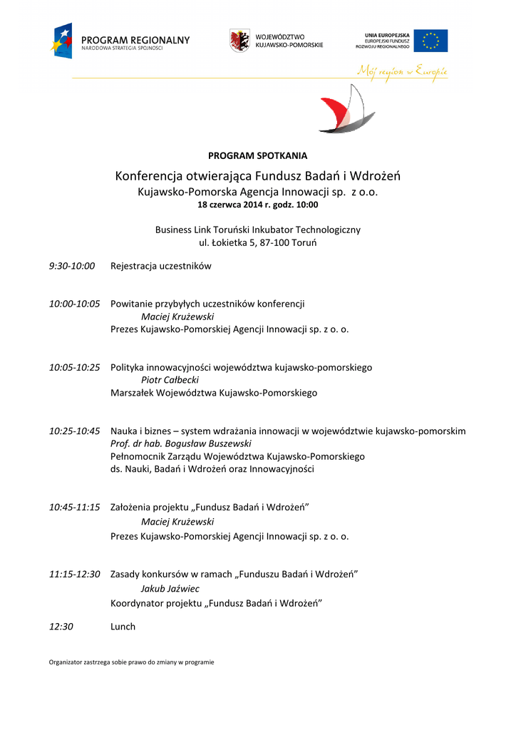 PROGRAM SPOTKANIA Konferencja otwierająca Fundusz Badań i Wdrożeń Kujawsko-Pomorska Agencja Innowacji sp. z o.o. 18 czerwca 2014 r. godz. 10:00 Business Link Toruński Inkubator Technologiczny ul. Łokietka 5, 87-100 Toruń 9:30-10:00 Rejestracja uczestników 10:00-10:05 Powitanie przybyłych uczestników konferencji Maciej Krużewski Prezes Kujawsko-Pomorskiej Agencji Innowacji sp. z o. o. 10:05-10:25 Polityka innowacyjności województwa kujawsko-pomorskiego Piotr Całbecki Marszałek Województwa Kujawsko-Pomorskiego 10:25-10:45 Nauka i biznes – system wdrażania innowacji w województwie kujawsko-pomorskim Prof. dr hab. Bogusław Buszewski Pełnomocnik Zarządu Województwa Kujawsko-Pomorskiego ds. Nauki, Badań i Wdrożeń oraz Innowacyjności 10:45-11:15 Założenia projektu „Fundusz Badań i Wdrożeń” Maciej Krużewski Prezes Kujawsko-Pomorskiej Agencji Innowacji sp. z o. o. 11:15-12:30 Zasady konkursów w ramach „Funduszu Badań i Wdrożeń” Jakub Jaźwiec Koordynator projektu „Fundusz Badań i Wdrożeń” 12:30 Lunch Organizator zastrzega sobie prawo do zmiany w programie
