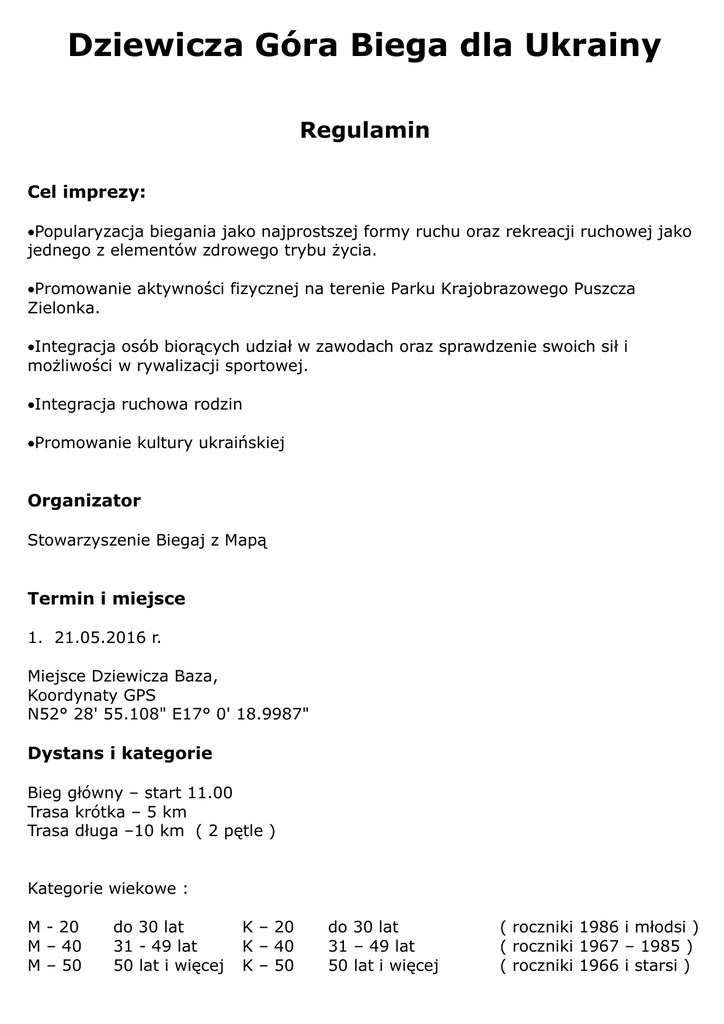 Dziewicza Góra Biega dla Ukrainy Regulamin Cel imprezy: Popularyzacja biegania jako najprostszej formy ruchu oraz rekreacji ruchowej jako jednego z elementów zdrowego trybu życia. Promowanie aktywności fizycznej na terenie Parku Krajobrazowego Puszcza Zielonka. Integracja osób biorących udział w zawodach oraz sprawdzenie swoich sił i możliwości w rywalizacji sportowej. Integracja ruchowa rodzin Promowanie kultury ukraińskiej Organizator Stowarzyszenie Biegaj z Mapą Termin i miejsce 1. 21.05.2016 r. Miejsce Dziewicza Baza, Koordynaty GPS N52° 28' 55.108" E17° 0' 18.9987" Dystans i kategorie Bieg główny – start 11.00 Trasa krótka – 5 km Trasa długa –10 km ( 2 pętle ) Kategorie wiekowe : M - 20 M – 40 M – 50 do 30 lat 31 - 49 lat 50 lat i więcej K – 20 K – 40 K – 50 do 30 lat 31 – 49 lat 50 lat i więcej ( roczniki 1986 i młodsi ) ( roczniki 1967 – 1985 ) ( roczniki 1966 i starsi ) Nordic Walking K i M Dodatkowo przed biegiem głównym będą odbywały się biegi dziecięce Roczniki 2012 i młodsi – trasa 200 m start 9:15 Roczniki 2011 – 2008 – trasa 500 m start 9.30 Roczniki 2007 – 2004 – trasa 1000 m start 9.45 Roczniki 2003 – 2000 – trasa 1500 m start 10.00 Trasa Trasa prowadzi drogami leśnymi ( możliwość biegu w kolcach ), bardzo wymagająca z licznymi podbiegami, trasa nie posiada atestu. Trasa w terenie oznaczona co kilometr. Biuro zawodów Czynne w dniu zawodów w godzinach 8.30 – 10.45 w centrum zawodów Zgłoszenia i opłata startowa Istnieją dwie możliwości zgłoszenia: 1) Wcześniejsze, tańsze wpisowe online: Należy zgłosić się poprzez formularz zgłoszeniowy na stronie www.dziewiczagorabiega.pl oraz przelać opłatę startową na konto 11 1090 1447 0000 0001 2216 3207 maksymalnie do środy (włącznie) poprzedzającej dany bieg. Osoba która do środy nie uiści opłaty startowej, jest zobowiązana do opłacenia wyższej kwoty. W przypadku opłaty startowej na konto w piątek przed biegiem, prosimy o przesłanie potwierdzenia wpłaty. 2) W biurze zawodów w dniu imprezy: wystarczy przyjść na miejsce, zapisać się w biurze zawodów i wnieść opłatę startową. Wpisowe dla zapisanych w ten sposób jest droższe o 10zł. W razie problemów ze zgłoszeniem prosimy o kontakt na [email protected] Dane do przelewu Nr konta 11 1090 1447 0000 0001 2216 3207 Biegaj z Mapą Ul. Wilczak 4/17 61-623 Poznań Z dopiskiem – Dziewicza Góra Biega Opłata startowa Opłata startowa online, w terminie – 20 zł Opłata startowa na miejscu lub po terminie na konto 30 zł Opłata startowa na biegi Dziecięce wynosi 5zł i jest płatna na miejscu. Zgłoszeń na biegi dziecięce dokonuje się również poprzez formularz zgłoszeniowy. Nagrody Po biegu zostanie przeprowadzona dekoracja najlepszych zawodników w kategoriach wiekowych. Nagradzamy 3 najlepsze osoby w kategoriach wiekowych na trasie długiej i krótkiej. Dla każdego zawodnika który ukończy bieg przewidziano pamiątkowy medal, napój i słodką przekąskę. Postanowienia końcowe Uczestnik zawodów wyraża zgodę na przetwarzanie swoich danych osobowych zgodnie z ustawą z dnia 29 sierpnia 1997r. o ochronie danych osobowych (tekst jednolity: Dz. U. 2002 r. Nr 101 poz. 926, ze zm.) oraz wizerunku i zdjęć dla potrzeb związanych z organizacją i promocją imprezy. Uczestnik przyjmuje do wiadomości, że przysługuje mu prawo wglądu do treści swoich danych oraz ich poprawiania. Uczestnik zawodów wyraża zgodę na otrzymywanie od organizatora informacji dotyczących naszych zawodów. Sprawy nie ujęte w niniejszym regulaminie oraz jego interpretacja należą do organizatora. Na zawodach będzie zapewniony elektroniczny pomiar czasu. Zawody odbędą się bez względu na pogodę. Uczestnicy ubezpieczają się we własnym zakresie i startują na własną odpowiedzialność. Osoby, które zrezygnują ze startu nie mogą ubiegać się o zwrot wpisowego, oraz przenosić opłaty startowej na innych uczestników. Niniejszy regulamin może ulec zmianie, o czym uczestnicy zostaną powiadomieni. Osoby niepełnoletnie mogą startować tylko za pisemną zgoda opiekunów prawnych. Organizator nie ponosi odpowiedzialności za rzeczy zgubione podczas imprezy i za szkody wyrządzone przez uczestników. Limit czasu na wszystkich trasach i we wszystkich kategoriach wiekowych wynosi 2h. Zgłoszenie się na bieg przez formularz zgłoszeniowy oraz zgłoszenie się na miejscu w centrum zawodów świadczy o akceptacji powyższego regulaminu. Protesty należy składać mailowo do 24 h po opublikowaniu wyników.
