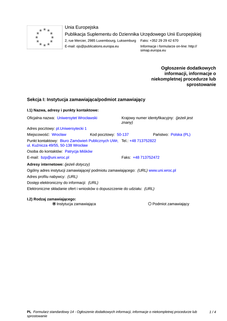 Unia Europejska Publikacja Suplementu do Dziennika Urzędowego Unii Europejskiej 2, rue Mercier, 2985 Luxembourg, Luksemburg Faks: +352 29 29 42 670 E-mail: [email protected] Informacje i formularze on-line: http:// simap.europa.eu Ogłoszenie dodatkowych informacji, informacje o niekompletnej procedurze lub sprostowanie Sekcja I: Instytucja zamawiająca/podmiot zamawiający I.1) Nazwa, adresy i punkty kontaktowe: Oficjalna nazwa: Uniwersytet Wrocławski Krajowy numer identyfikacyjny: (jeżeli jest znany) _____ Adres pocztowy: pl.Uniwersytecki 1 Miejscowość: Wrocław Kod pocztowy: 50-137 Państwo: Polska (PL) Punkt kontaktowy: Biuro Zamówień Publicznych UWr, Tel.: +48 713752822 ul. Kuźnicza 49/55, 50-138 Wrocław Osoba do kontaktów: Patrycja Miśków E-mail: [email protected] Faks: +48 713752472 Adresy internetowe: (jeżeli dotyczy) Ogólny adres instytucji zamawiającej/ podmiotu zamawiającego: (URL) www.uni.wroc.pl Adres profilu nabywcy: (URL) _____ Dostęp elektroniczny do informacji: (URL) _____ Elektroniczne składanie ofert i wniosków o dopuszczenie do udziału: (URL) _____ I.2) Rodzaj zamawiającego: Instytucja zamawiająca Podmiot zamawiający PL Formularz standardowy 14 - Ogłoszenie dodatkowych informacji, informacje o niekompletnej procedurze lub sprostowanie 1/4 Sekcja II: Przedmiot zamówienia II.1.1) Nazwa nadana zamówieniu: Dostawa i montaż mebli do budynku Kompleksu Edukacyjno-Badawczego Biotechnologii UWr we Wrocławiu przy ul. F. Joliot-Curie 14a - 3 zadania II.1.2) Krótki opis zamówienia lub zakupu: (podano w pierwotnym ogłoszeniu) Przedmiotem zamówienia jest dostawa i montaż mebli do pomieszczeń budynku Kompleksu Edukacyjno Badawczego Biotechnologii Uniwersytetu Wrocławskiego we Wrocławiu, przy ul. Joliot-Curie 14a. Zamówienie obejmuje 3 zadania: Zadanie 1 – System szaf rozsuwanych Zadanie 2 – Wyposażenie pomieszczeń dziekanatu, gabinetów dziekana, prodziekana, sekretariat dziekanów, gabinet pełnomocnika finansowo-administracyjnego oraz biura administracji Zadanie 3 – Szafki laminowane podwieszane „400” (148 szt) oraz stół laboratoryjny w kształcie L z nadstawką Szczegółowy opis przedmiotu zamówienia zawiera: Opis przedmiotu zamówienia z rysunkami – - Załącznik nr 6a do SIWZ – dla zadania 1 - Załącznik nr 6b do SIWZ – dla zadania 2 - Załącznik nr 6c do SIWZ – dla zadania 3 Szczegółowe warunki i zasady realizacji zamówienia określają wzory umów stanowiące załączniki do SIWZ: - nr 7a – dla zadania 1 - nr 7b – dla zadania 2 - nr 7c – dla zadania 3. II.1.3) Wspólny Słownik Zamówień (CPV) Główny przedmiot Dodatkowe przedmioty Słownik główny 39100000 51000000 Słownik uzupełniający (jeżeli dotyczy) PL Formularz standardowy 14 - Ogłoszenie dodatkowych informacji, informacje o niekompletnej procedurze lub sprostowanie 2/4 Sekcja IV: Procedura IV.1)Rodzaj procedury (podano w pierwotnym ogłoszeniu) Otwarta Ograniczona Ograniczona przyspieszona Negocjacyjna Negocjacyjna przyspieszona Dialog konkurencyjny Negocjacyjna z uprzednim ogłoszeniem Negocjacyjna bez uprzedniego ogłoszenia Negocjacyjna z publikacją ogłoszenia o zamówieniu Negocjacyjna bez publikacji ogłoszenia o zamówieniu Udzielenie zamówienia bez uprzedniej publikacji ogłoszenia o zamówieniu w Dzienniku Urzędowym Unii Europejskiej IV.2)Informacje administracyjne IV.2.1)Numer referencyjny: (podano w pierwotnym ogłoszeniu) BZP.2420.19.2013.PM IV.2.2)Dane referencyjne ogłoszenia w przypadku ogłoszeń przesłanych drogą elektroniczną: Pierwotne ogłoszenie przesłane przez eNotices TED eSender Login: ENOTICES_UWr Dane referencyjne ogłoszenia: 2013-102339 rok i numer dokumentu IV.2.3)Ogłoszenie, którego dotyczy niniejsza publikacja: Numer ogłoszenia w Dz.U.: 2013/S 147-255237 z dnia: 31/07/2013 (dd/mm/rrrr) IV.2.4)Data wysłania pierwotnego ogłoszenia: 26/07/2013 (dd/mm/rrrr) PL Formularz standardowy 14 - Ogłoszenie dodatkowych informacji, informacje o niekompletnej procedurze lub sprostowanie 3/4 Sekcja VI: Informacje uzupełniające VI.1) Ogłoszenie dotyczy: Procedury niepełnej Sprostowania Informacji dodatkowych VI.2) Informacje na temat niepełnej procedury udzielenia zamówienia: Postępowanie o udzielenie zamówienia zostało przerwane Postępowanie o udzielenie zamówienia uznano za nieskuteczne Zamówienia nie udzielono Zamówienie może być przedmiotem ponownej publikacji VI.3) Informacje do poprawienia lub dodania : VI.3.1) Zmiana oryginalnej informacji podanej przez instytucję zamawiającą Publikacja w witrynie TED niezgodna z oryginalną informacją, przekazaną przez instytucję zamawiającą Oba przypadki VI.3.2) W ogłoszeniu pierwotnym W odpowiedniej dokumentacji przetargowej (więcej informacji w odpowiedniej dokumentacji przetargowej) W obu przypadkach (więcej informacji w odpowiedniej dokumentacji przetargowej) VI.3.3) Tekst, który należy poprawić w pierwotnym ogłoszeniu Miejsce, w którym znajduje się Zamiast: zmieniany tekst: Powinno być: VI.3.4) Daty, które należy poprawić w pierwotnym ogłoszeniu Miejsce, w którym znajdują się Zamiast: zmieniane daty: 18/09/2013 Godzina: 10:00 IV.3.4 (dd/mm/rrrr) Powinno być: 20/09/2013 Godzina: 10:00 (dd/mm/rrrr) Miejsce, w którym znajdują się zmieniane daty: IV.3.8 Powinno być: 20/09/2013 Godzina: 11:00 (dd/mm/rrrr) Zamiast: 18/09/2013 Godzina: 11:00 (dd/mm/rrrr) VI.3.5) Adresy i punkty kontaktowe, które należy poprawić VI.3.6) Tekst, który należy dodać do pierwotnego ogłoszenia Miejsce, w którym należy dodać tekst: Tekst do dodania: VI.4) Inne dodatkowe informacje: _____ VI.5) Data wysłania niniejszego ogłoszenia: 03/09/2013 (dd/mm/rrrr) - ID:2013-118690 PL Formularz standardowy 14 - Ogłoszenie dodatkowych informacji, informacje o niekompletnej procedurze lub sprostowanie 4/4