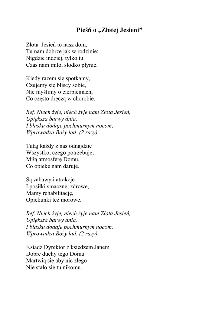 Pieśń o „Złotej Jesieni” Złota Jesień to nasz dom, Tu nam dobrze jak w rodzinie; Nigdzie indziej, tylko tu Czas nam miło, słodko płynie. Kiedy razem się spotkamy, Czujemy się bliscy sobie, Nie myślimy o cierpieniach, Co często dręczą w chorobie. Ref. Niech żyje, niech żyje nam Złota Jesień, Upiększa barwy dnia, I blasku dodaje pochmurnym nocom, Wprowadza Boży ład. (2 razy) Tutaj każdy z nas odnajdzie Wszystko, czego potrzebuje; Miłą atmosferę Domu, Co opiekę nam daruje. Są zabawy i atrakcje I posiłki smaczne, zdrowe, Mamy rehabilitację, Opiekunki też morowe. Ref. Niech żyje, niech żyje nam Złota Jesień, Upiększa barwy dnia, I blasku dodaje pochmurnym nocom, Wprowadza Boży ład. (2 razy) Ksiądz Dyrektor z księdzem Janem Dobre duchy tego Domu Martwią się aby nic złego Nie stało się tu nikomu. Złota Jesień to nasz dom, Port bezpieczny w czasie burzy, By odpocząć kiedy już, Zmęczysz się w życia podróży. Ref. Niech żyje, niech żyje nam Złota Jesień, Upiększa barwy dnia, I blasku dodaje pochmurnym nocom, Wprowadza Boży ład. (2 razy) Niechaj żyją, niechaj żyją, niechaj żyją, Wszyscy, co tutaj są, Niechaj żyją, niechaj żyją, niechaj żyją I zawsze radośni są!